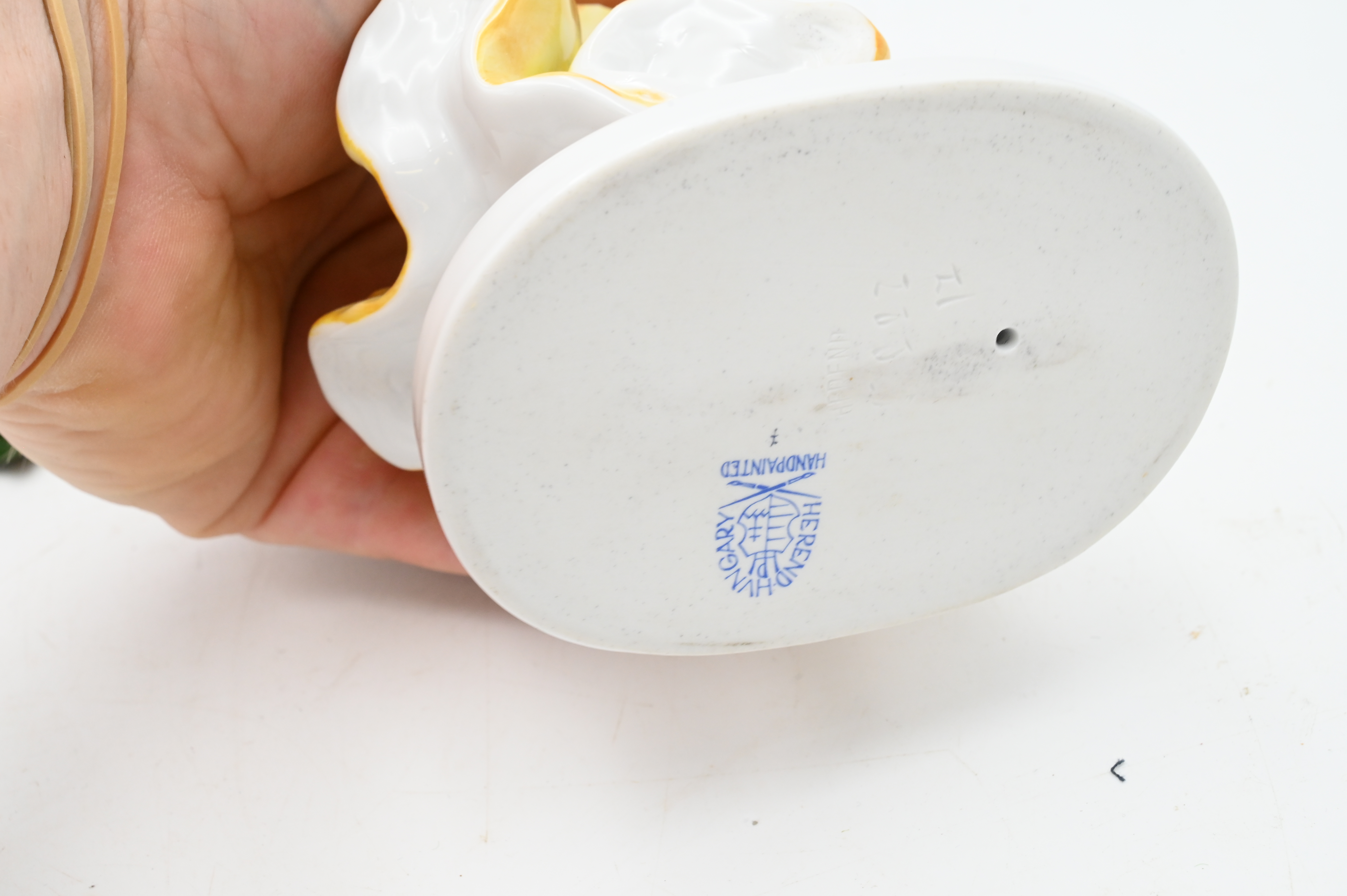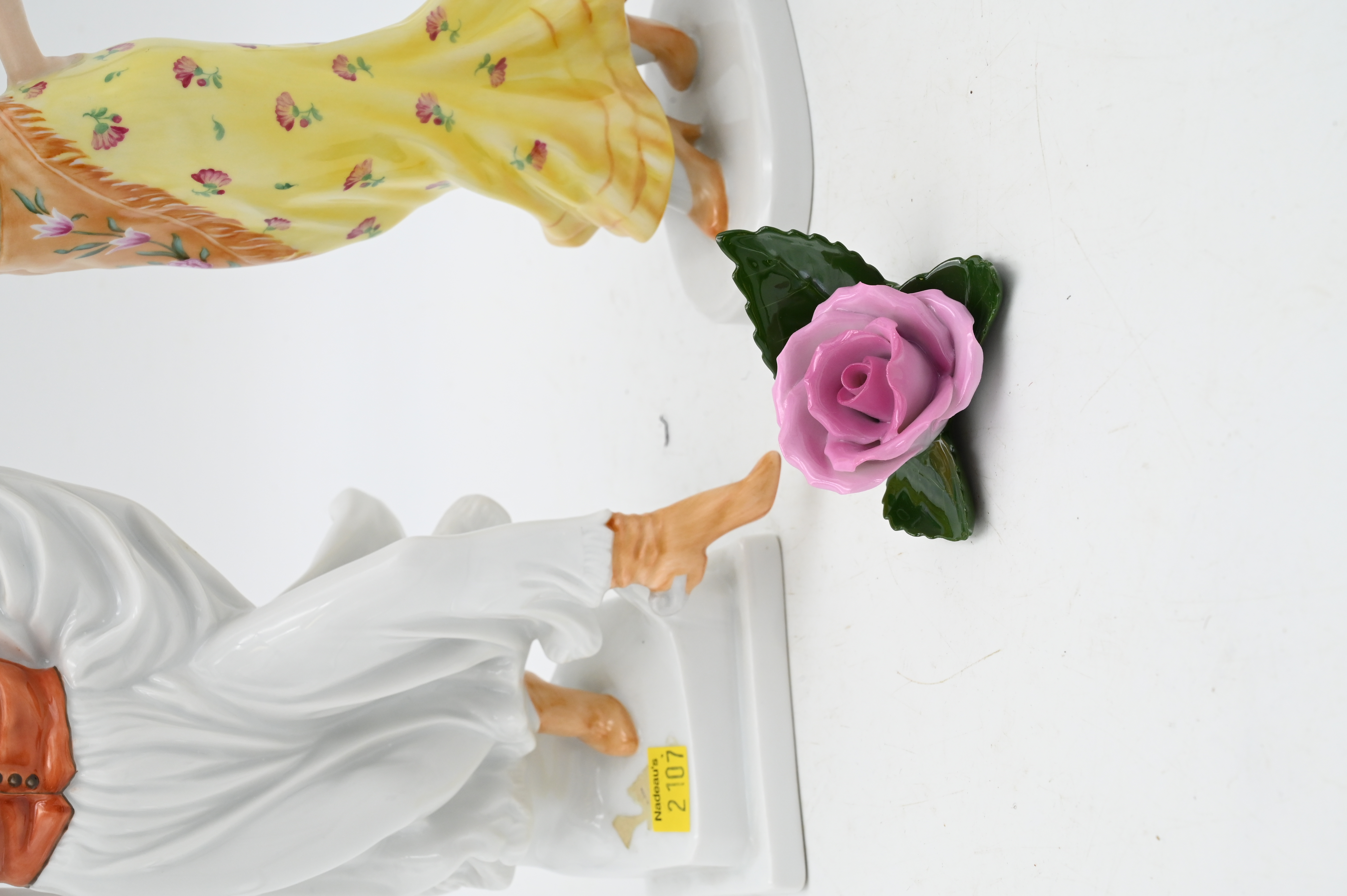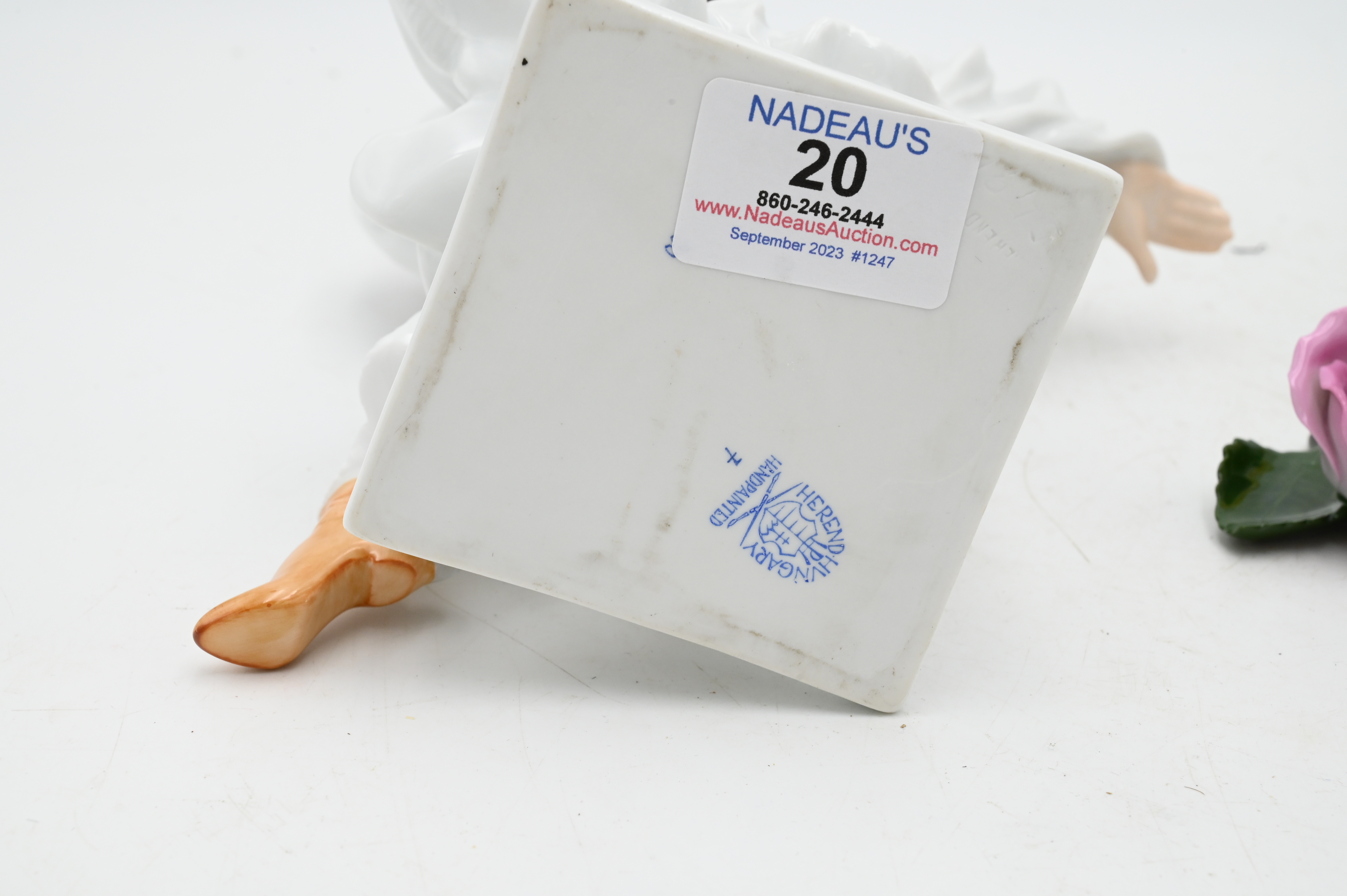 Three Herend Porcelain Pieces, to include male dancer with feathered hat, female dancer with yellow skirt, along with a hand painted rose, tallest height 11 1/2 inches.
