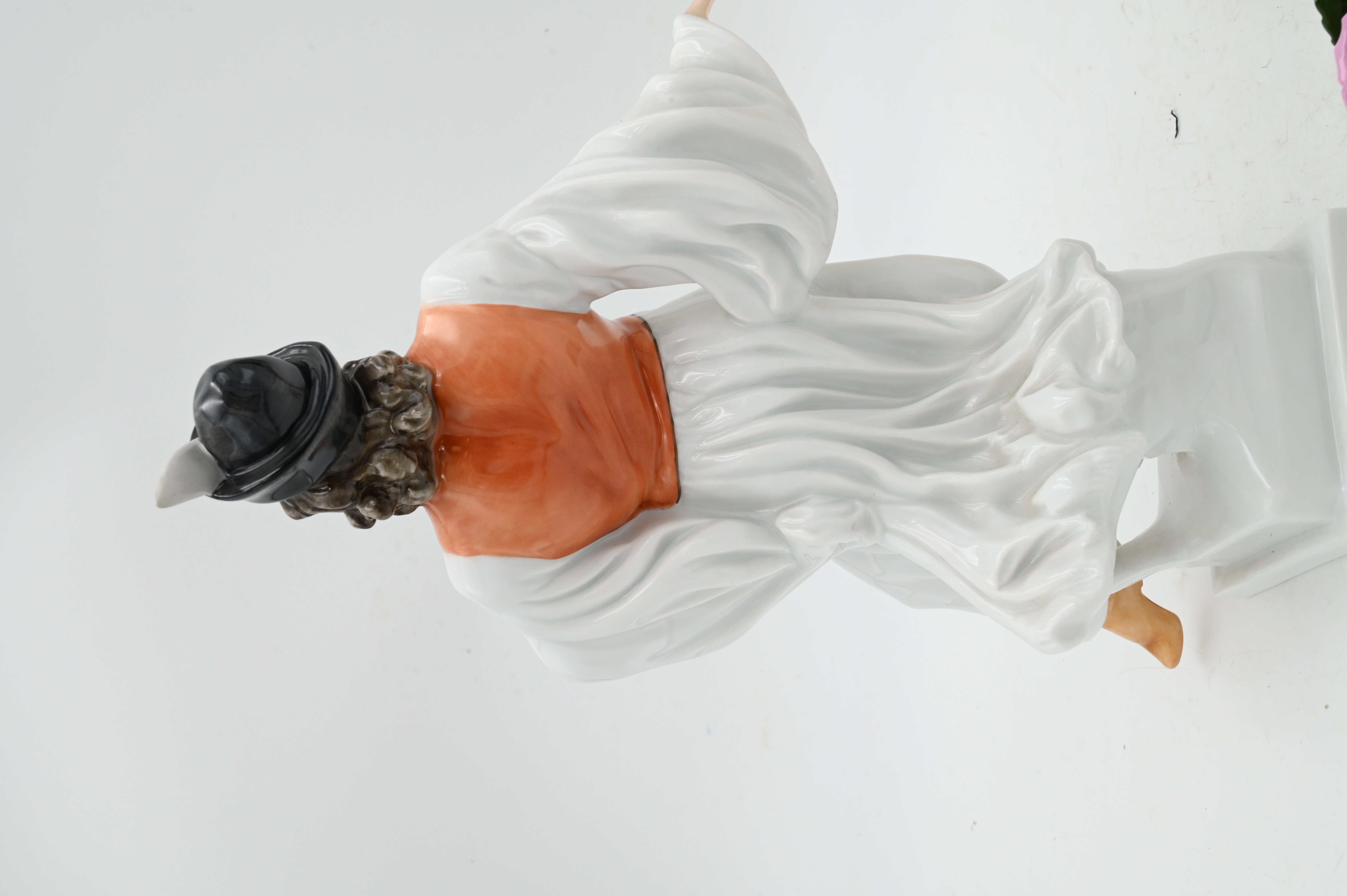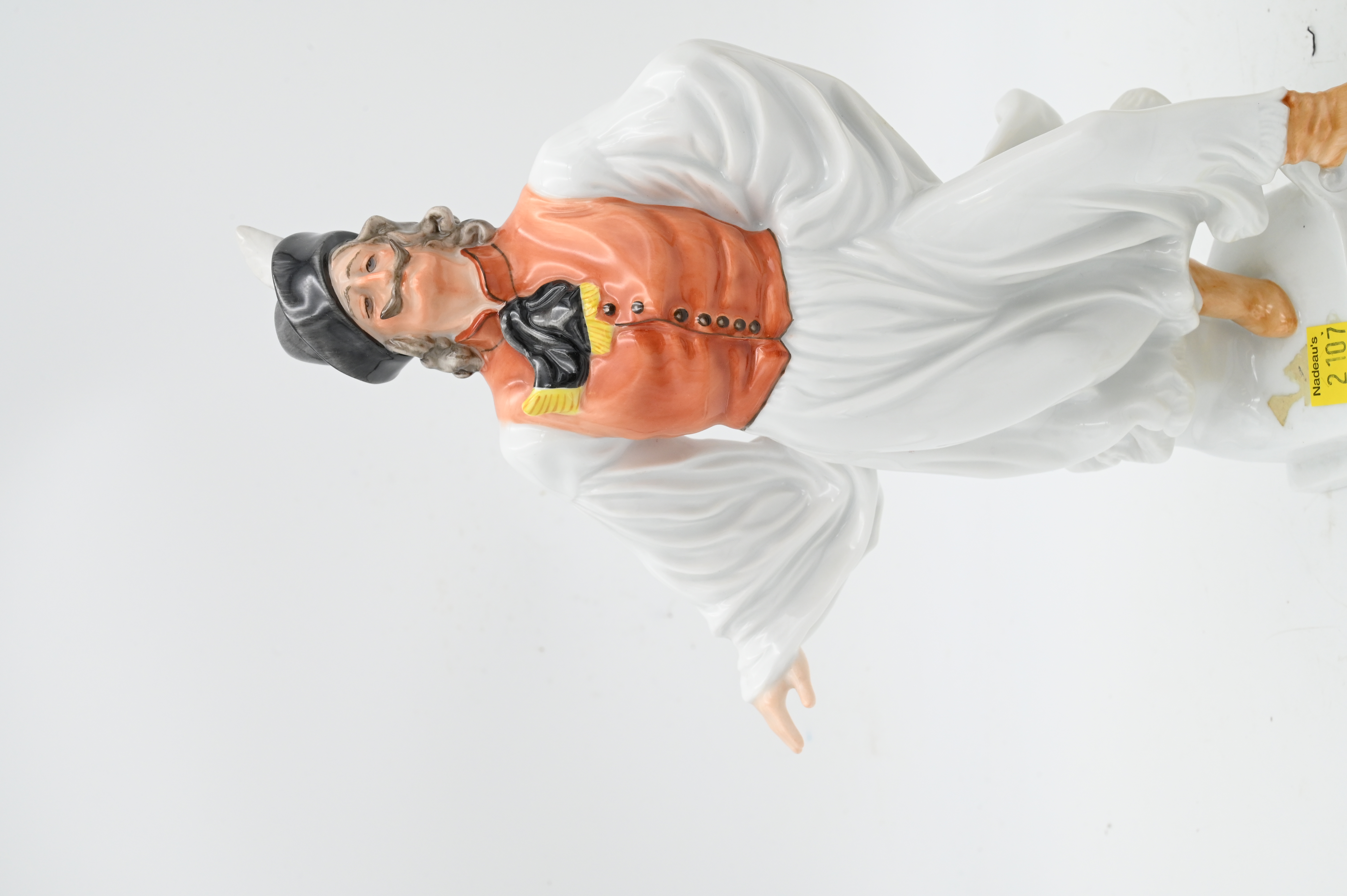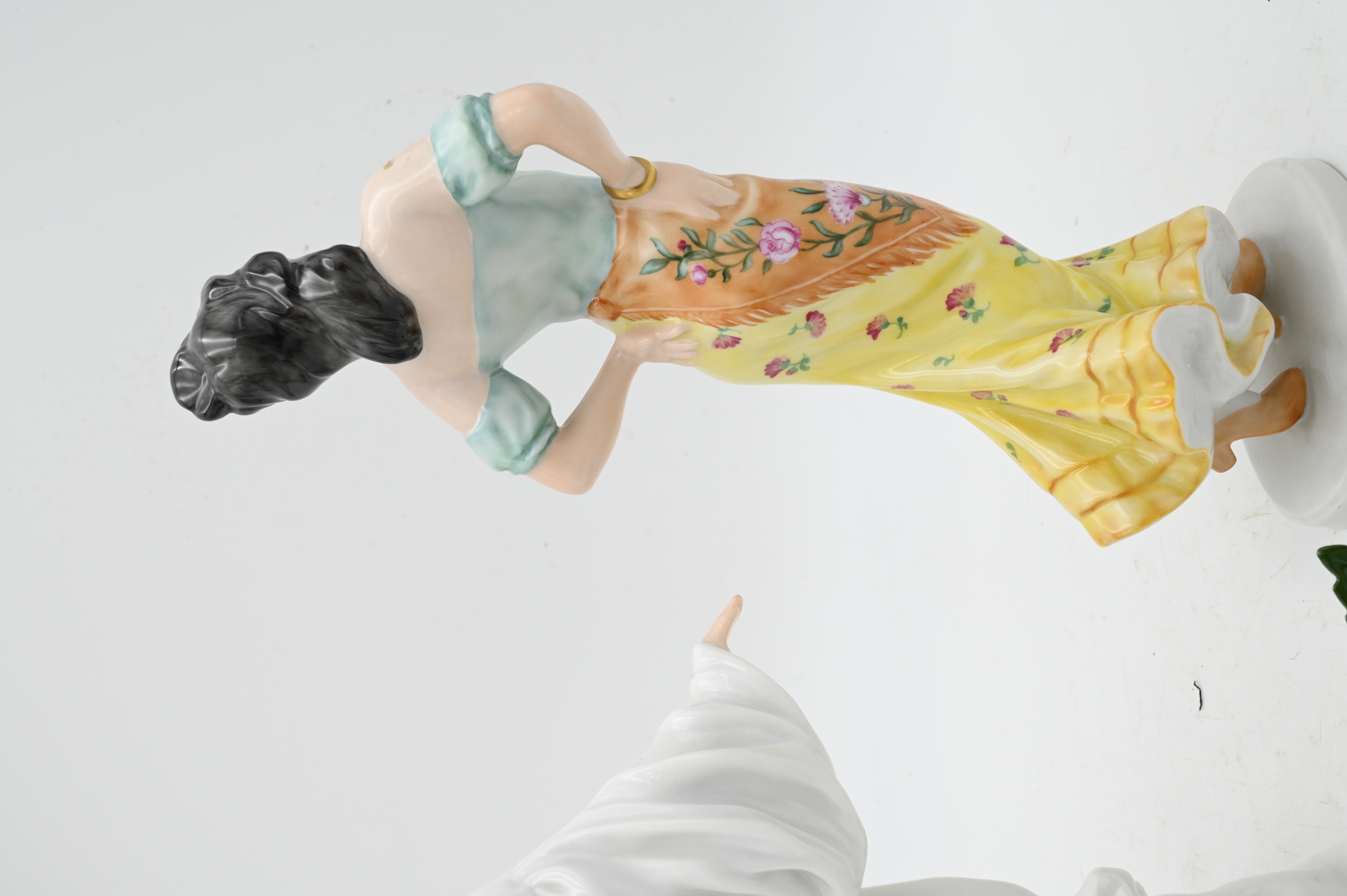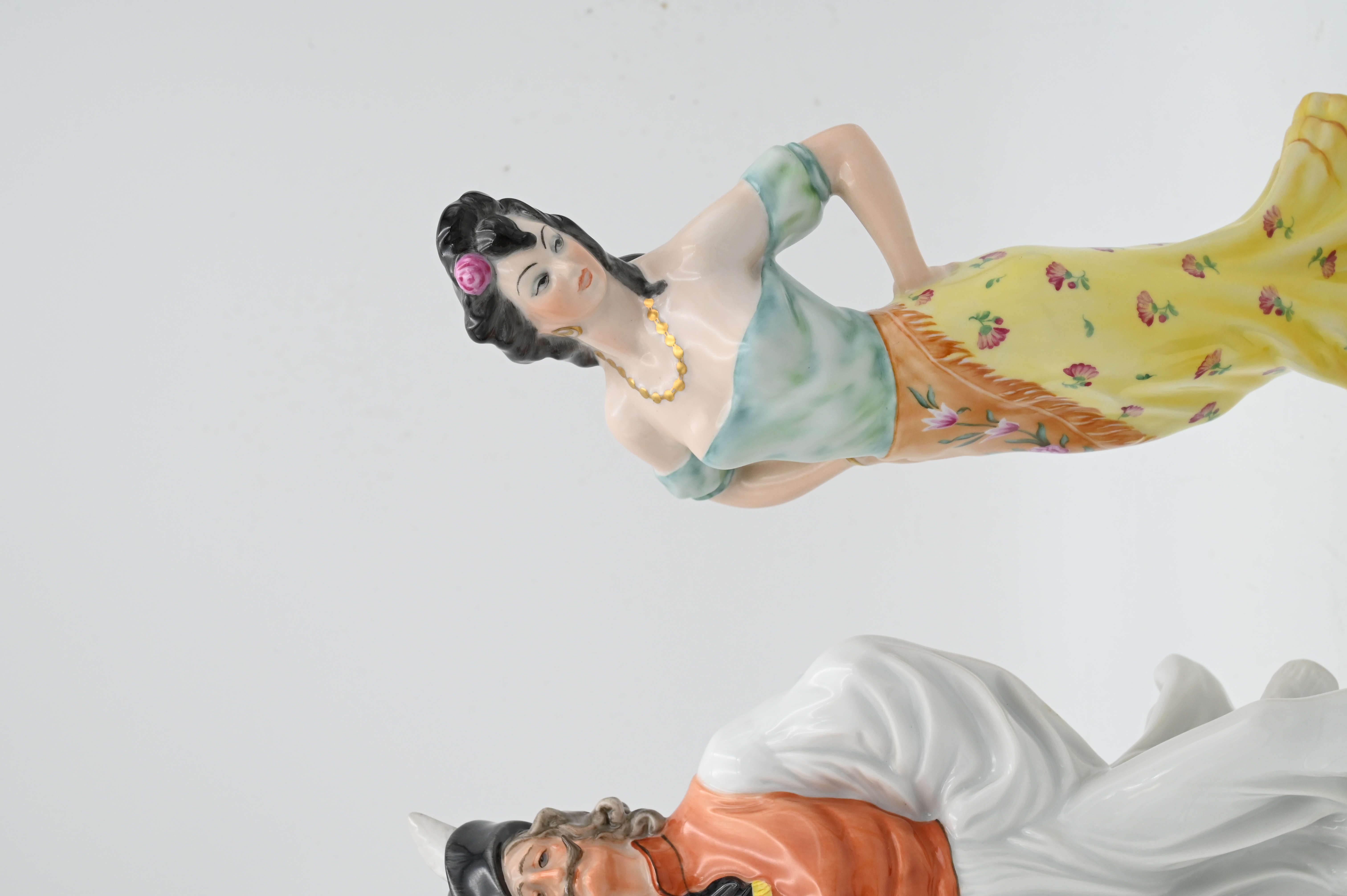 Three Herend Porcelain Pieces, to include male dancer with feathered hat, female dancer with yellow skirt, along with a hand painted rose, tallest height 11 1/2 inches.