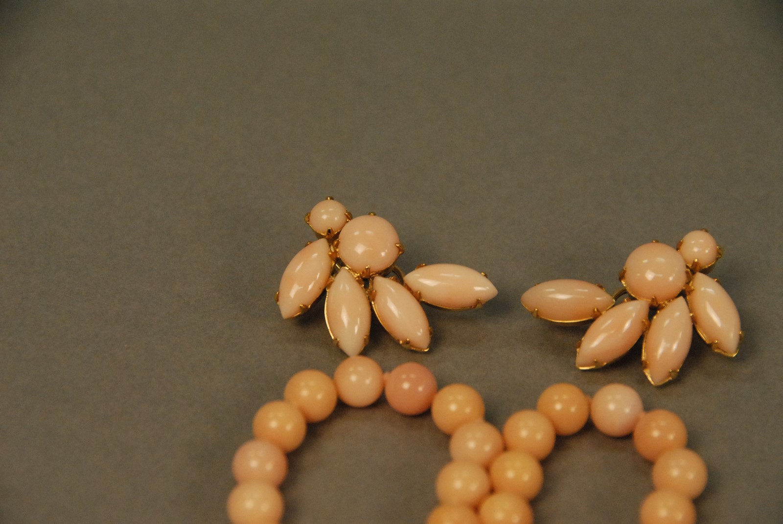 Three piece lot including pink coral bead necklace with 14K clasp and pair of earrings with clip fittings each mounted with 6 pieces of pink coral set in 14K gold. necklace: lg. 26 1/2 in. earrings: lg. 1 1/4 in. Provenance: Property from a Private Collection Sold for the Benefit of the Virginia Historical Society.