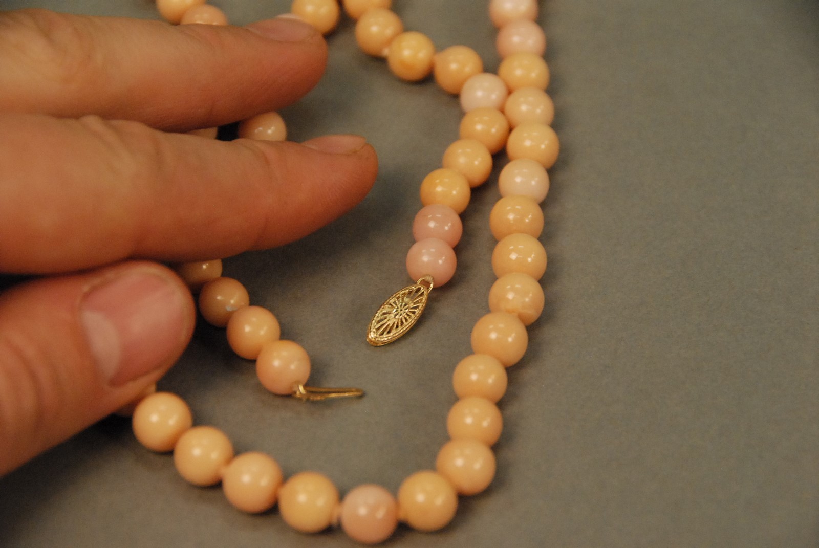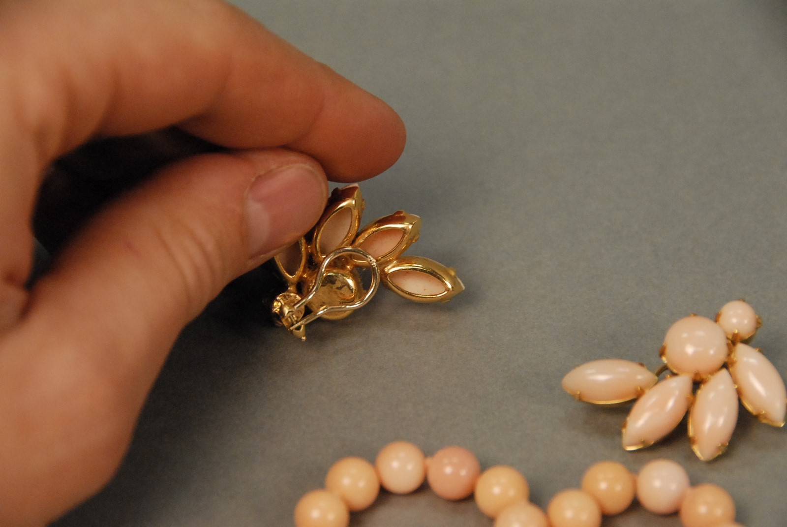 Lot 20: Three piece lot including pink coral bead necklace with 14K clasp and pair of earrings with clip fittings each mounted with 6 pieces of pink coral set in 14K gold. necklace: lg. 26 1/2 in. earrings: lg. 1 1/4 in. Provenance: Property from a P