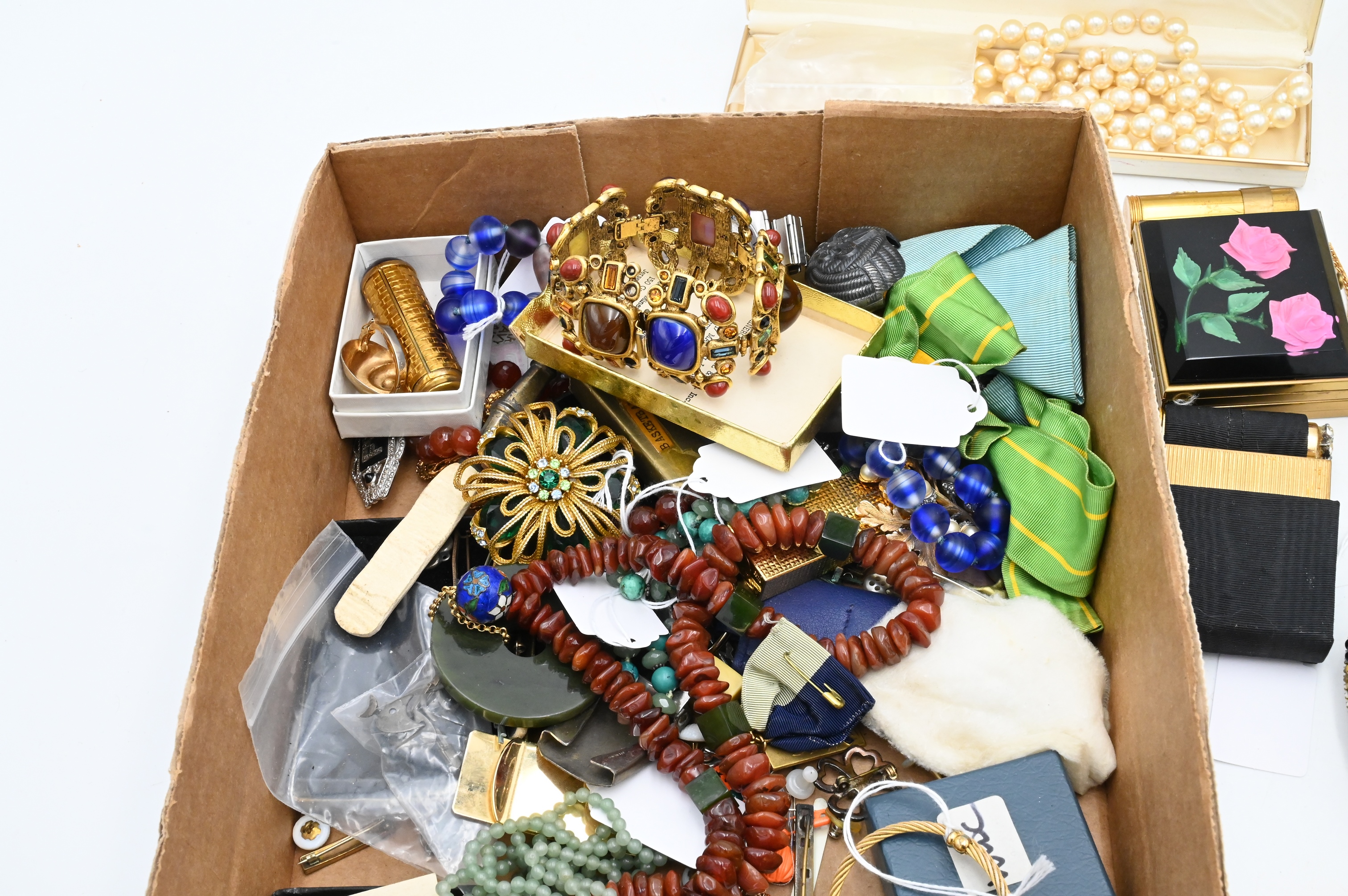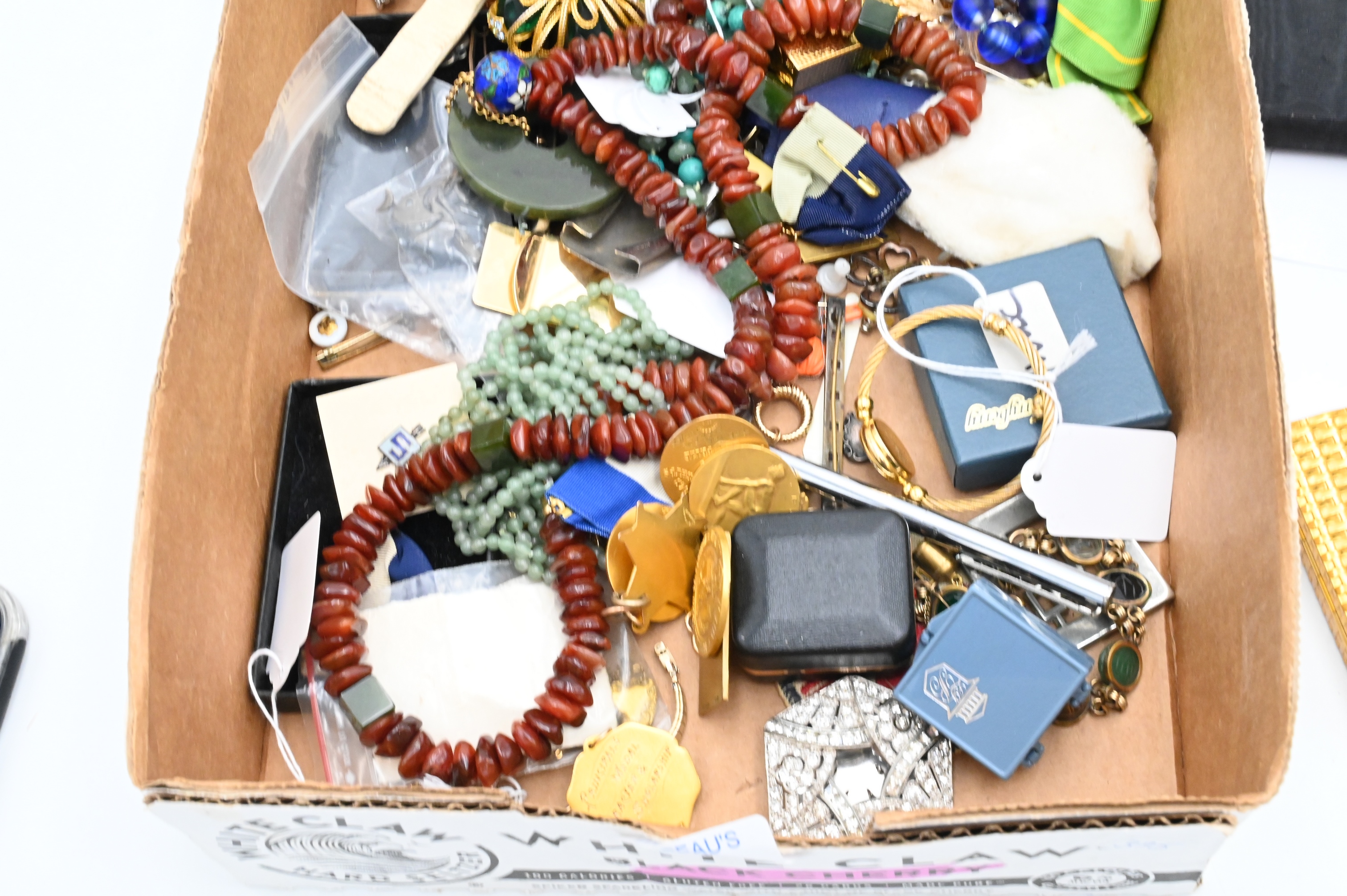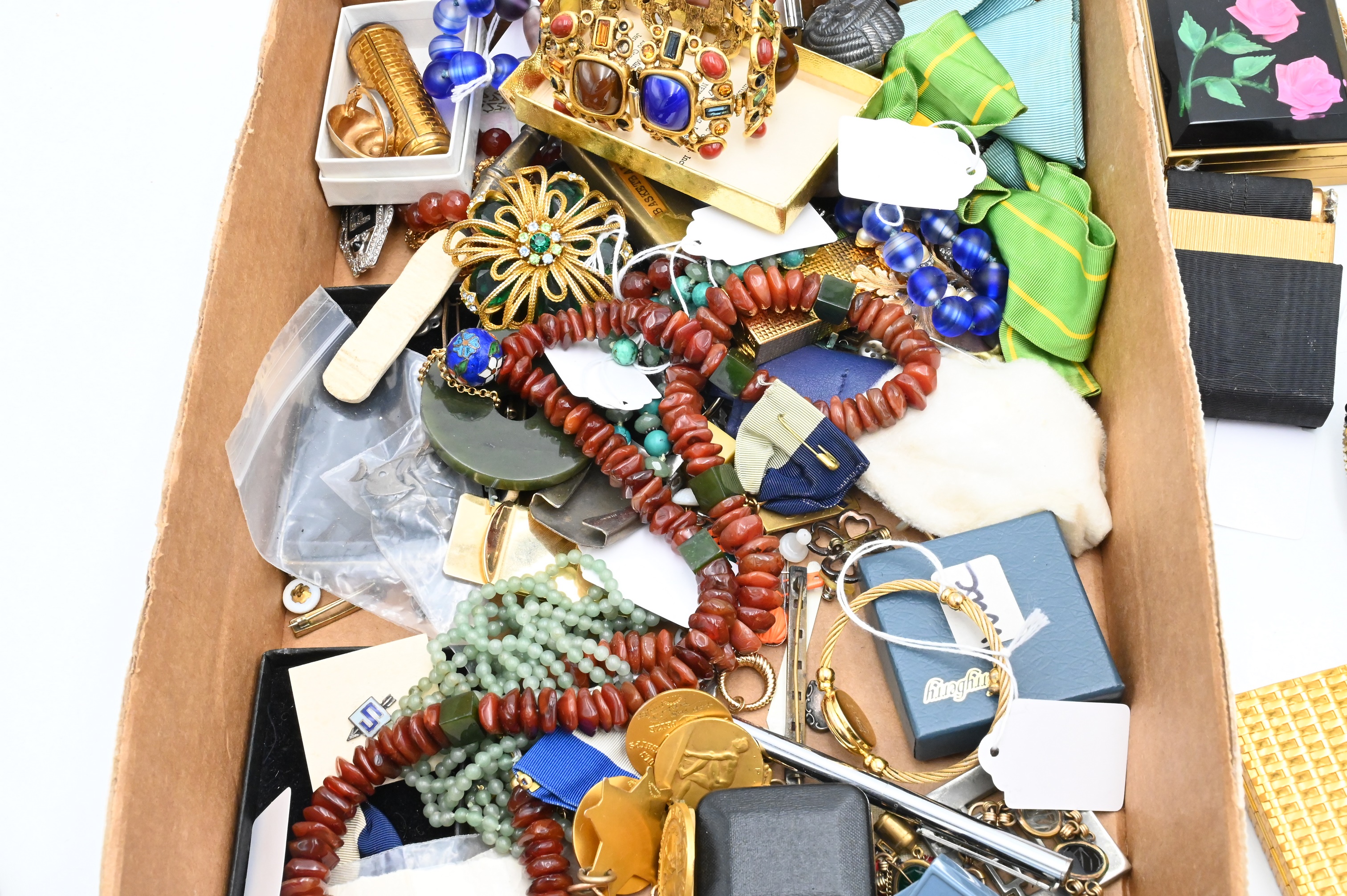 Tray Lot of Costume Jewelry, to include Jay Feinberg bracelet and clip earrings, Florenza brooch, jade necklace pendant, watches, etcetera…