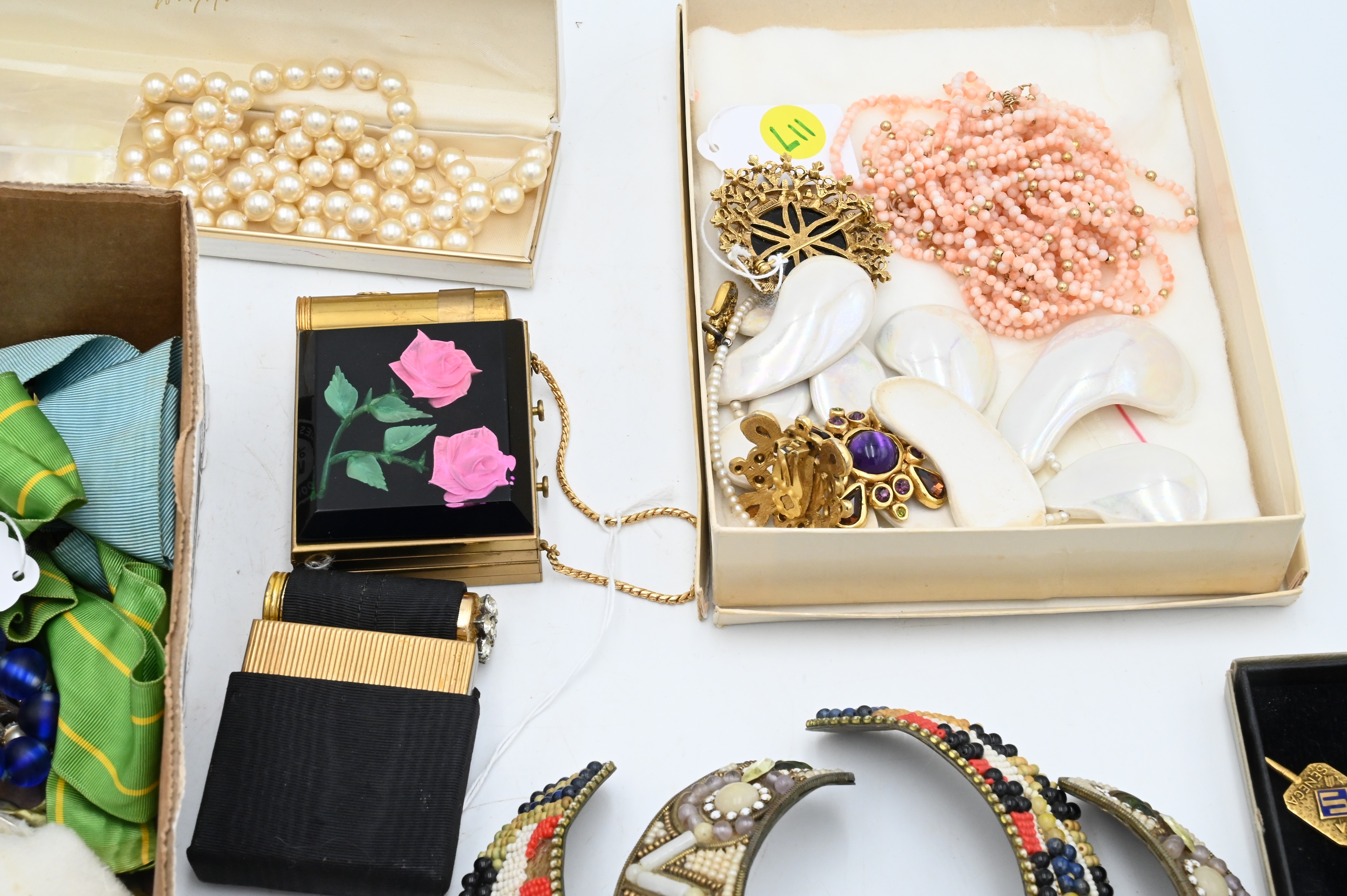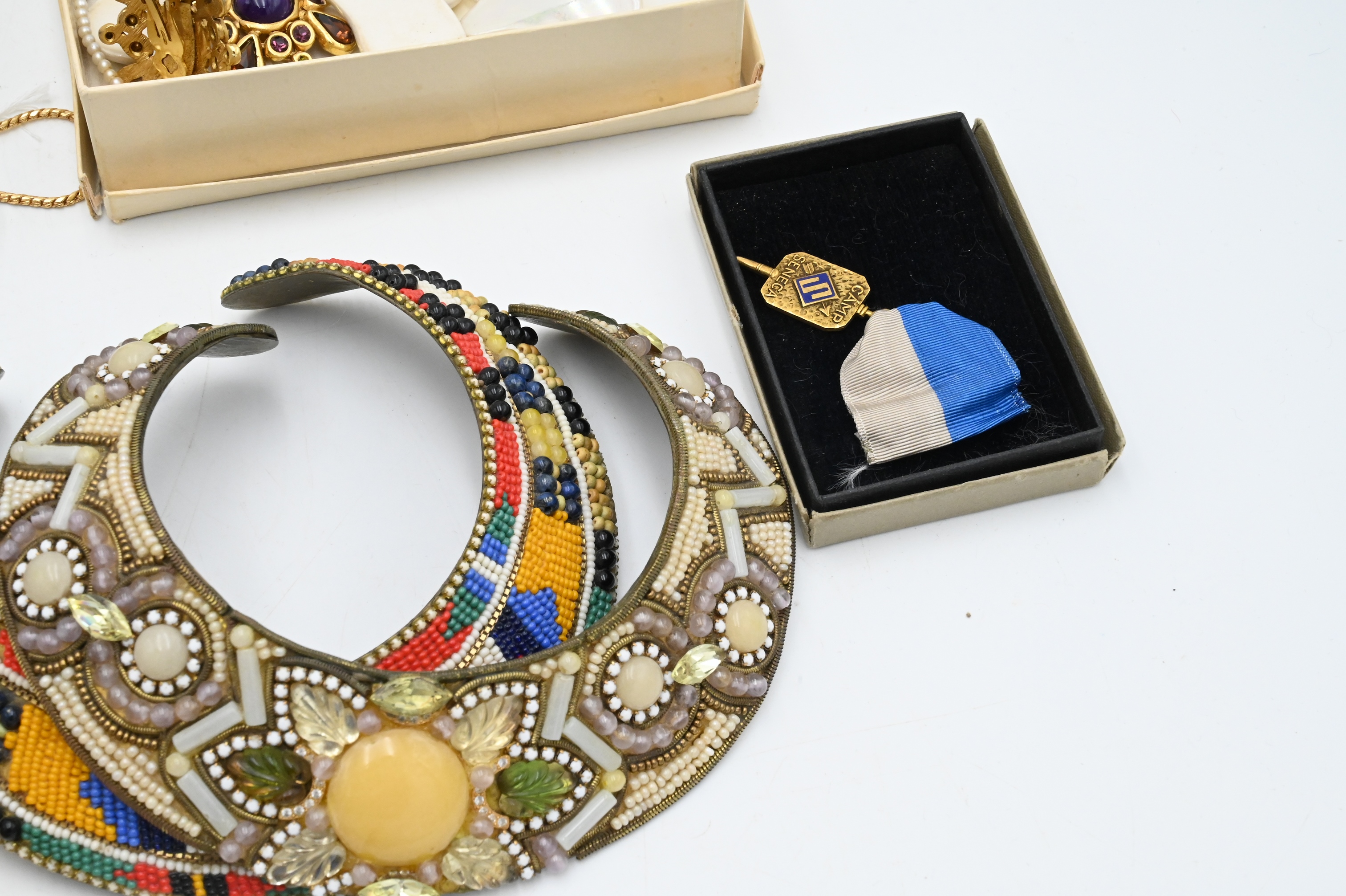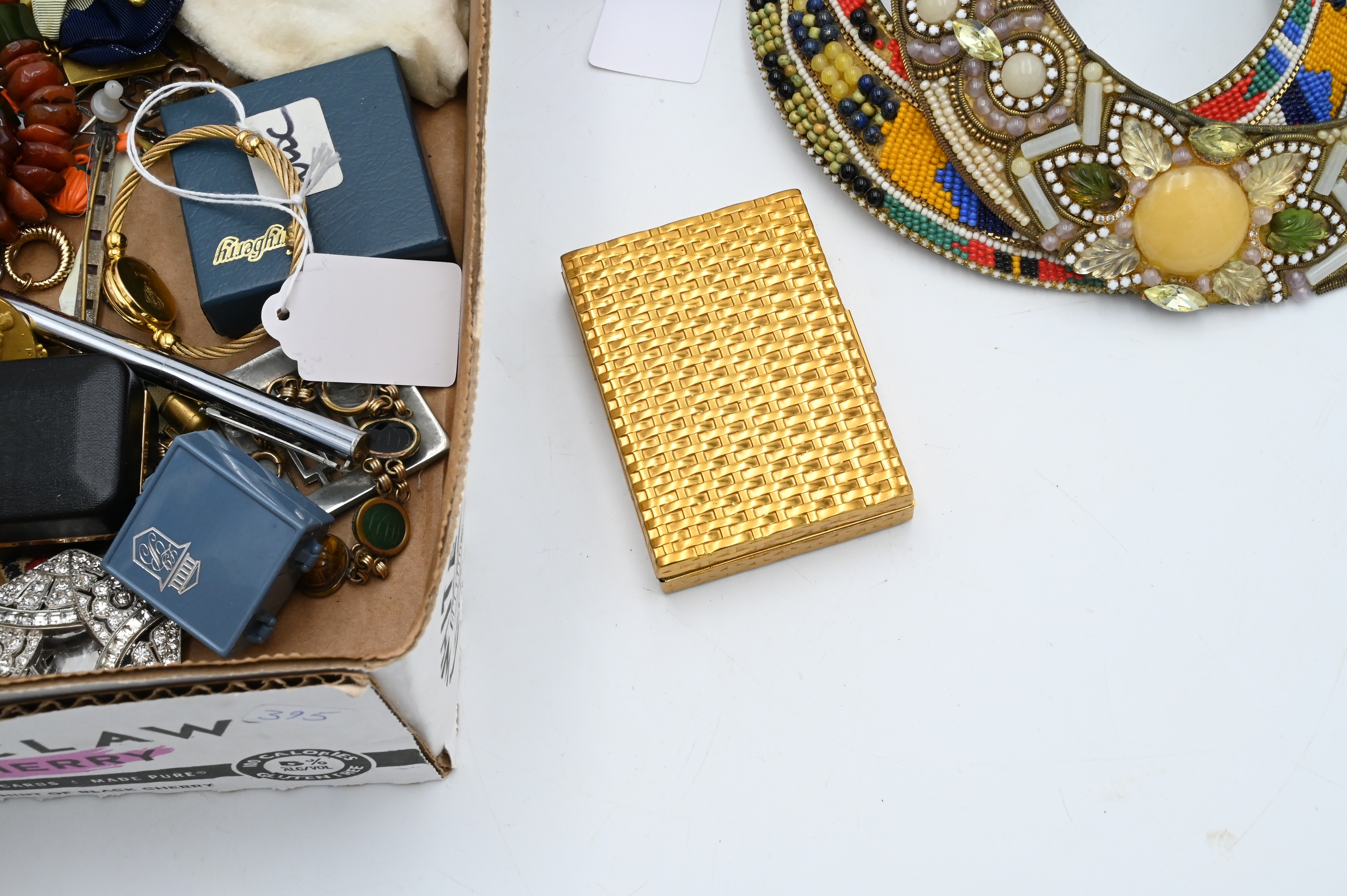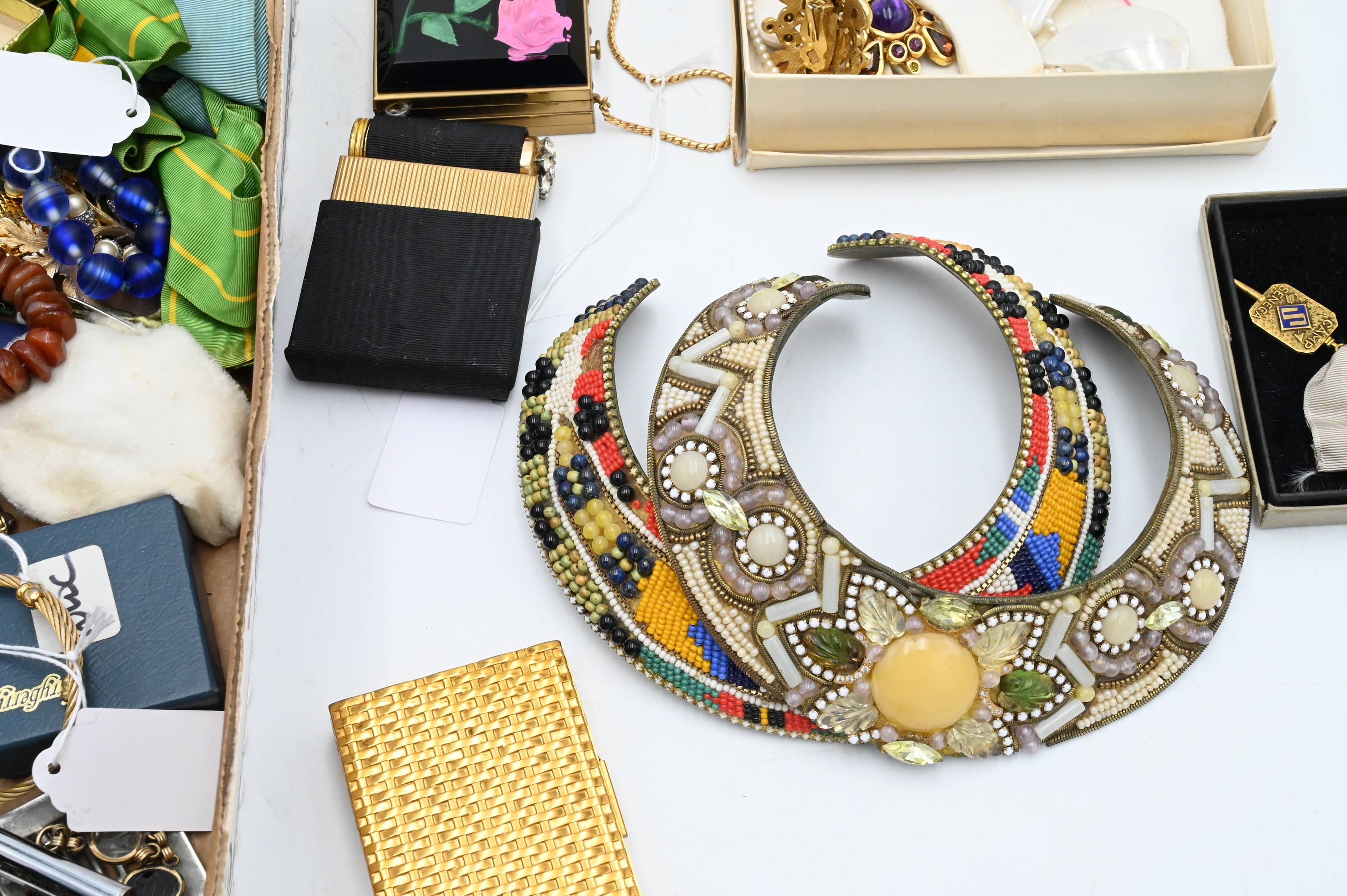 Tray Lot of Costume Jewelry, to include Jay Feinberg bracelet and clip earrings, Florenza brooch, jade necklace pendant, watches, etcetera…