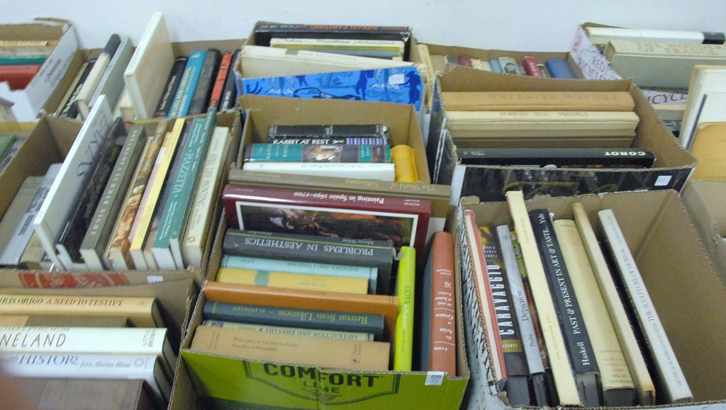 Twenty-six boxes of assorted books ontop and beneath a table.