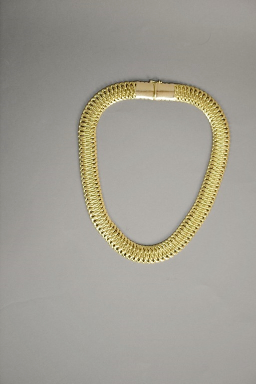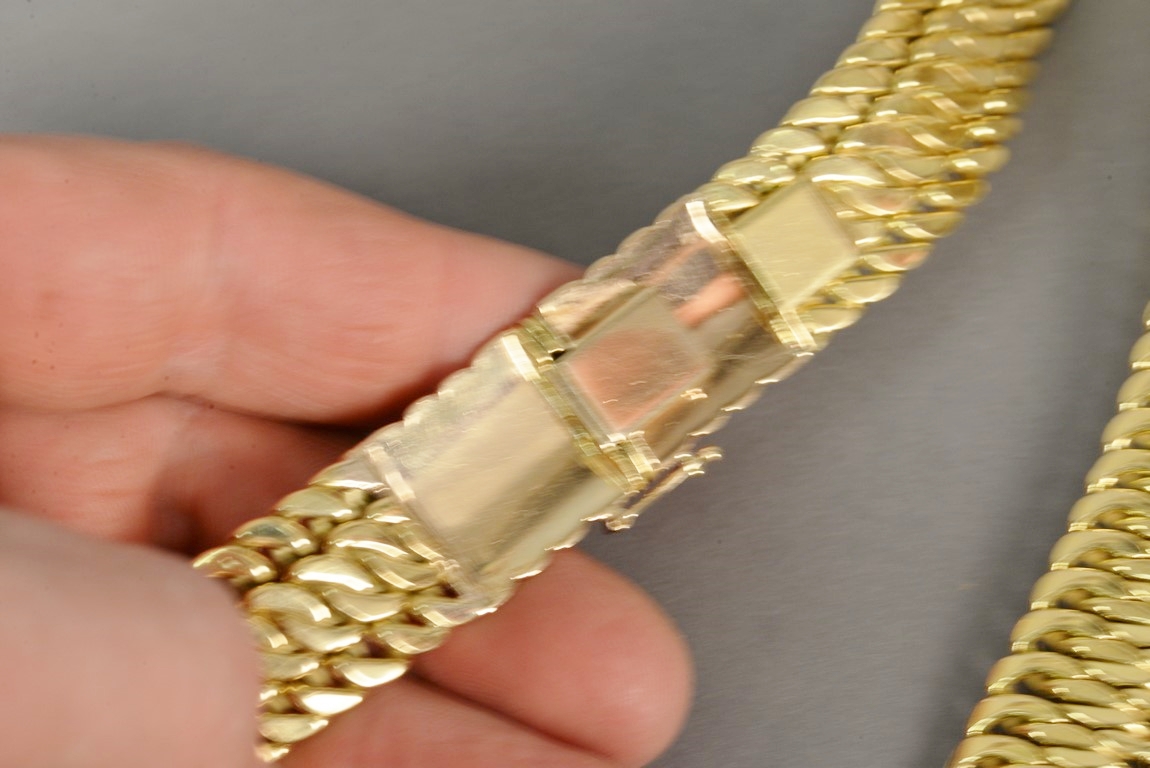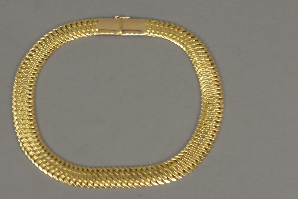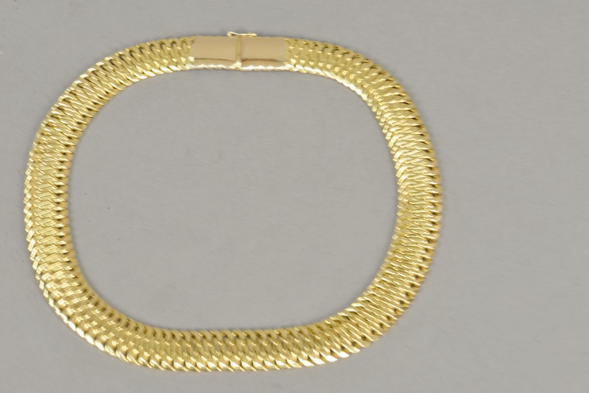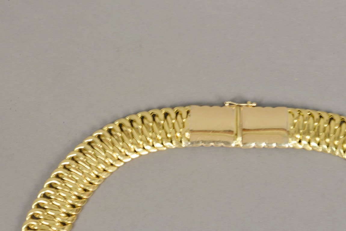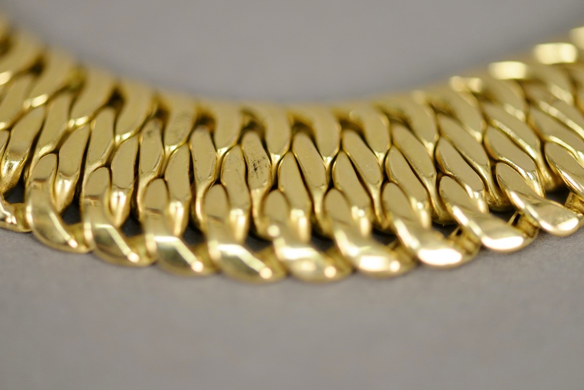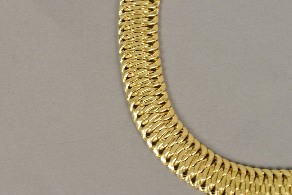 Lot 20: Wide Bismarck style neckchain in 18K stamped yellow gold with a plunger clasp and a figure eight safety. The neckchain measures…