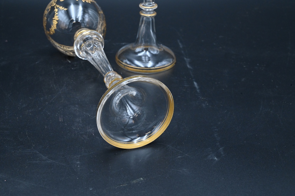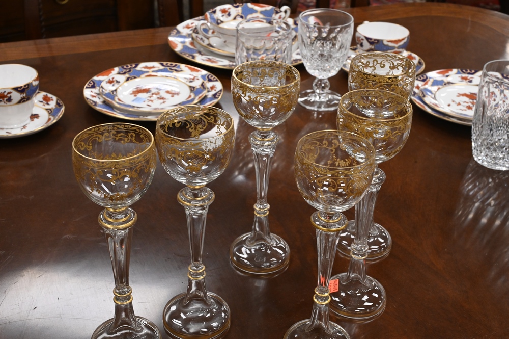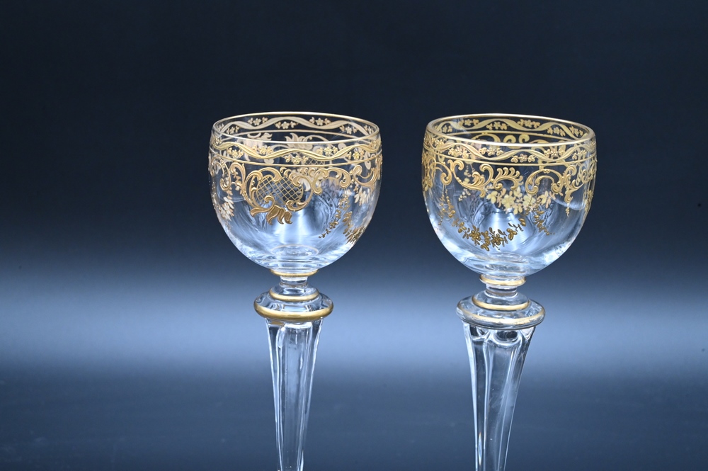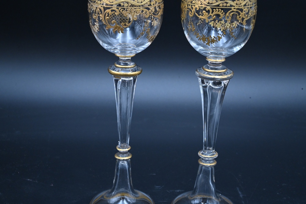 Lot 200: 12 Tall Stemmed Moser Champagne Glasses, having applied gold decoration, height 8 1/2 inches.