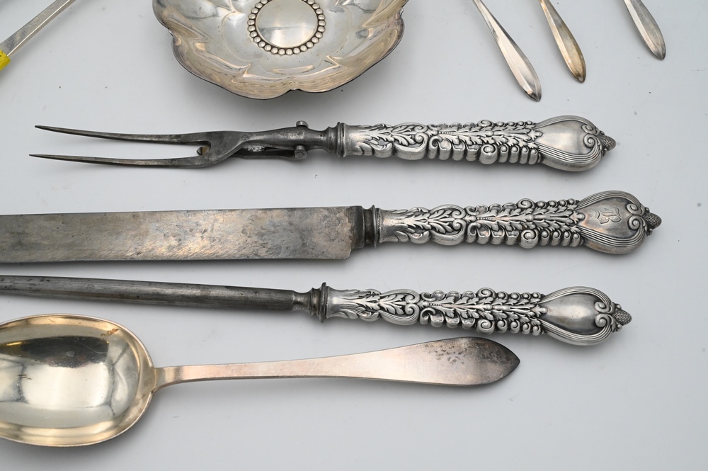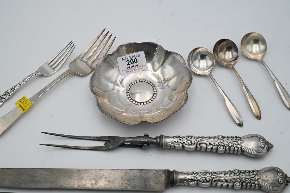 7 Piece Tiffany & Company Sterling Silver Lot, to include 1 serving fork; 1 serving spoon; 1 fork; 1 small flower form bowl/dish; 1 carving knife; 1 carving fork; along with 1 knife sharpener longest 9 1/2 inches; 12.83 t.oz. plus 3 handles and 3 plate spoons.