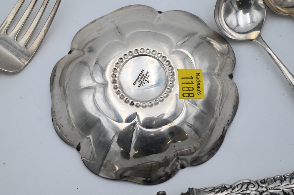 Lot 200: 7 Piece Tiffany & Company Sterling Silver Lot, to include 1 serving fork; 1 serving spoon; 1 fork; 1 small flower form bowl/dish; 1…
