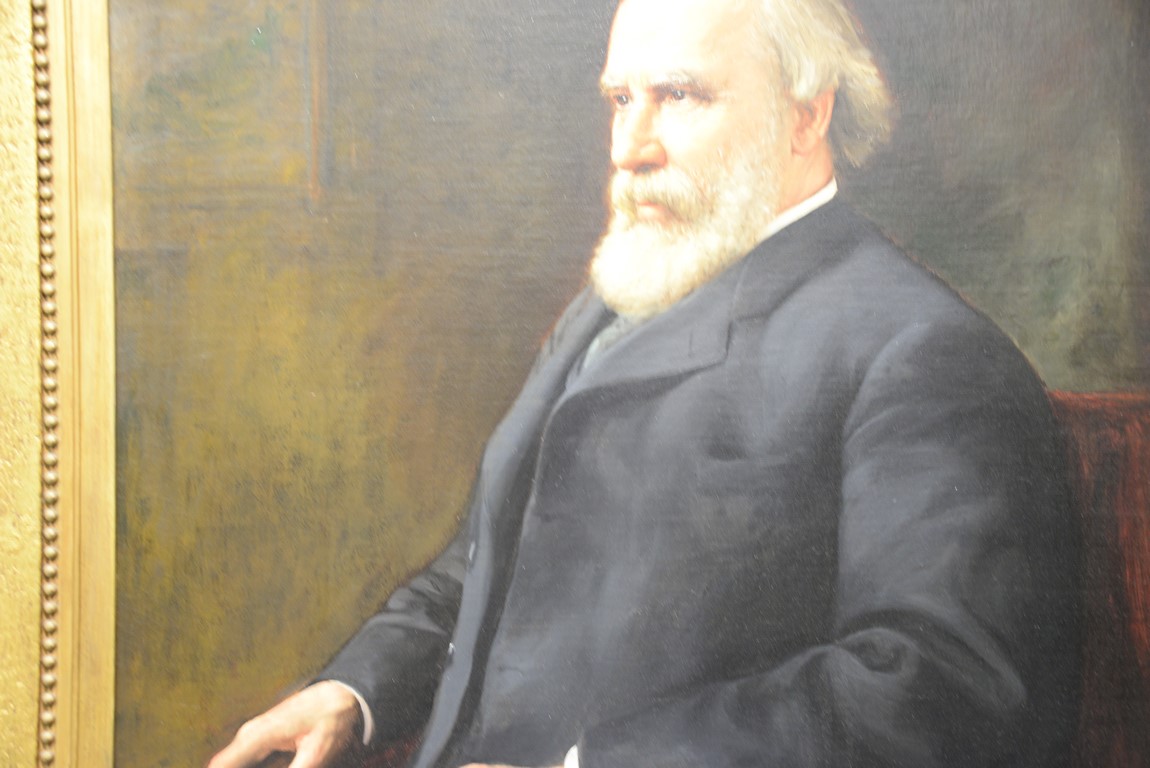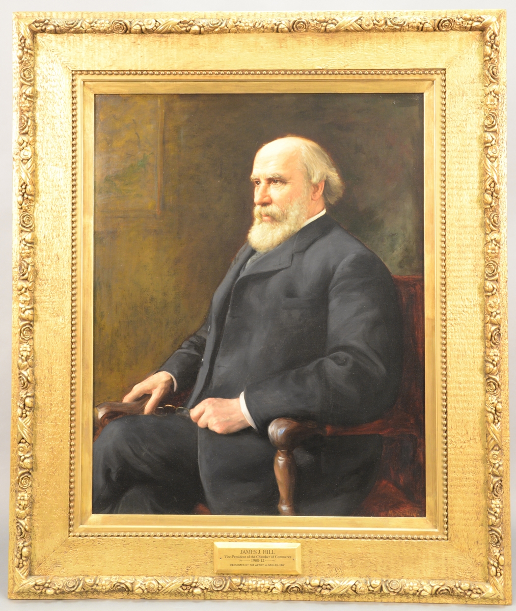 Adolfo Muller-ury 1862-1947 Portrait of James Jerome Hill 1838-1916 oil on canvas, circa 1902 signed lower right: Muller-ury plaque: James J. Hill, Vice President of the Chamber of Commerce 1908-12, Presented by the artist A. Muller-ury. 42 1/2 x 34 total size: 57 1/4 x 48 1/2 Hill was a Canadian-American railroad executive, the Chief Executive Officer of lines headed by the Great Northern Railway, and President of St. Paul, Minnesota & Manitoba Railway Company. Provenance: Property from Credit Suisse’s Americana Collection