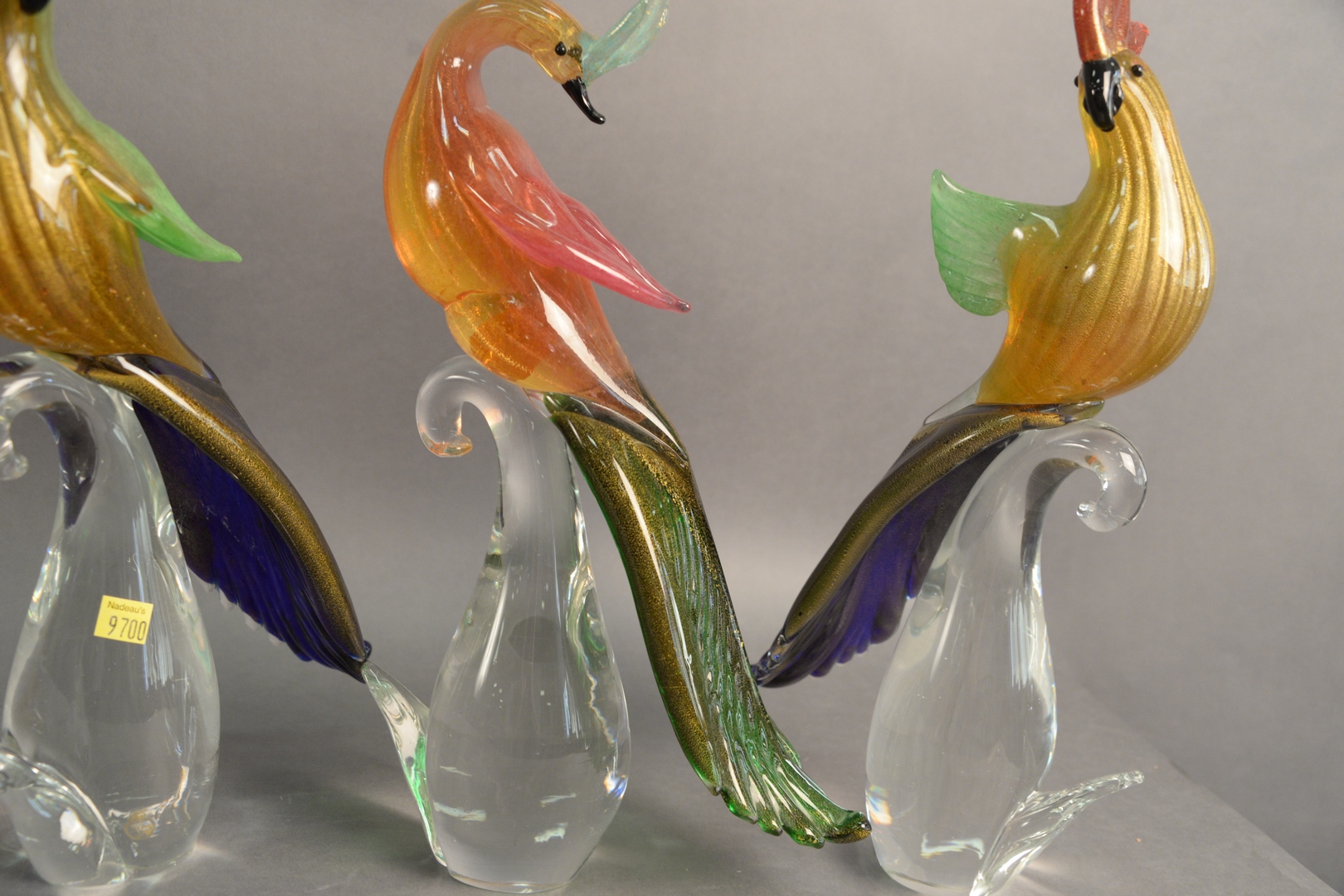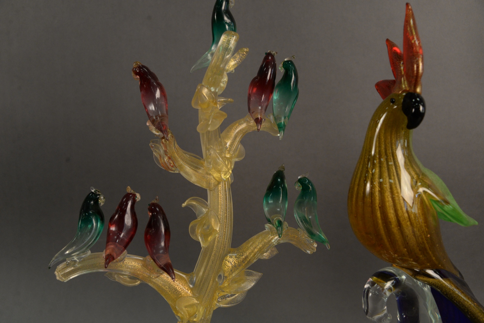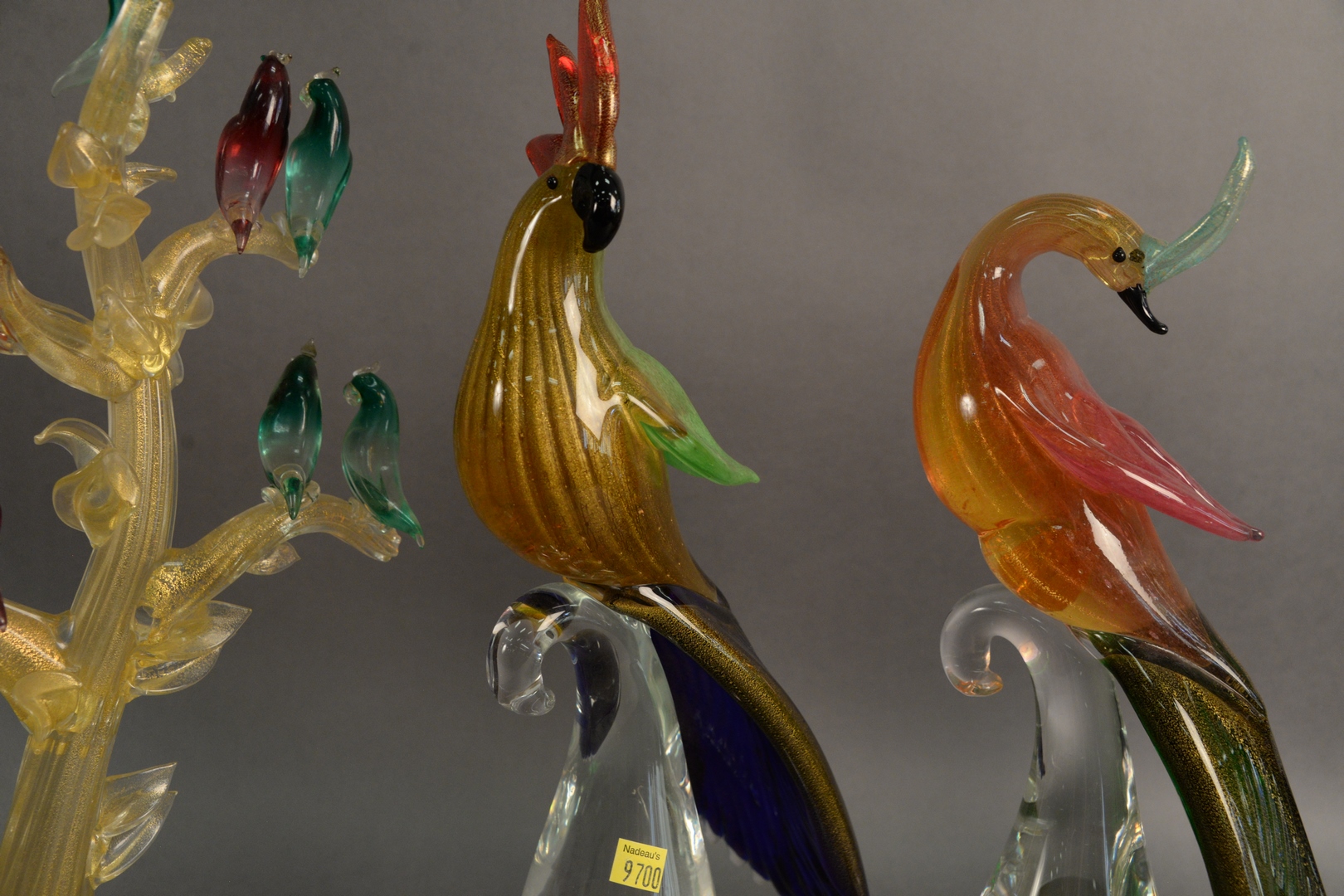 Lot 200: Group of Five Murano Glass Birds, to include a pair of yellow and purple cockatoos, both signed indistinctly to the underside; a yellow and green cockatoo, unsigned; along with several red and green birds sitting in a tree, unsigned, (one piece broken); height 19 1/2 inches. Provenance: Estate of James Wadhams.