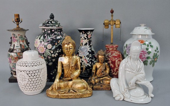 Large group of Chinese items to include three carved Buddha figures, iron elephants, four covered jars, two vases, and white glazed Buddha figure.