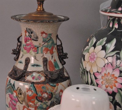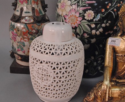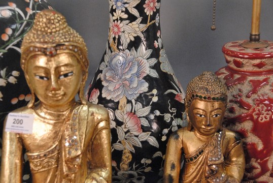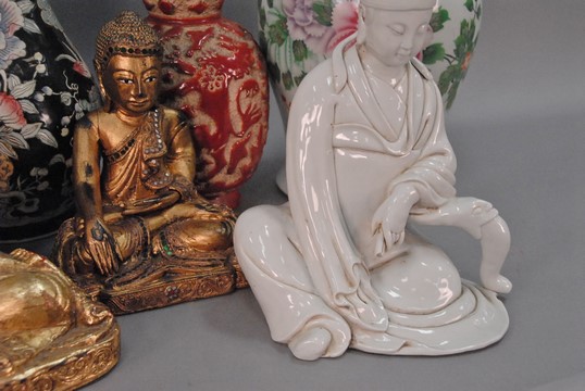 Lot 200: Large group of Chinese items to include three carved Buddha figures, iron elephants, four covered jars, two vases, and white glazed …