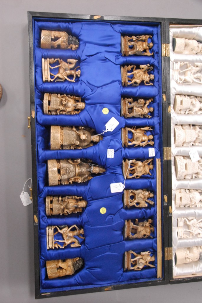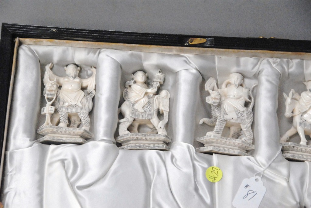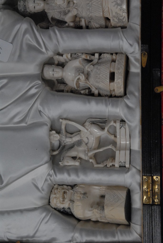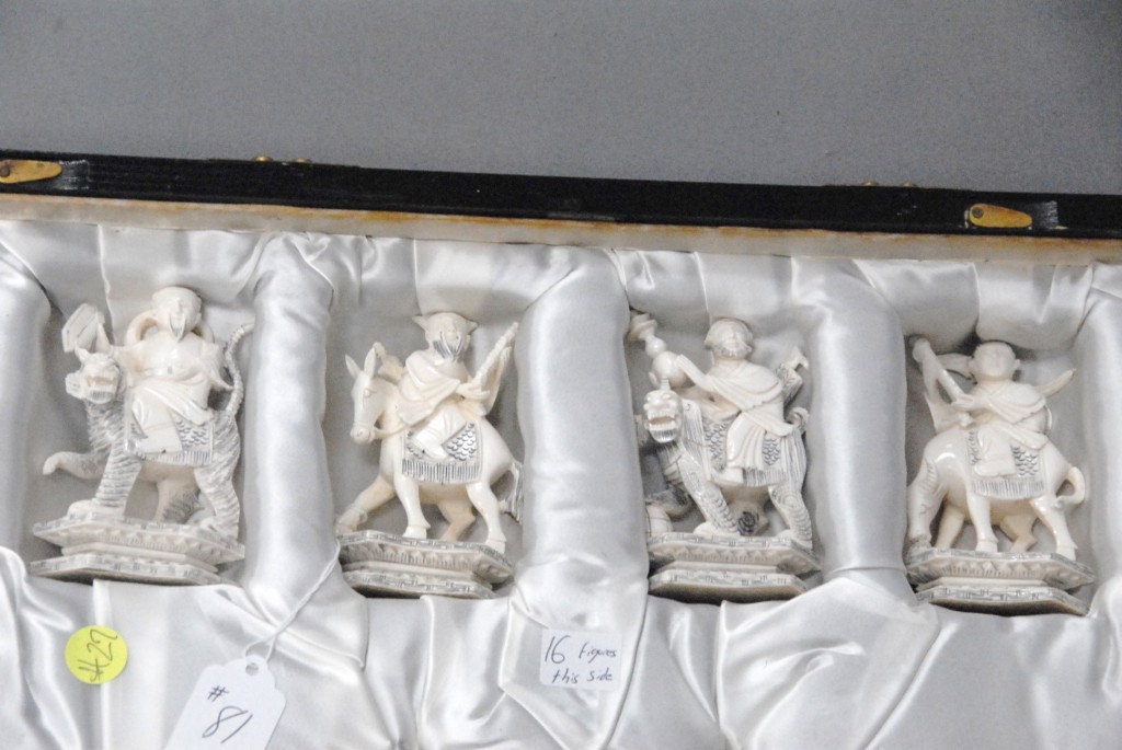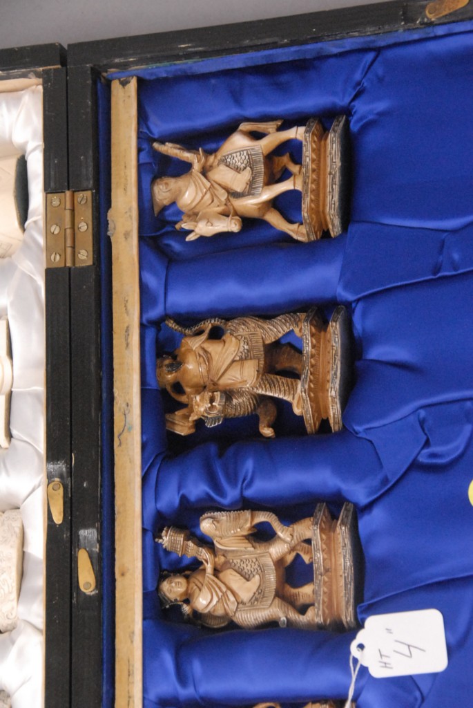 Large ivory chess set having large folding game board with fitted interior holding a set of intricately carved ivory chessmen and animals, hts. 4 to 7.