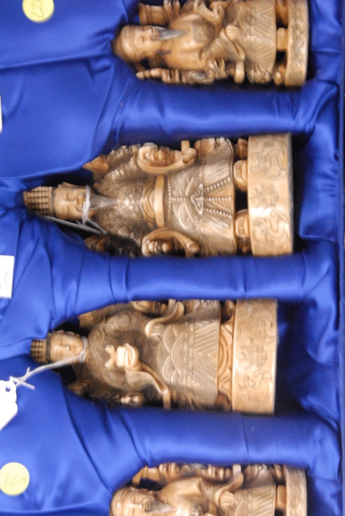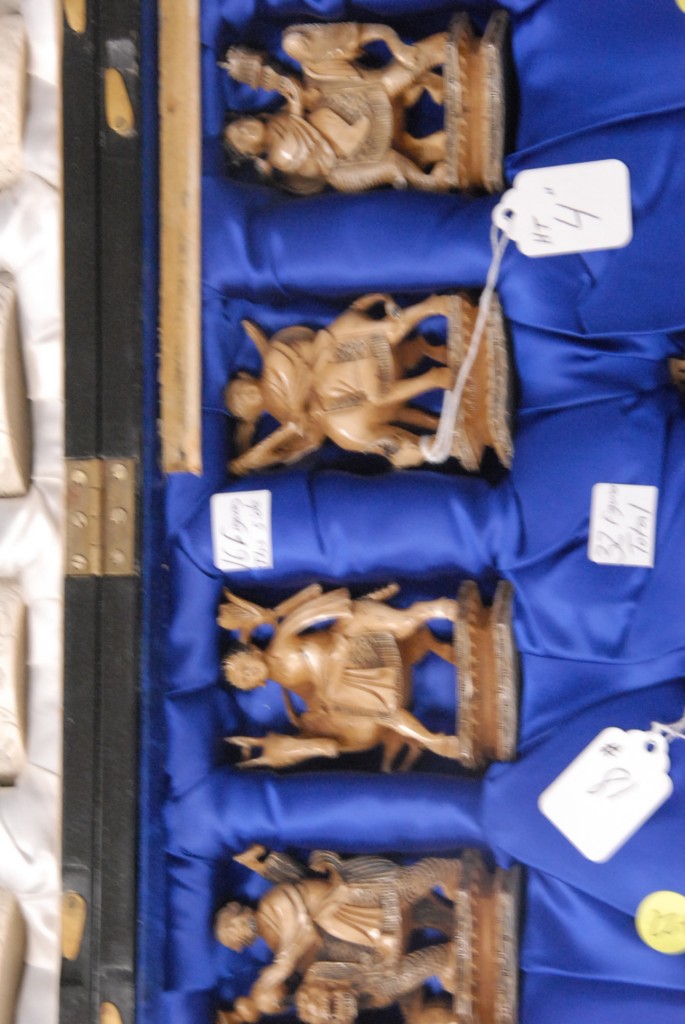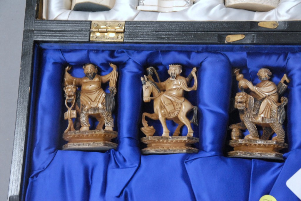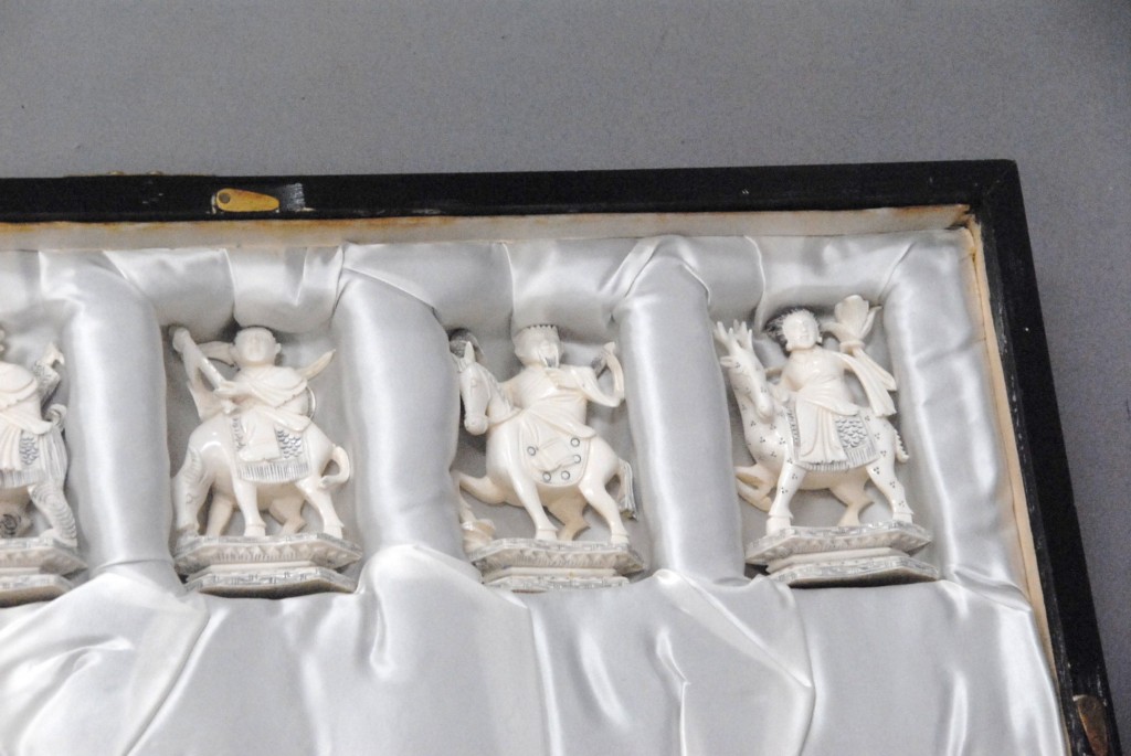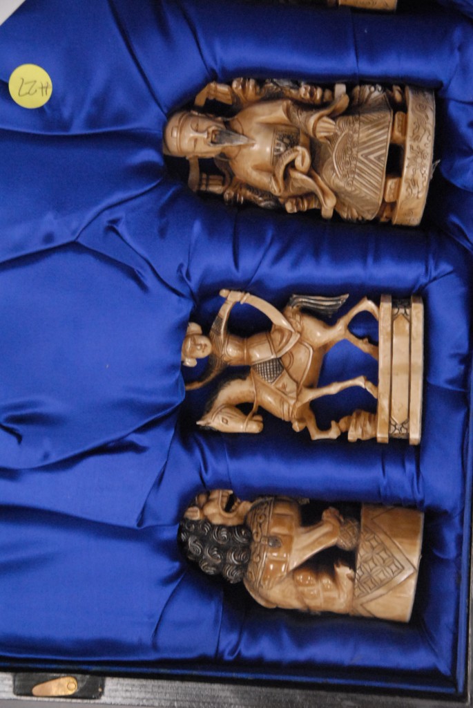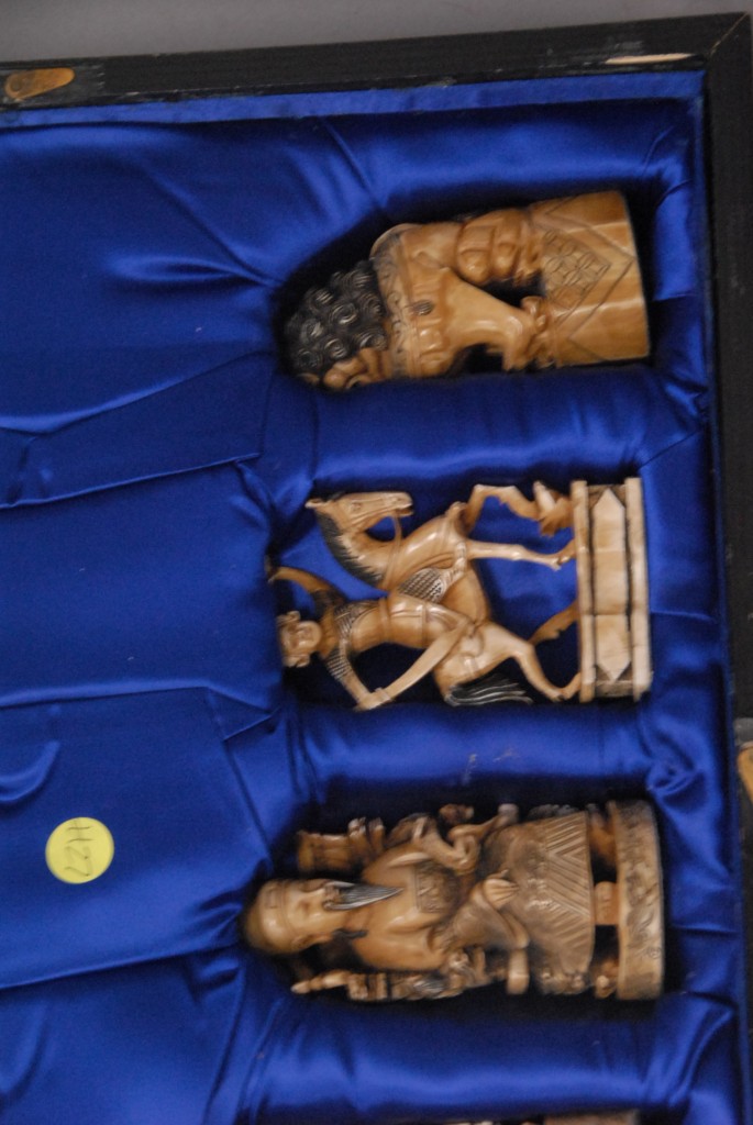 Large ivory chess set having large folding game board with fitted interior holding a set of intricately carved ivory chessmen and animals, hts. 4 to 7.