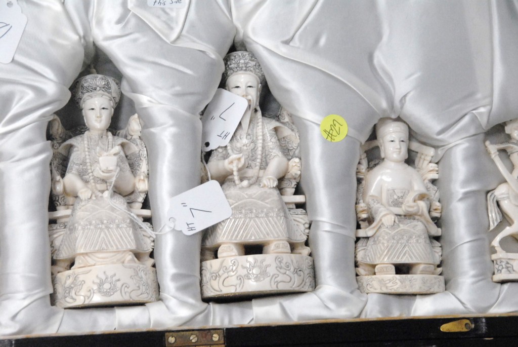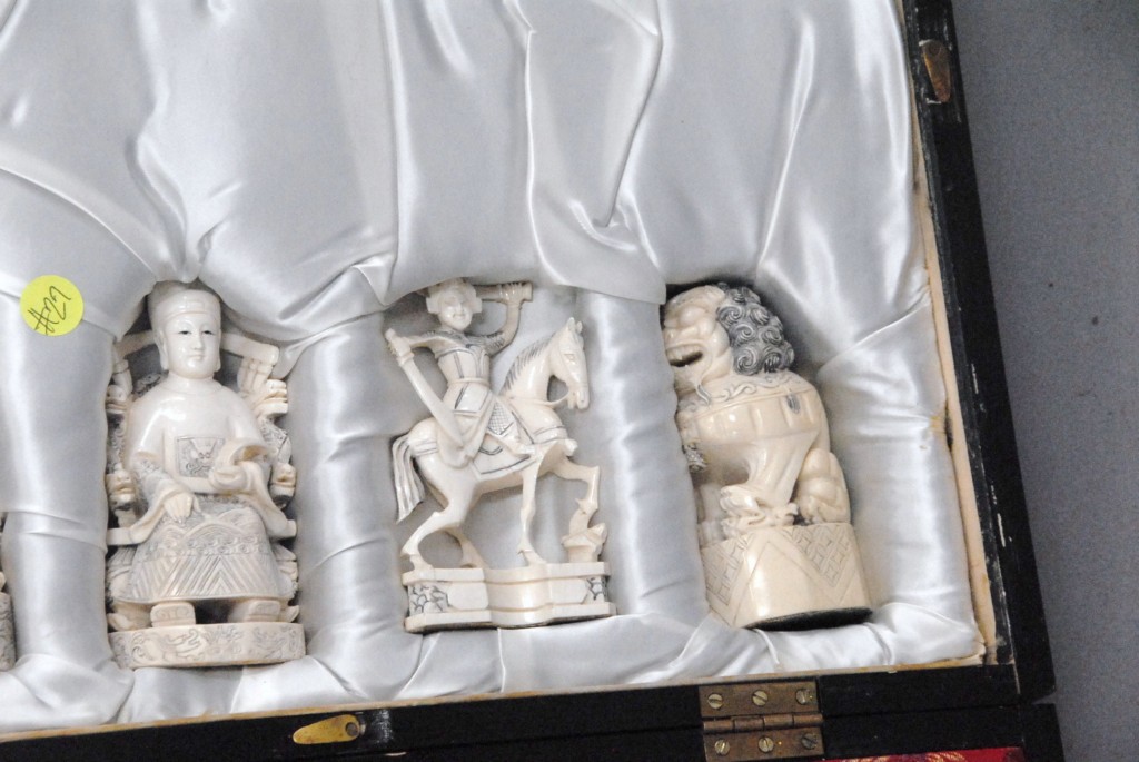 Lot 200: Large ivory chess set having large folding game board with fitted interior holding a set of intricately carved ivory chessmen and an…