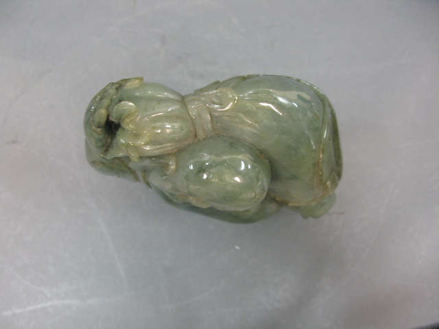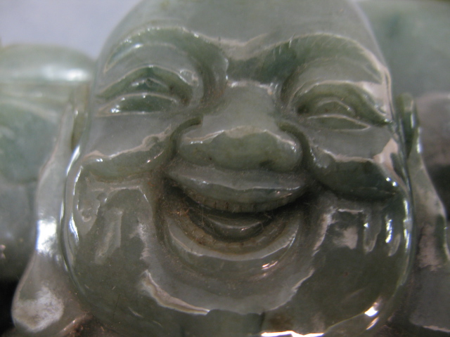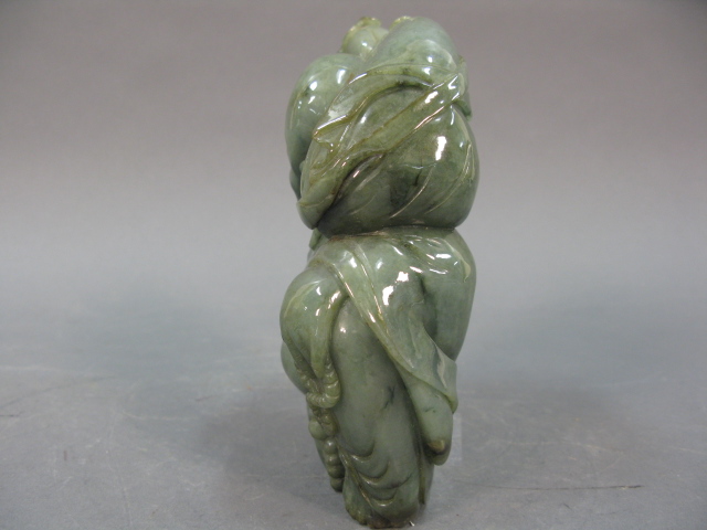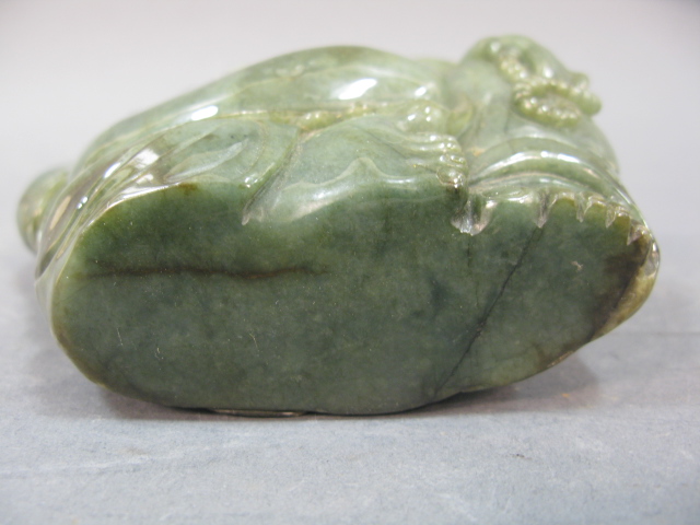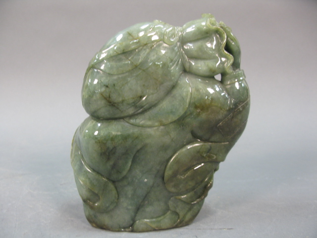 Large spinach green jade Buddha figure holding a tied bag across his shoulders.