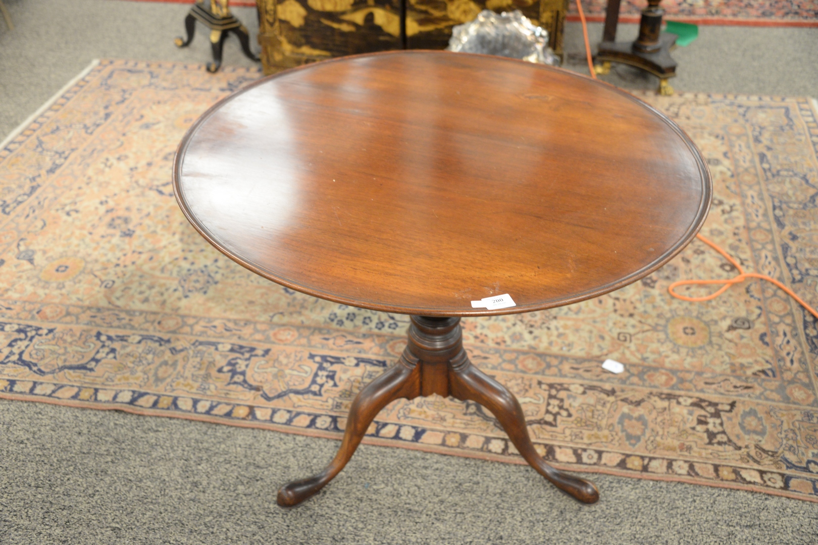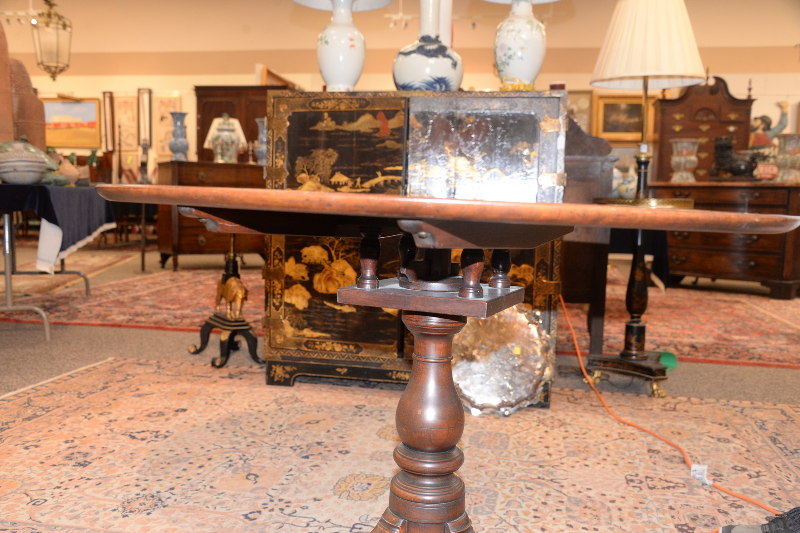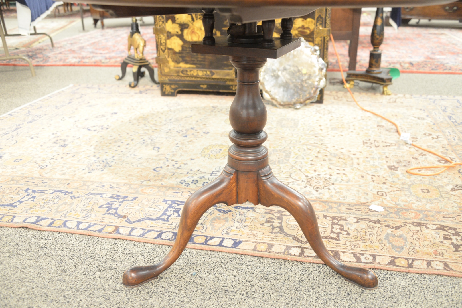 Lot 200: Mahogany Tip and Turn Tea Table, having dished top on birdcage unit on turned shaft ending in tripod base, circa 1750, attributed to the Chapin School, height 26 3/4 inches, top 32 7/8 x 33 7/8.