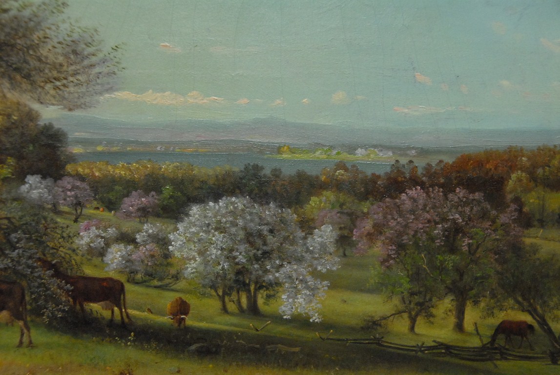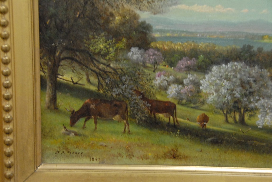 Nelson Augustus Moore 1824-1902 SPRING FARM LANDSCAPE WITH BLOSSOMING APPLE TREES oil on canvas signed lower left N. A. Moore 1868 12 x 18. From the collection of Thomas and Alice Kugelman