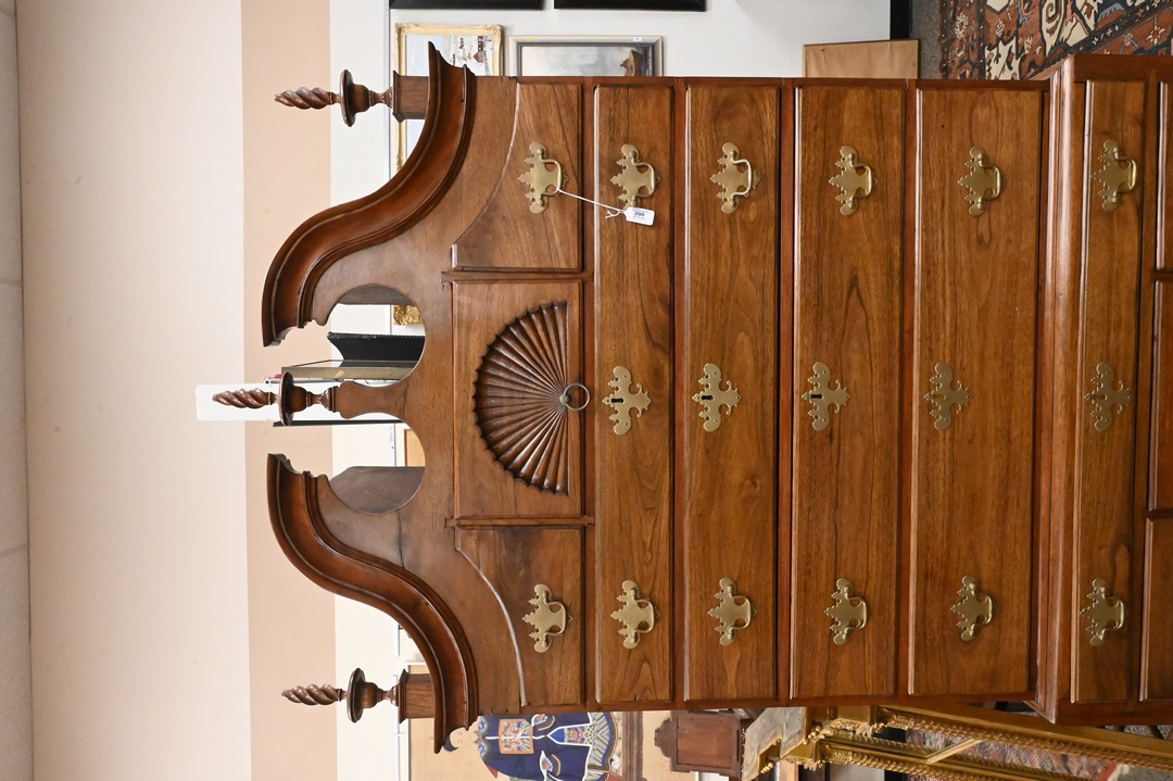 Queen Anne Walnut Bonnet Top Highboy, in two parts, upper section with bonnet top and three turned finials over fan carved center drawer, flanked by two short drawers over four drawers on lower section with one long drawer over three short drawers, fan carved center drawer with carved skirt and cabriole legs on pad feet; Salem, Massachusetts, 1750 – 1760, height 87 inches, width 38 1/4 inches. Provenance: John Walton, 1950’s, Kenneth Tuttle Antiques, Pittston, Maine, May 2008, paid $95K.
