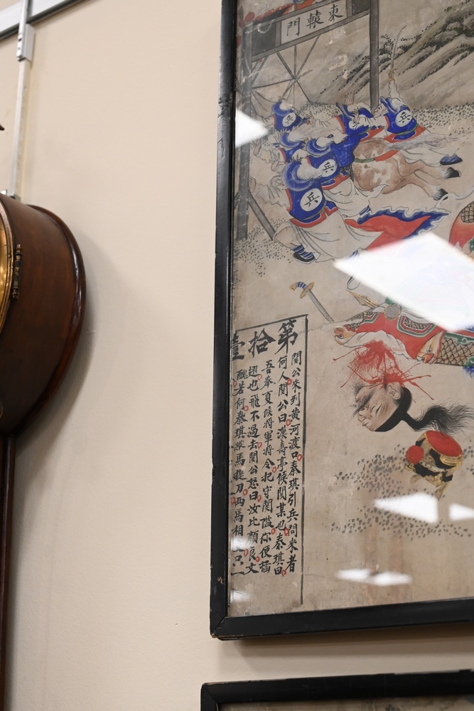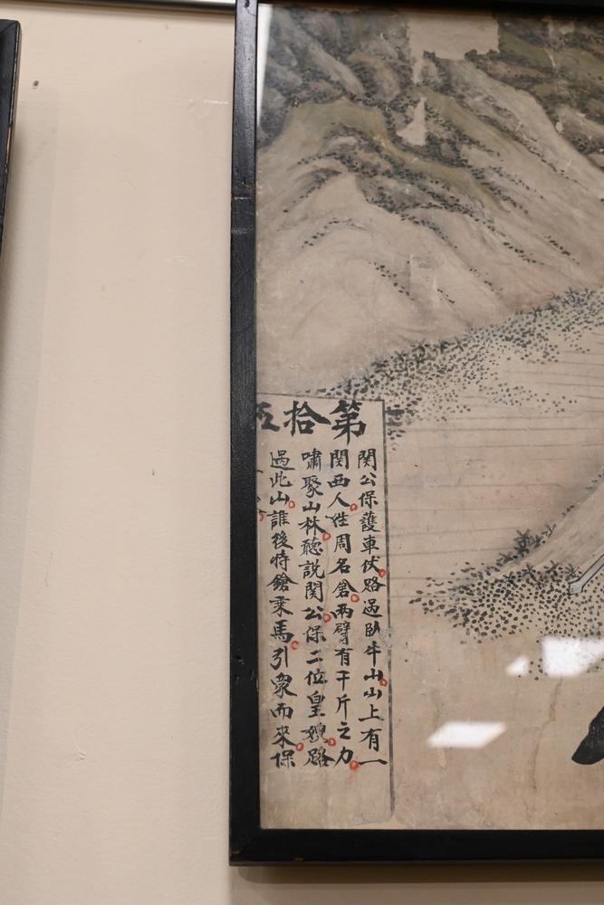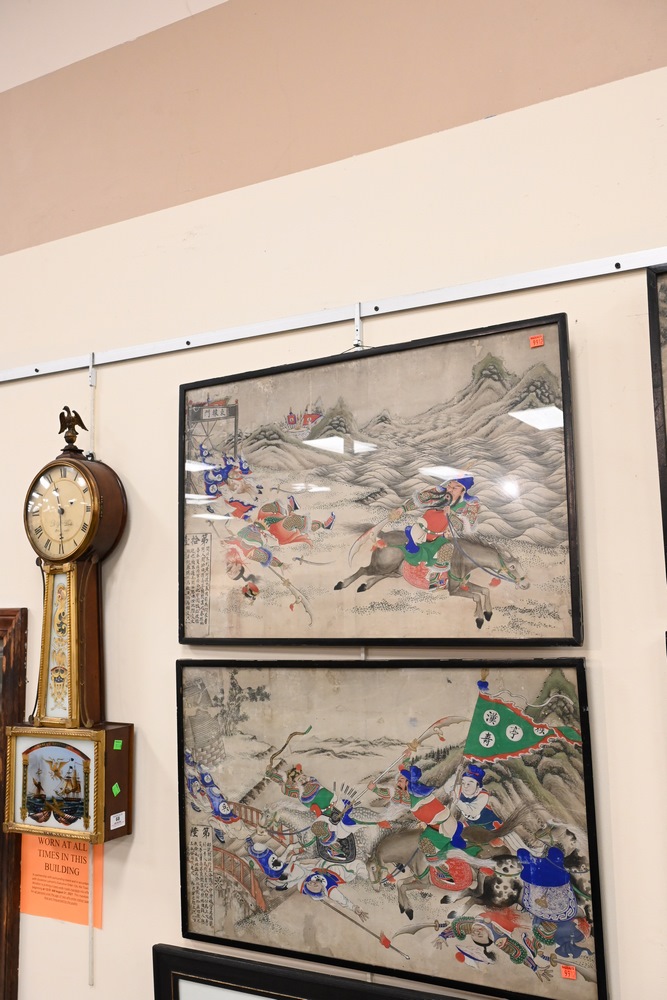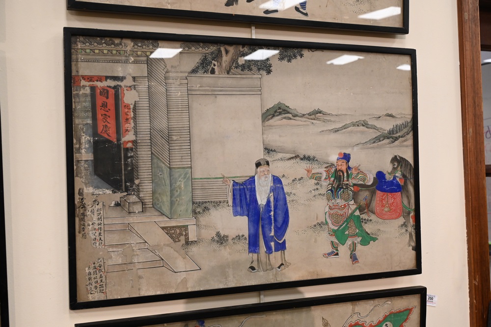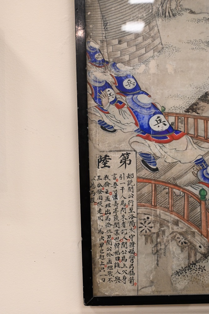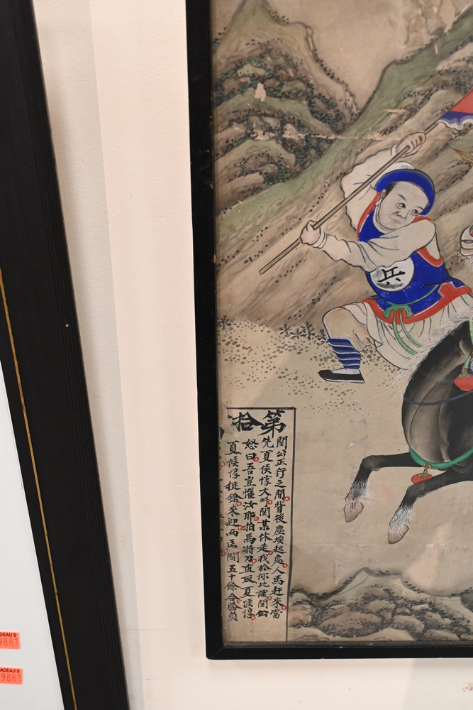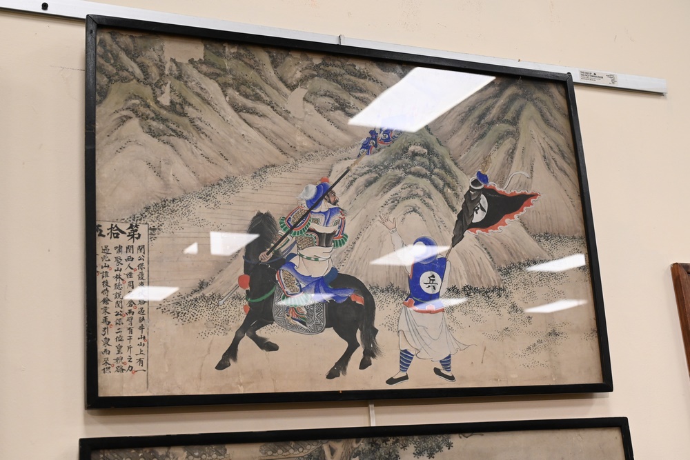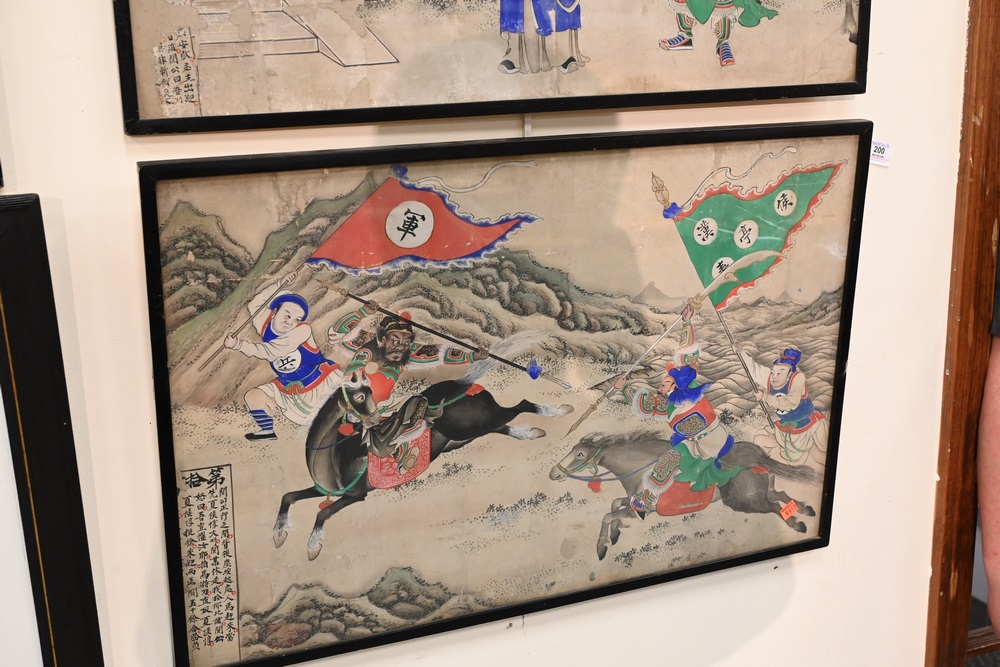 Lot 200: Set of Five Chinese Watercolors on Paper all having same warrior figure on grey horse, storyline from meeting with scholar to battle with soldiers signed and script lower left 18 1/4 x 28 1/2 inches