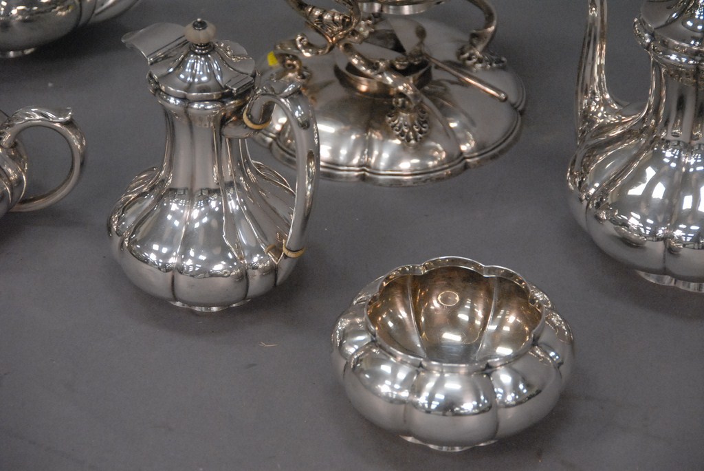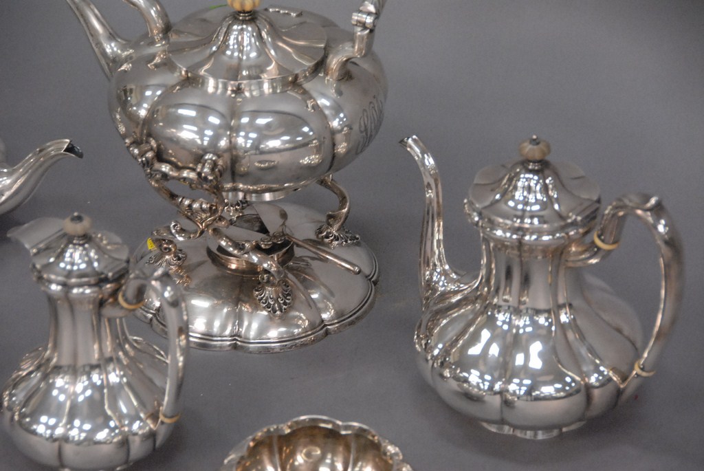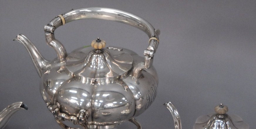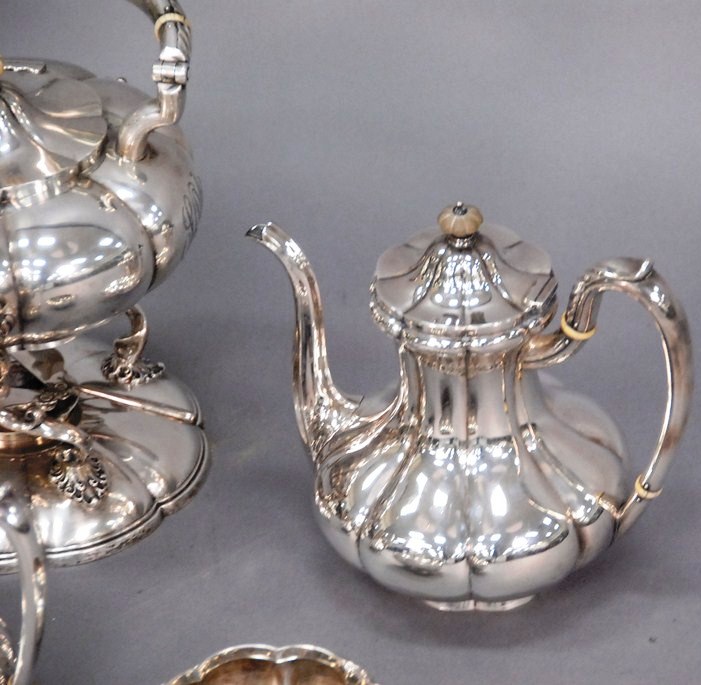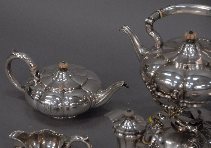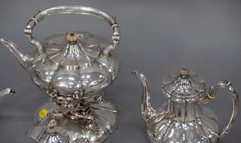 Seven piece Howard & Co. sterling silver tea and coffee set a tilting hot water pot, coffee pot, tea pot, covered creamer, open creamer, covered sugar bowl, and sugar bowl 148.5 t oz. Provenance: Once belonging to Sara Otis Amory, wife of Frank Dexter Cheney of Manchester, Connecticut.
