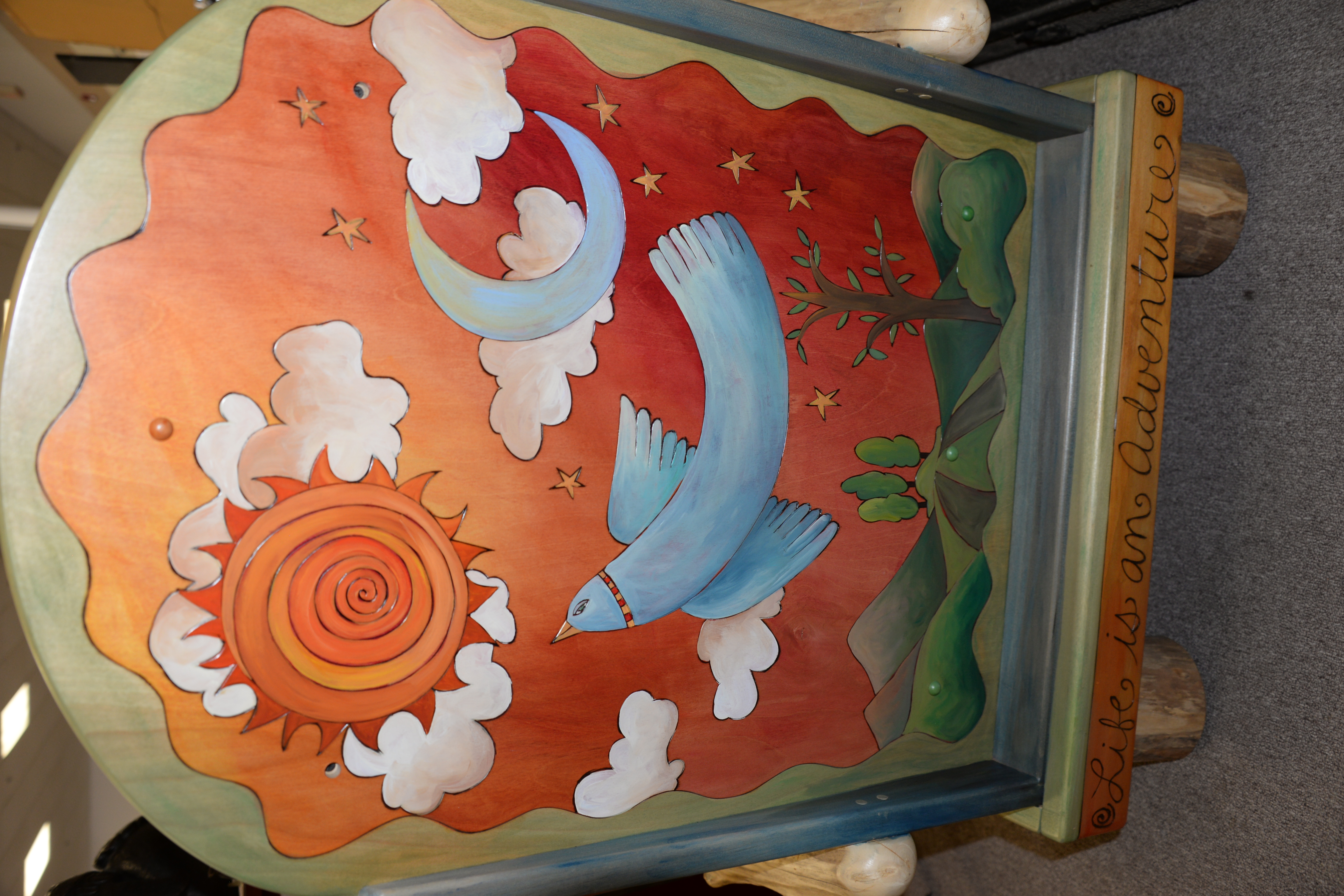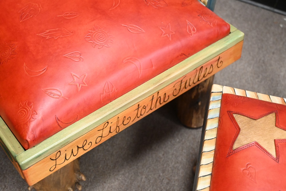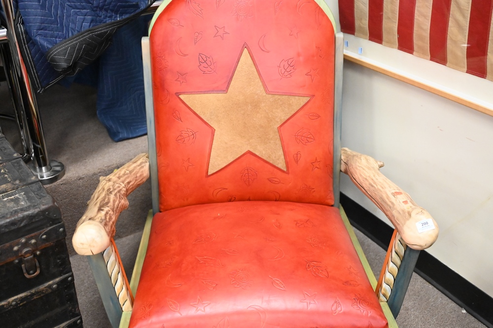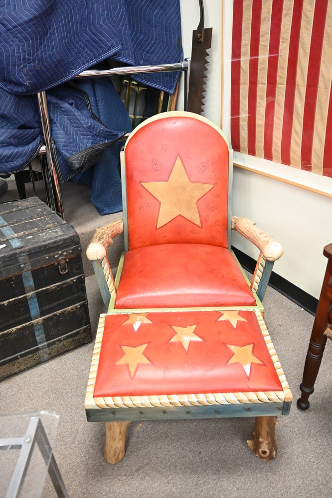 Lot 200: Sticks Object Art Furniture Armchair and Matching Ottoman, having red leather and cowhide upholstery, inscribed on the front “Live Life to the Fullest”. height 39 inches, width 33 inches.