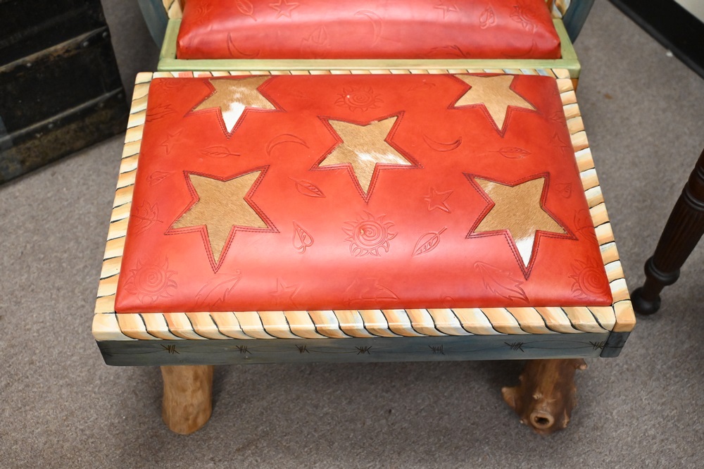Sticks Object Art Furniture Armchair and Matching Ottoman, having red leather and cowhide upholstery, inscribed on the front “Live L…