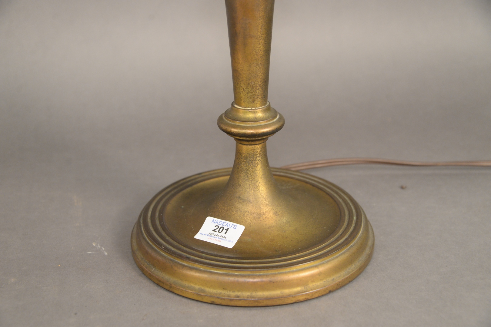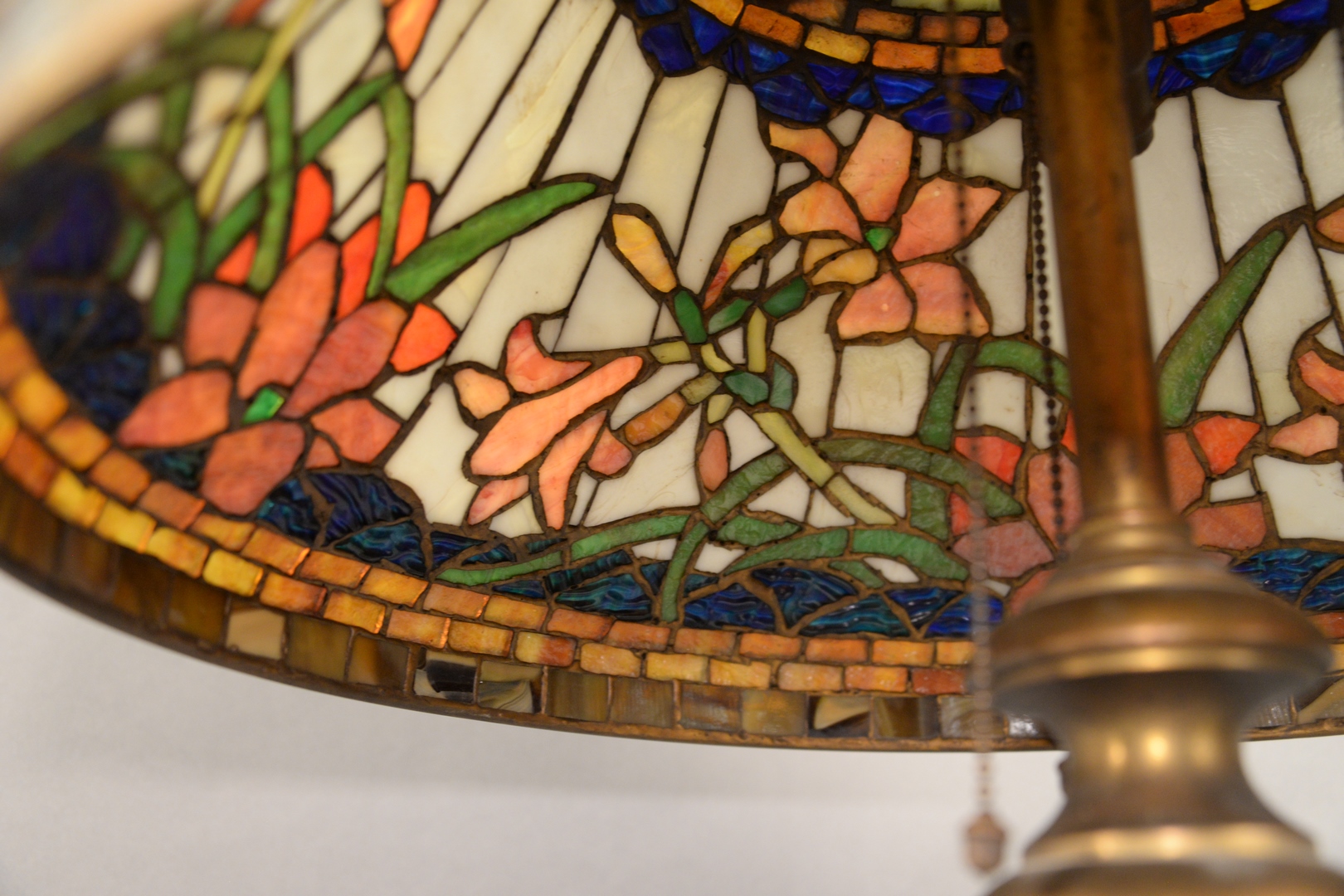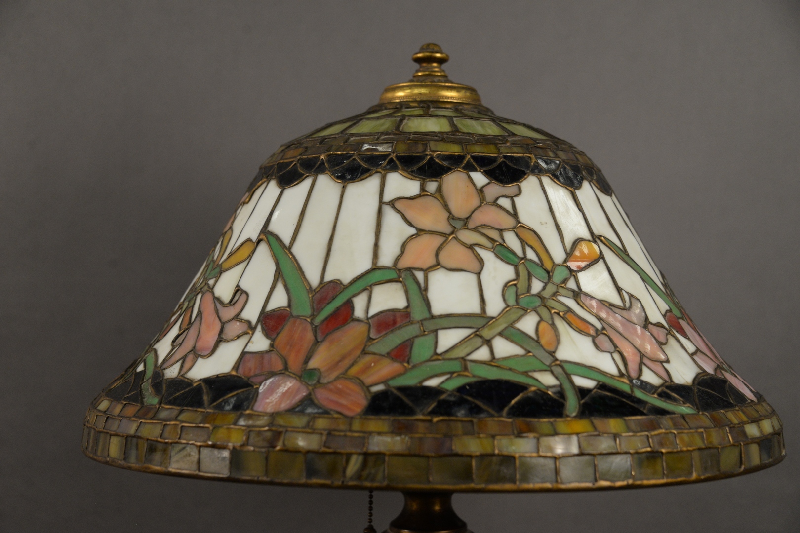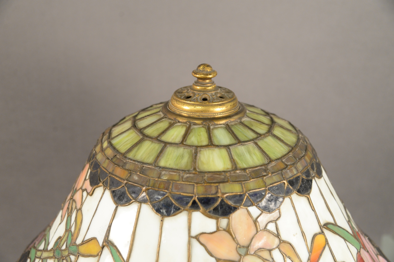 Lot 201: Attributed to Wilkinson Leaded Glass Table Lamp, having bell flower shape with white ground with flowers, resting on brass base having three sockets, height 27 inches, diameter 18 1/2 inches.