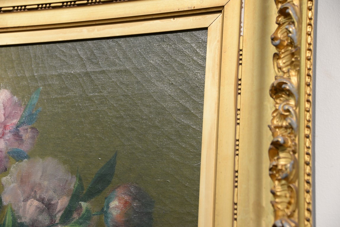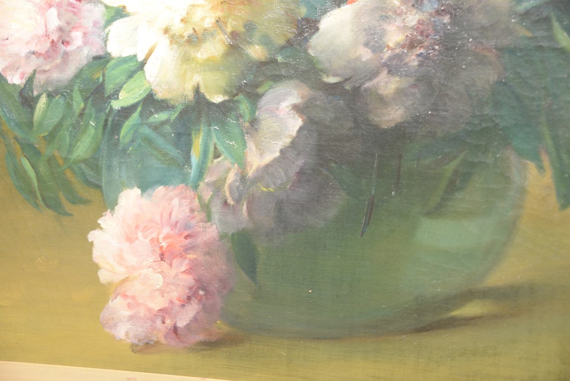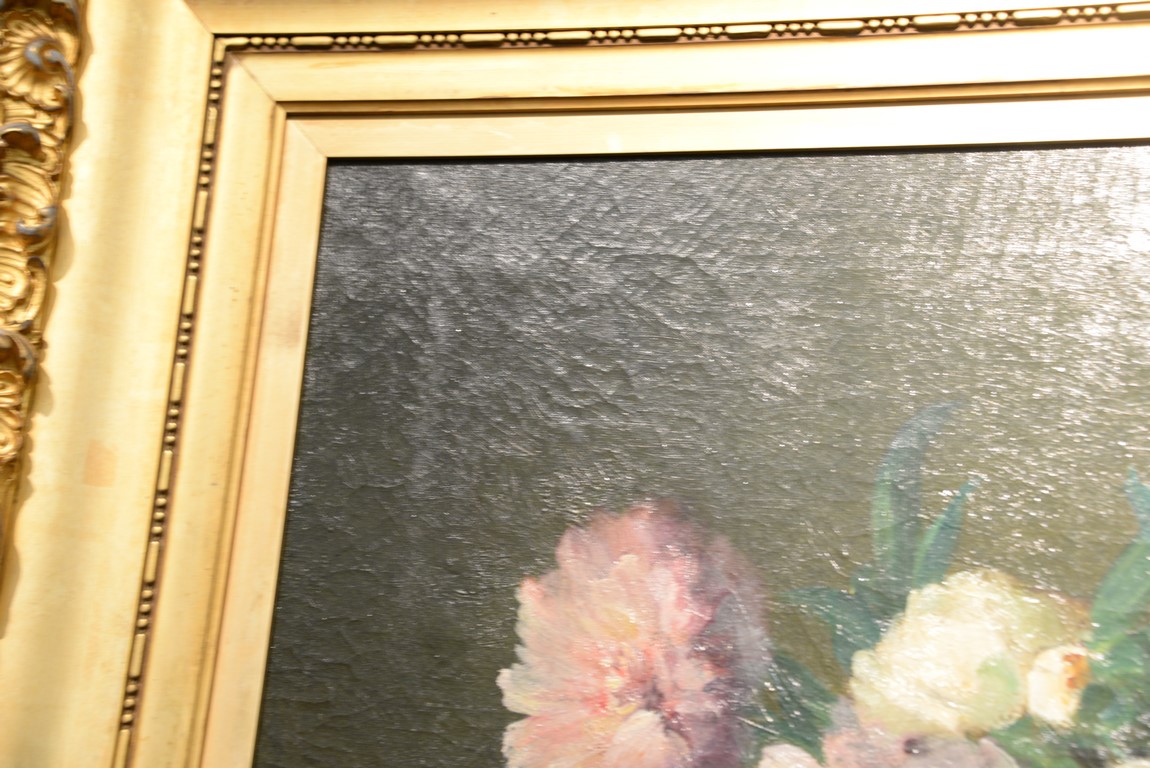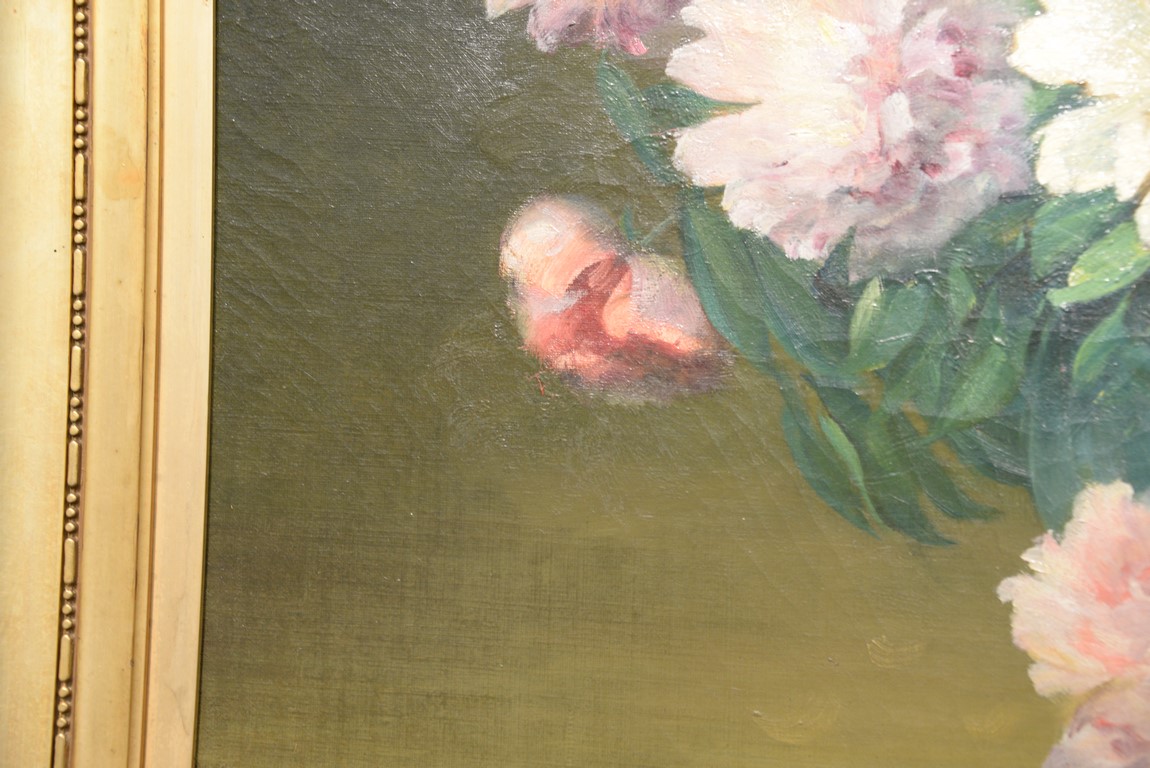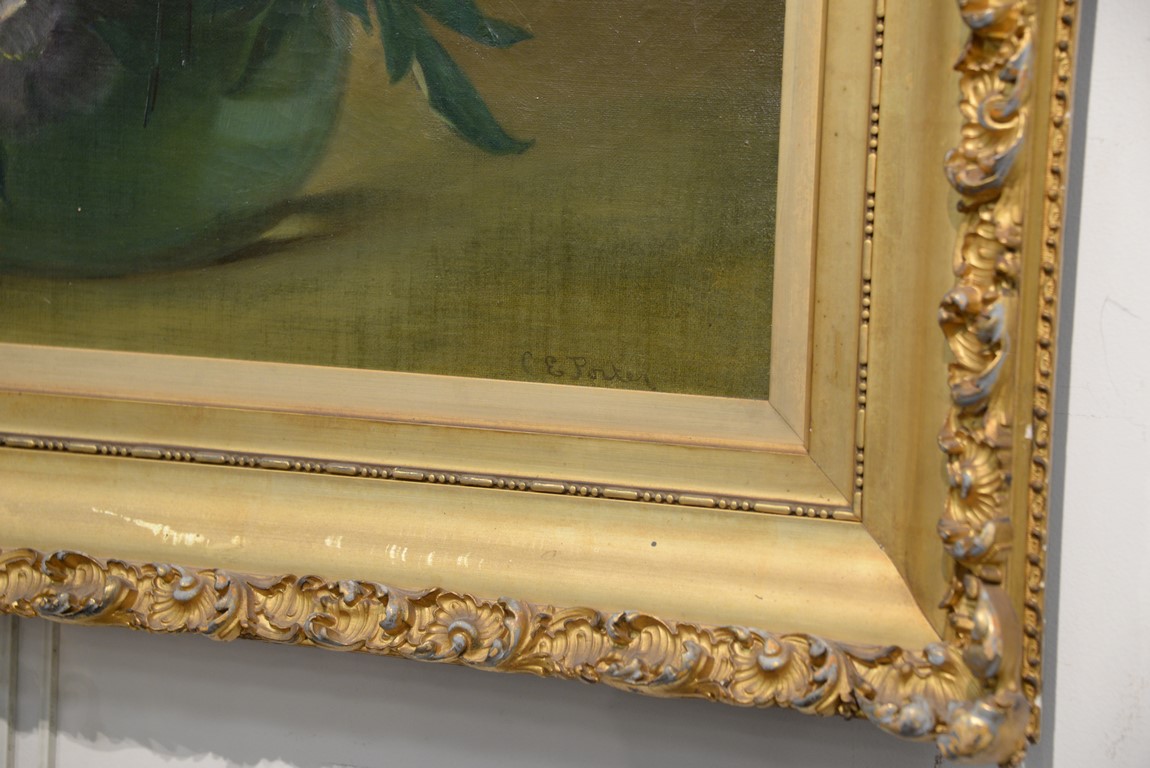Lot 201: CHARLES ETHAN PORTER 1847-1923 Peonies oil on canvas signed lower right C. E. Porter 26 x 36 Included Documentation: Original letters from Vernon Historical Society for this painting to be on loan fro