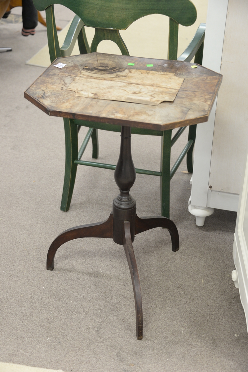 Lot 201: Federal mahogany tip candlestand with eight sided top having surround molding and inlaid top set on slender turned shaft ending in t…