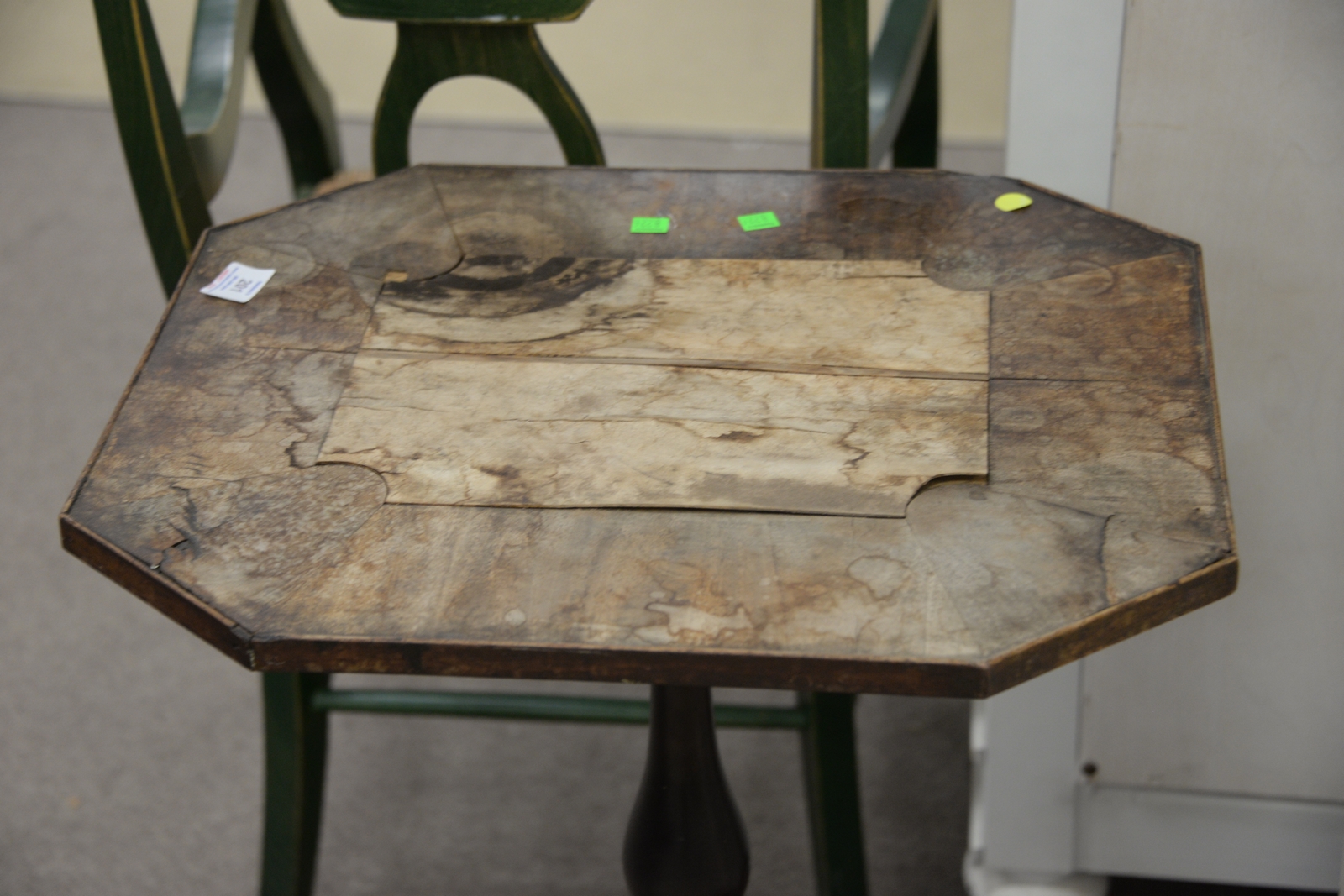 Federal mahogany tip candlestand with eight sided top having surround molding and inlaid top set on slender turned shaft ending in tripod spider base, circa 1790. top severely water damaged height 30 inches, top 18 x 21