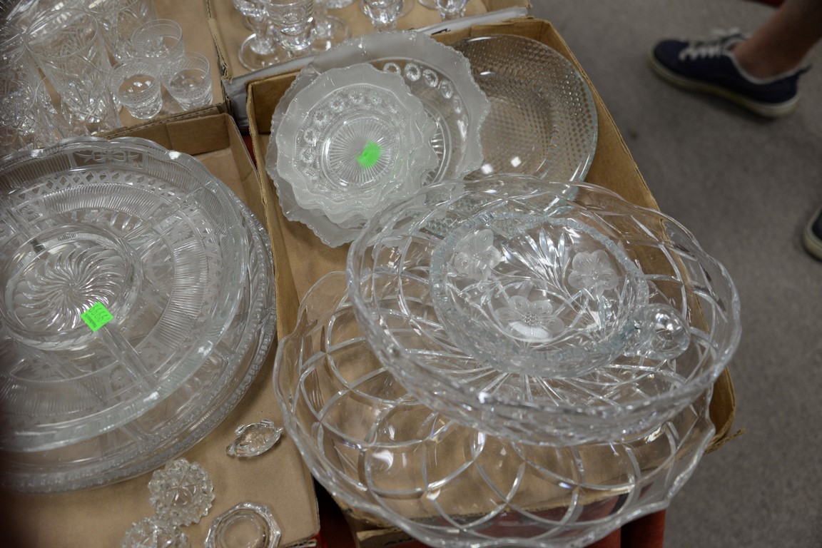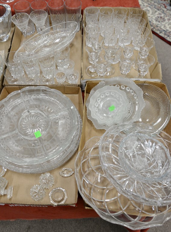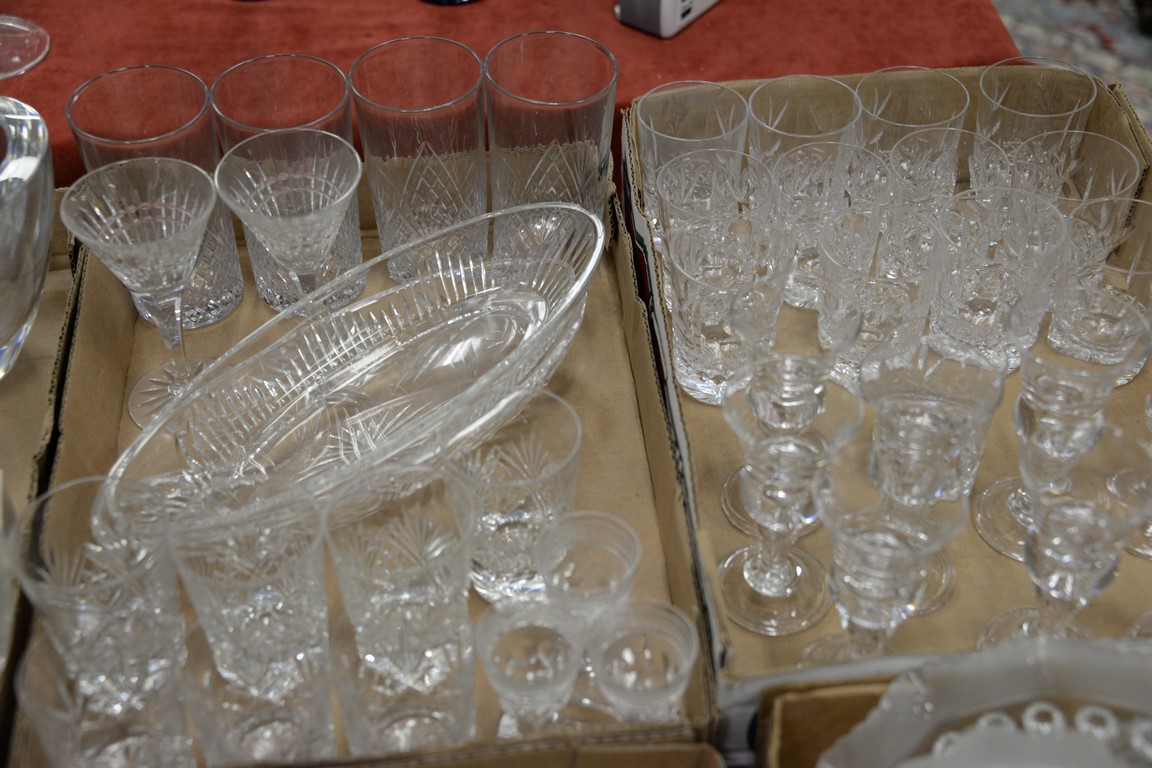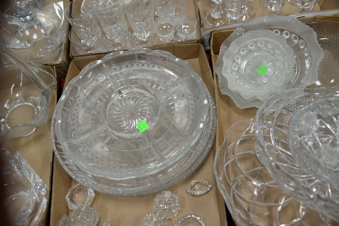 Four tray lots of crystal and cut glass to include set of twelve Barbridg crystal cordials, set of eight stemmed cordials, miscellaneous stems and goblets, three etched divided serving platters, etc.