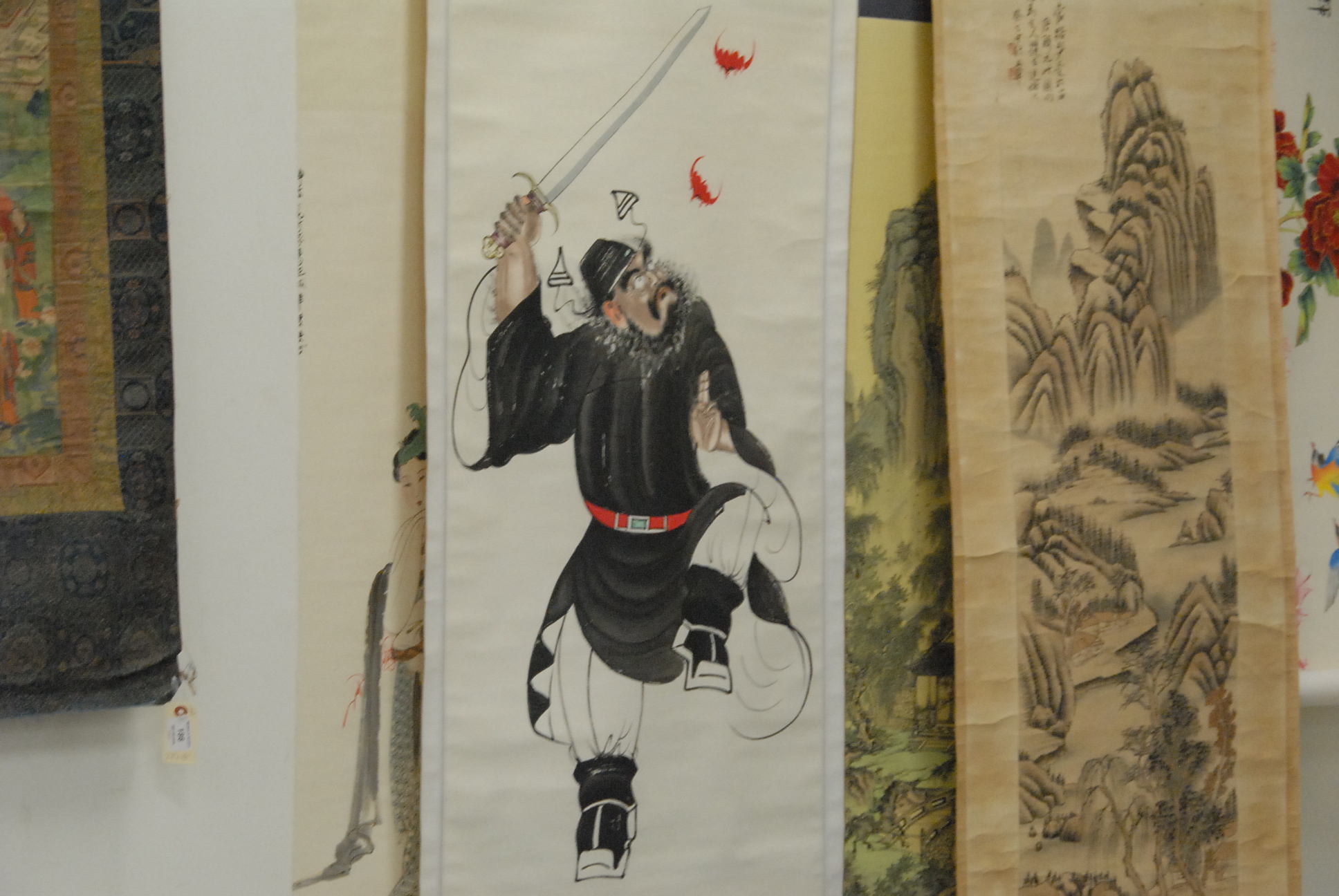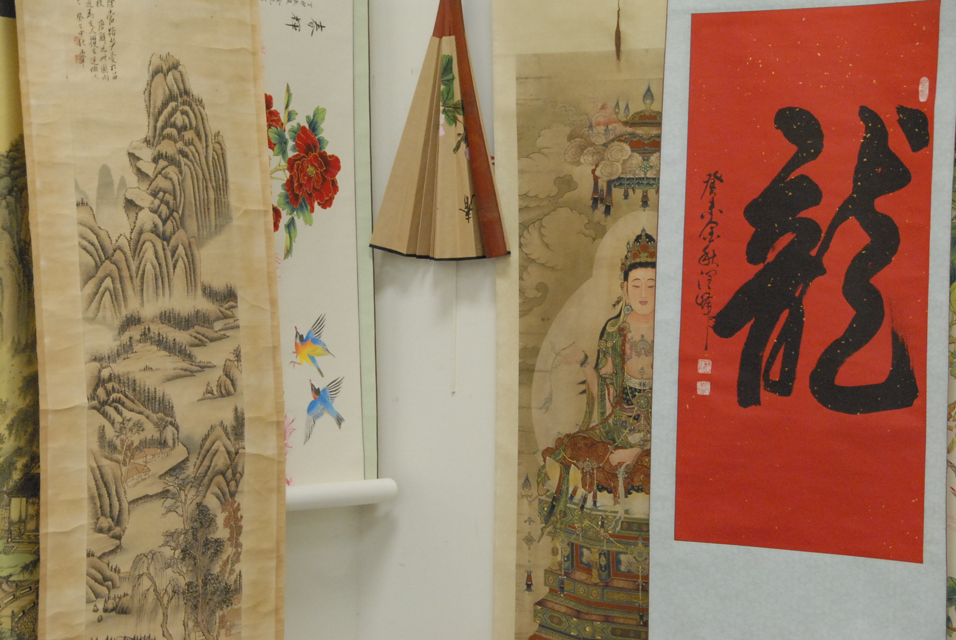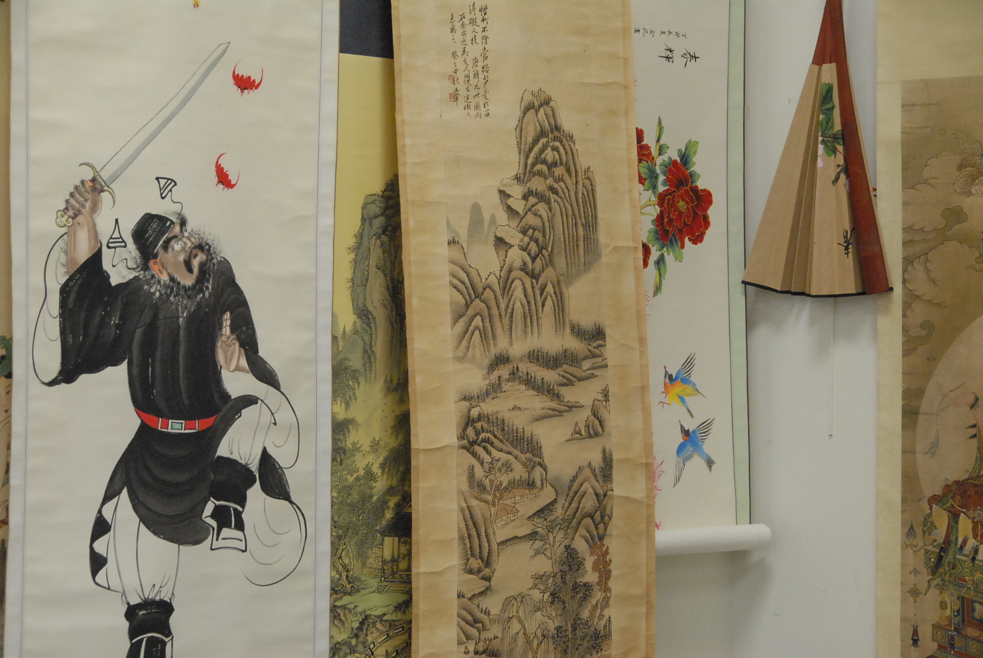 Group lot of Twenty scroll paintings and one painted Oriental fan.