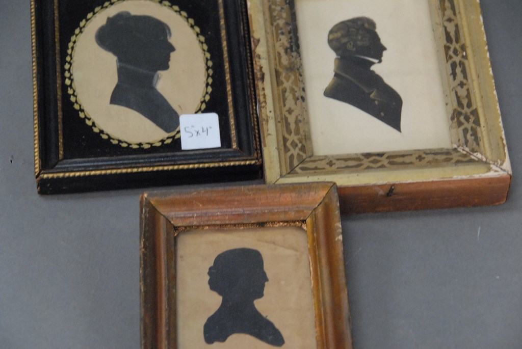 Group of five small silhouettes, two women and two men, one signed M. A. Honeywell, one paper impressed Baches Patent. Provenance: Estate of Nancy Sachse, Hamden, Connecticut 3 1/2 x 3 to 4 x 5