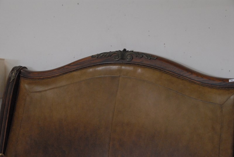 Henredon Louis XVI style king size sleigh bed having leather inset panels in headboard and footboard. ht. 70in. lg. 109in. wd. 86in.
