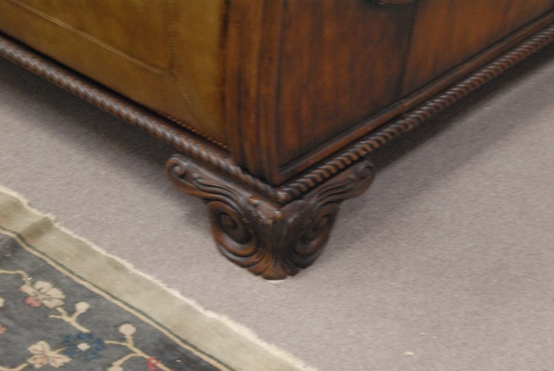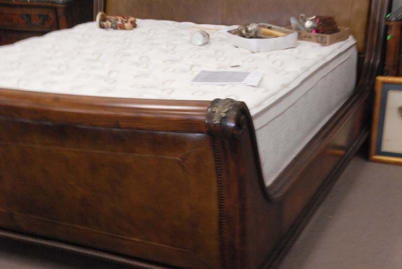 Lot 201: Henredon Louis XVI style king size sleigh bed having leather inset panels in headboard and footboard. ht. 70in. lg. 109in. wd. 86in.