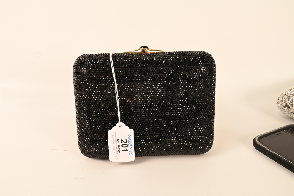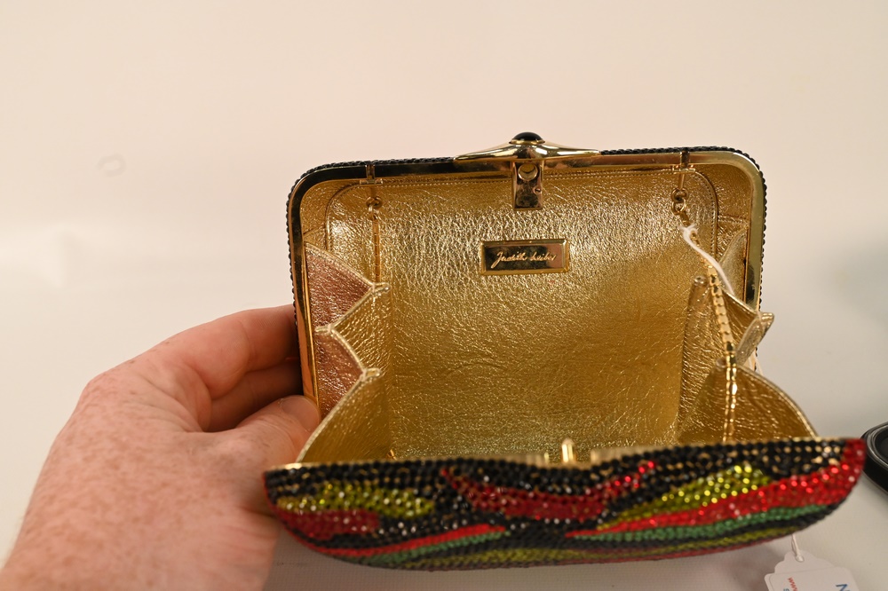 Lot 201: Judith Leiber Clutch Purse, having multicolor jewels and gold interior.