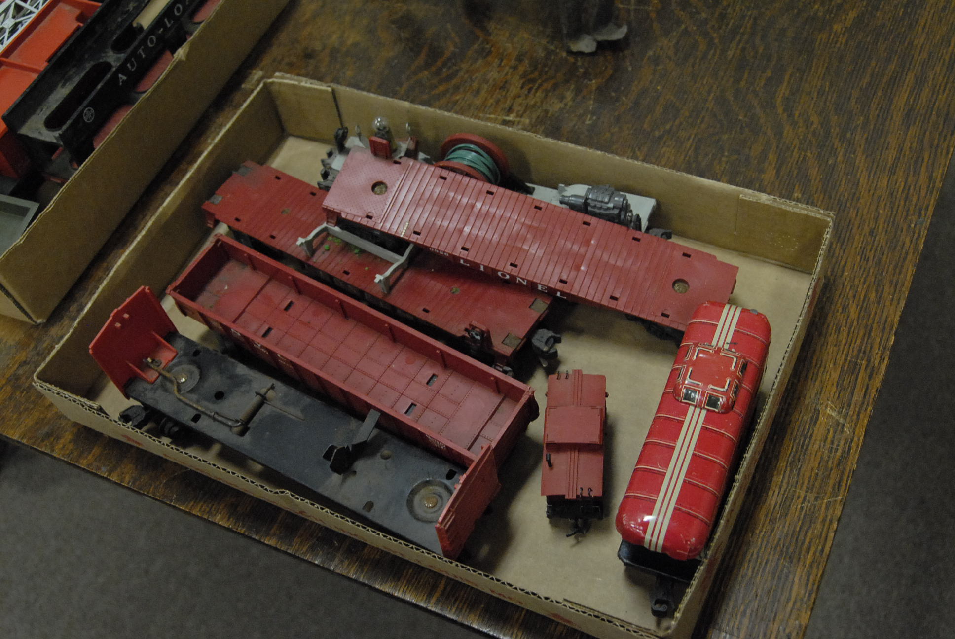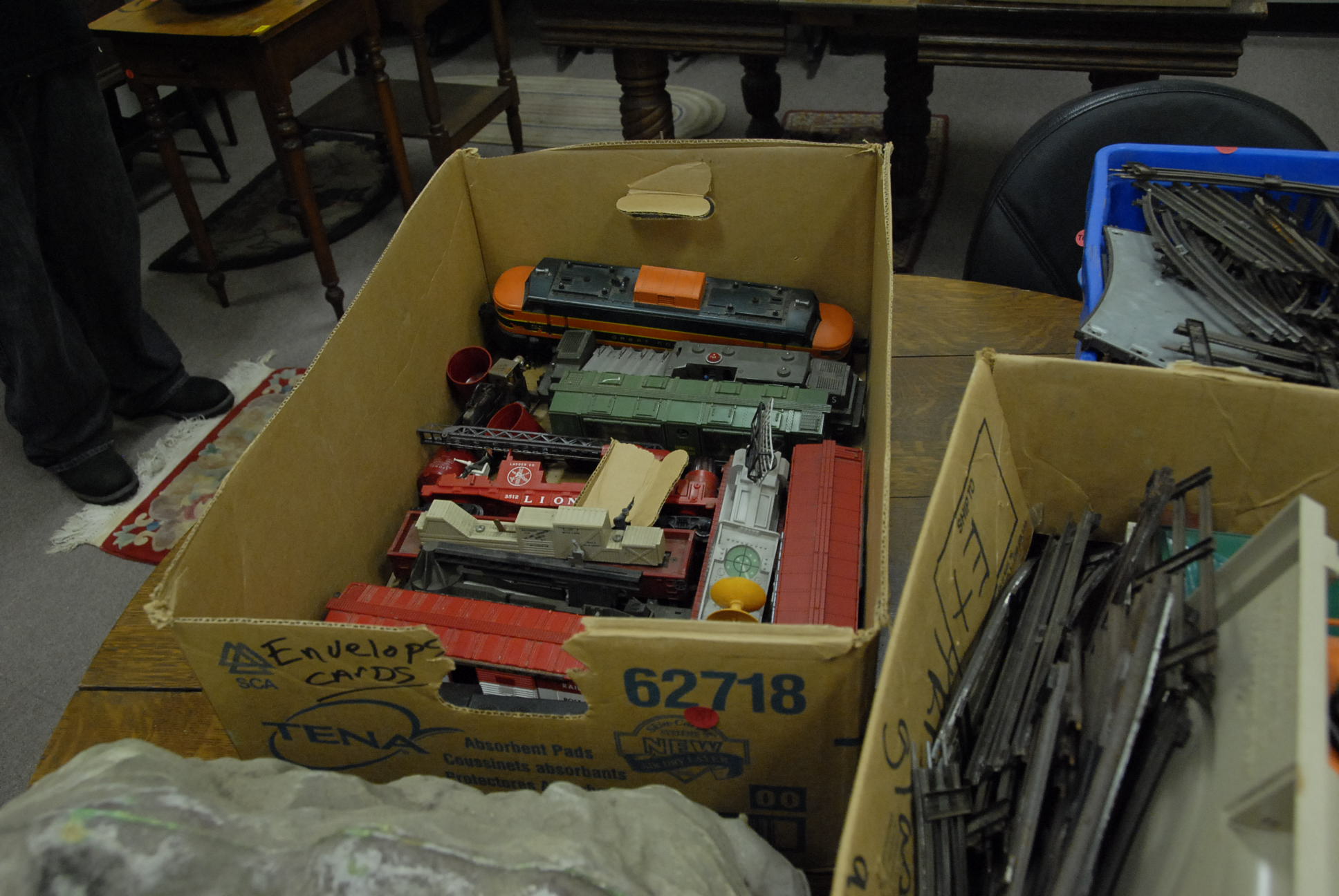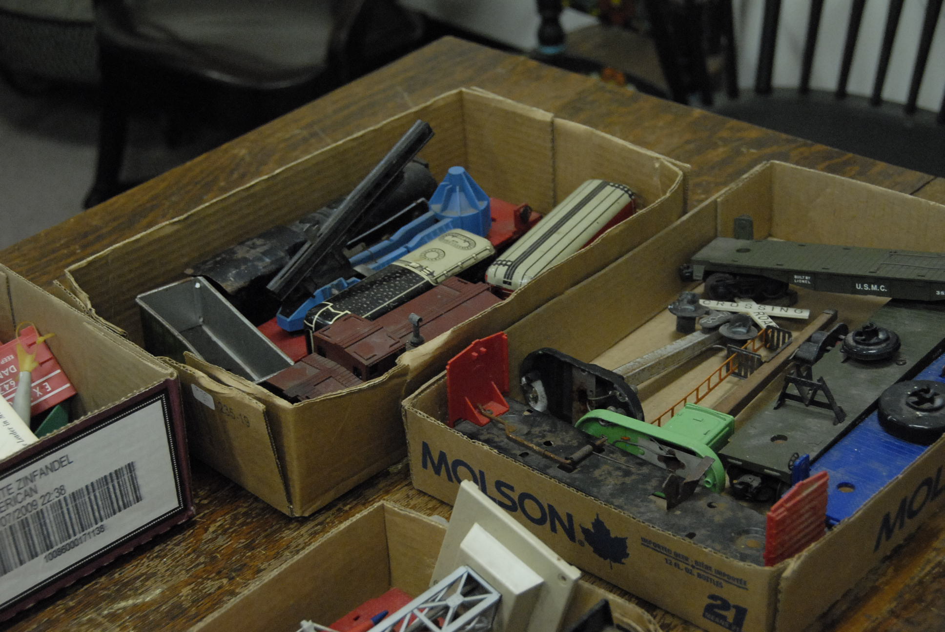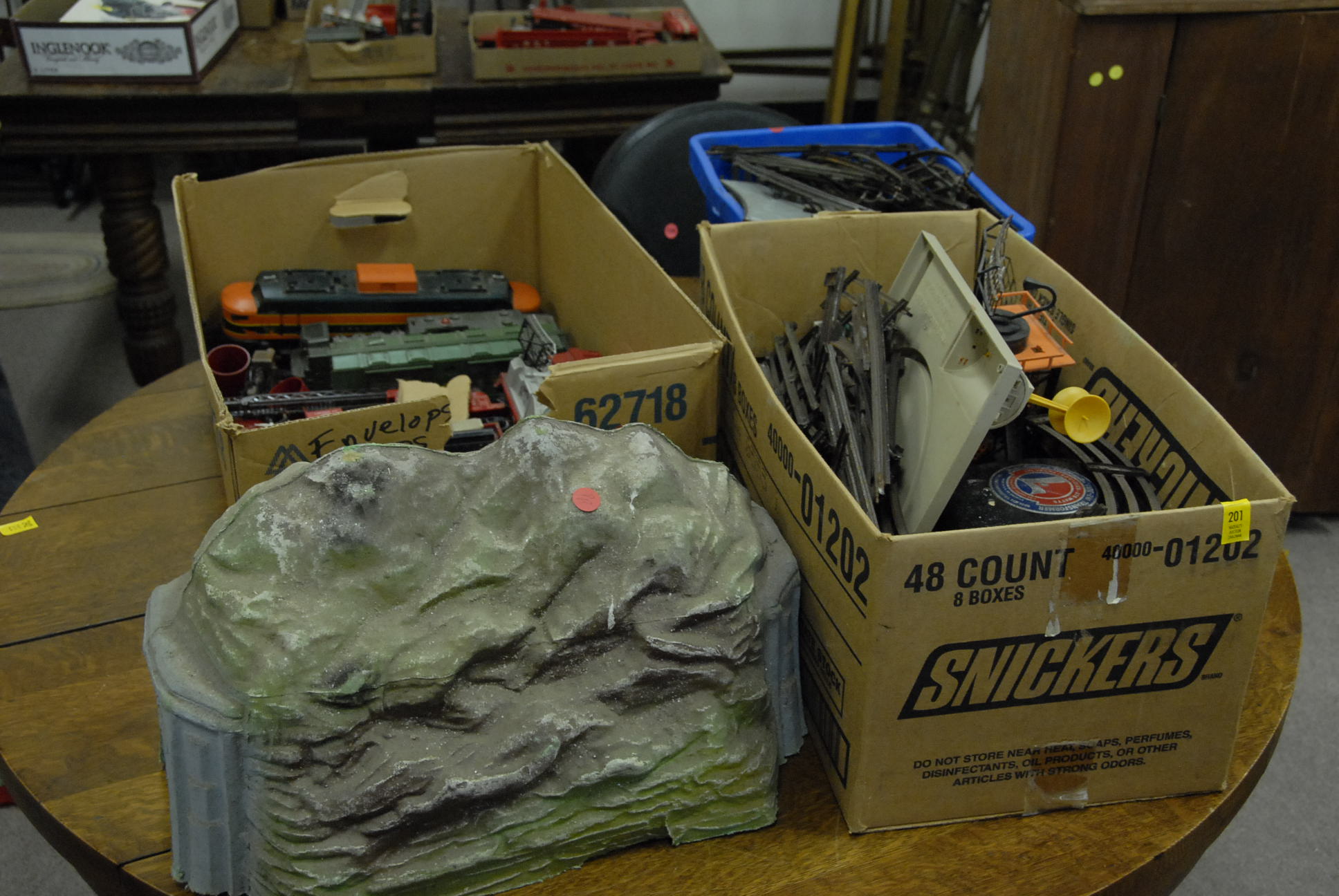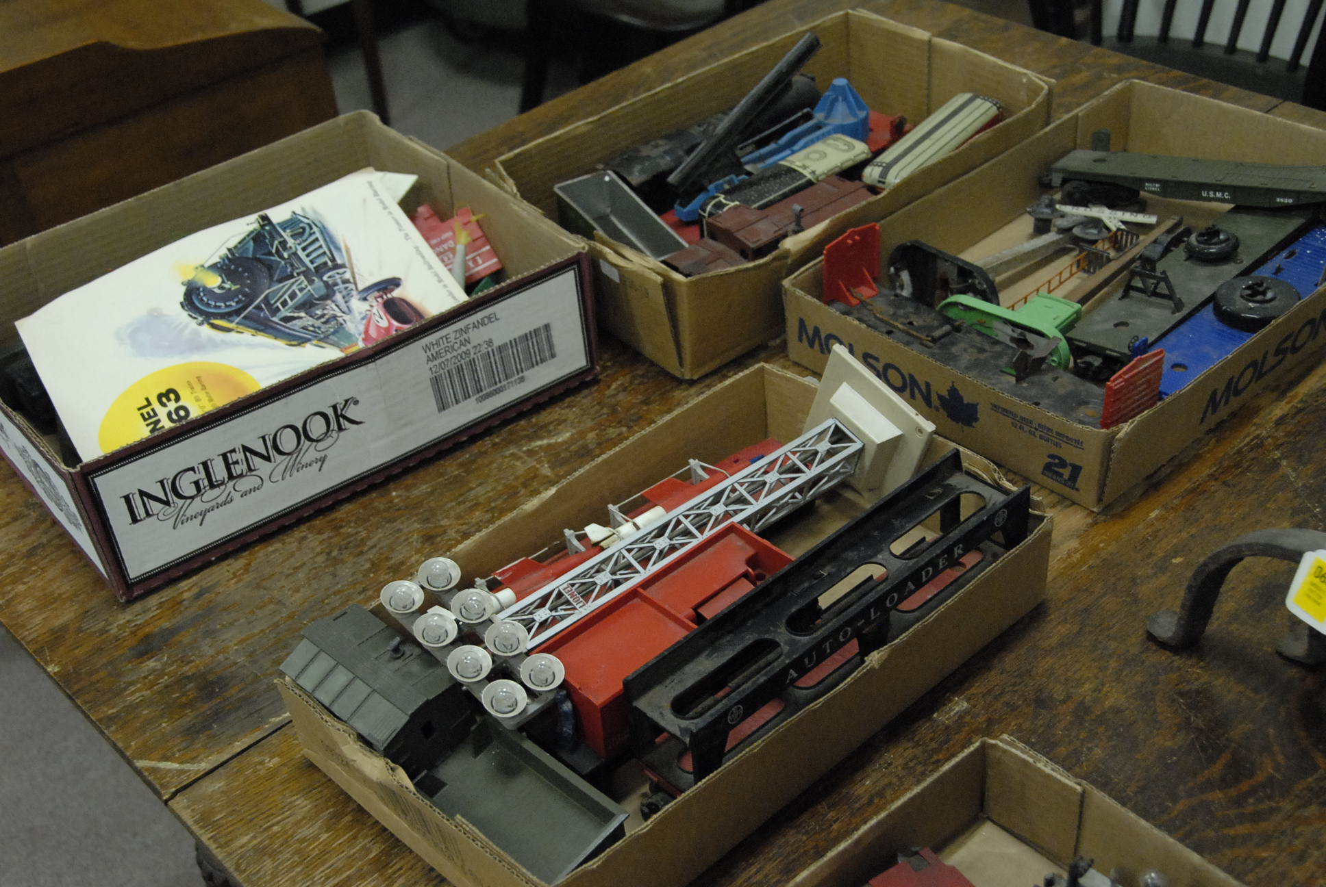Lot to include a wooden crank ringer, six small baskets, primitive wooden parts, a blue and white bowl, some toleware molds, three stoneware jugs , two of which are made into lamps.