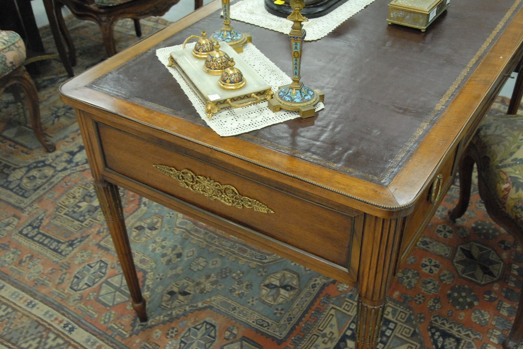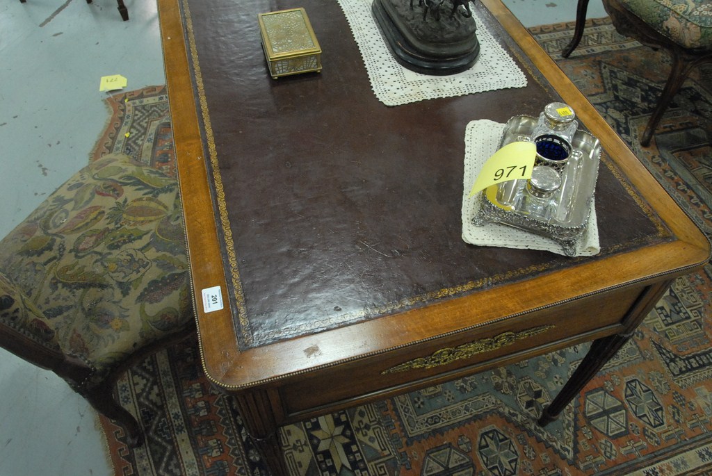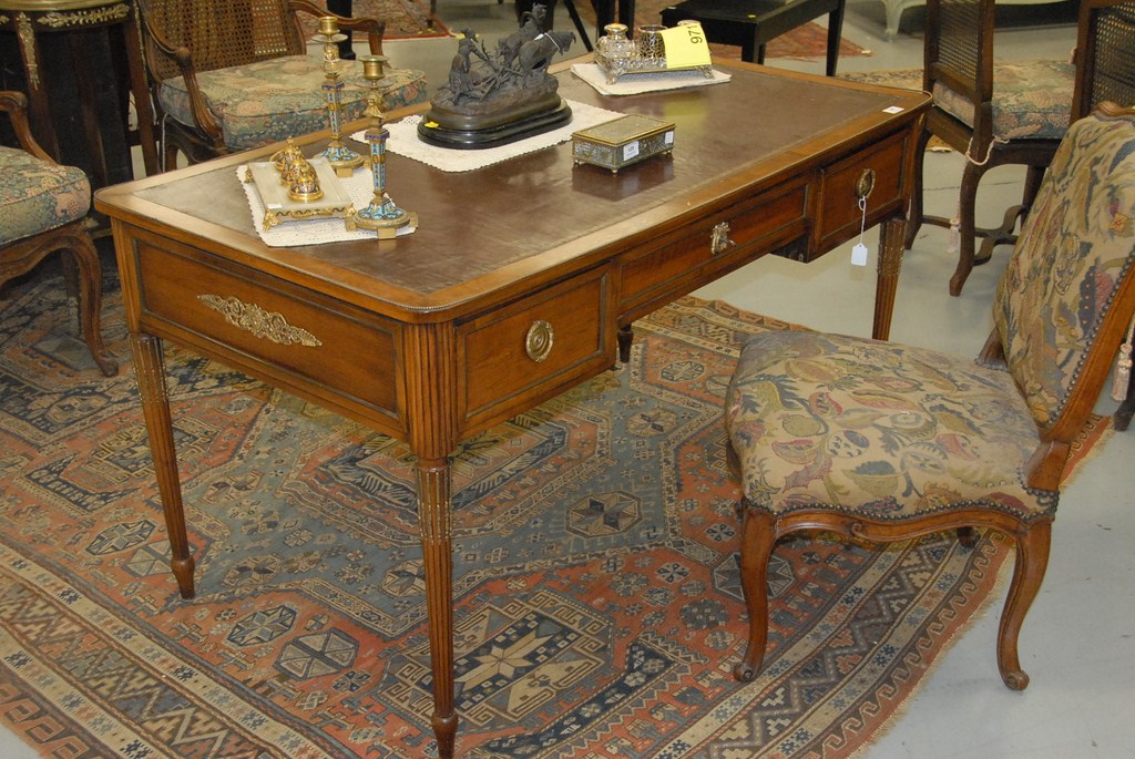 Lot 201: Louis XVI style walnut bureau plat with rectangular top and tooled burgundy leather inset above three drawers all set on turned and …