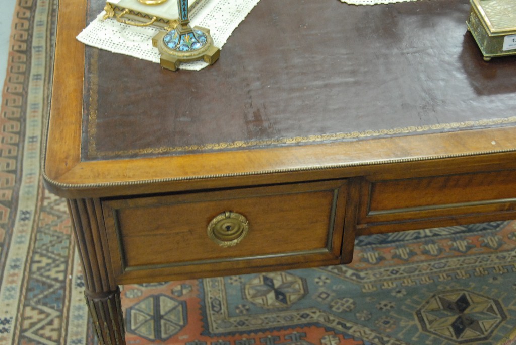 Louis XVI style walnut bureau plat with rectangular top and tooled burgundy leather inset above three drawers all set on turned and fluted legs with brass mounts and trim, probably 19th century. ht. 30in. wd. 55in. dp. 29 1/2in.