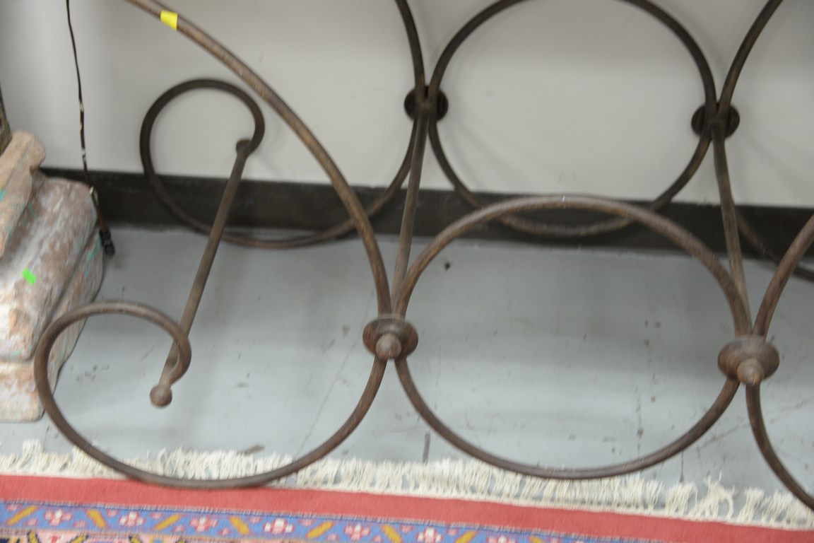 Marble top hall table with iron base marble has corner chip. ht. 31 1/2 in. top: 25 x 53.