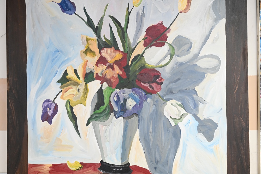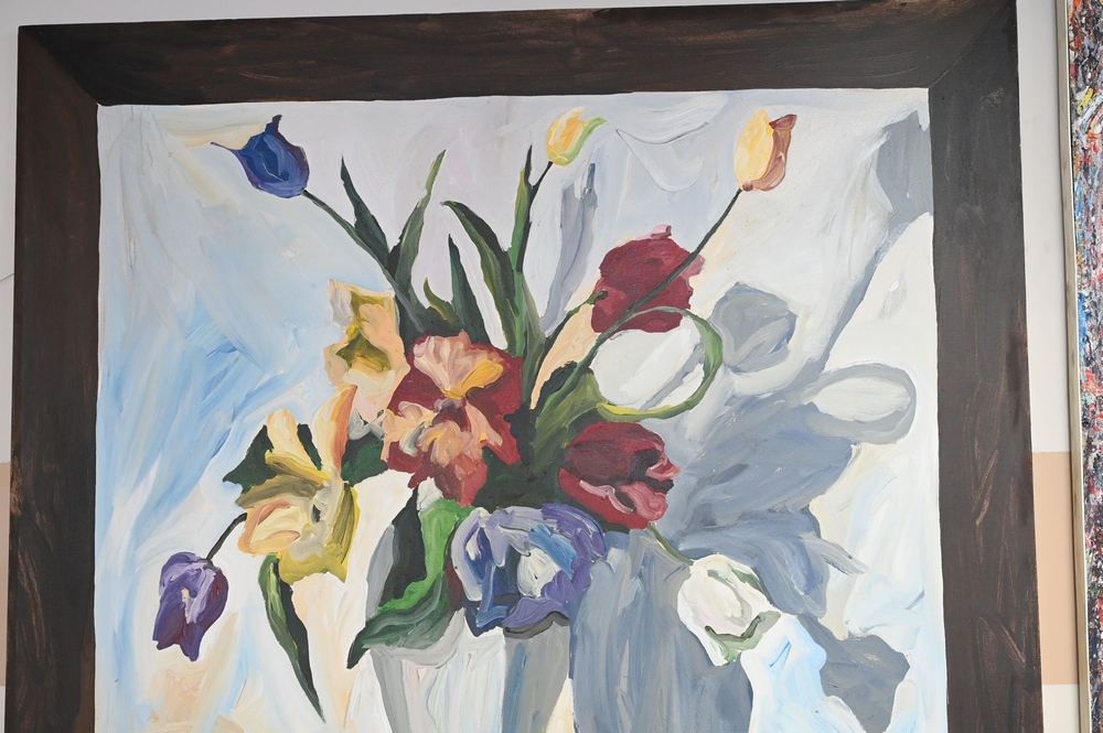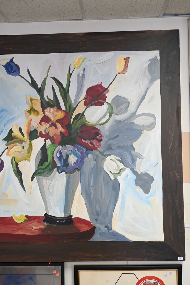 Michael Howard, Untitled (Flowers), 1976, acrylic on canvas, unsigned, remnants of old labels, frame size 71″ x 71″ x 2″.