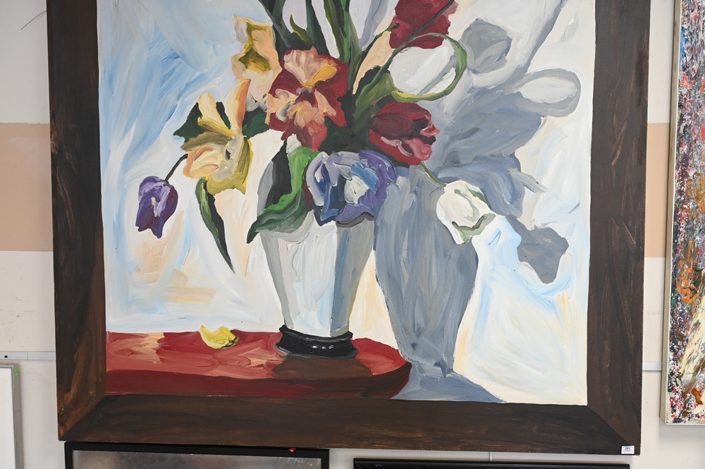 Lot 201: Michael Howard, Untitled (Flowers), 1976, acrylic on canvas, unsigned, remnants of old labels, frame size 71″ x 71″ x 2″.