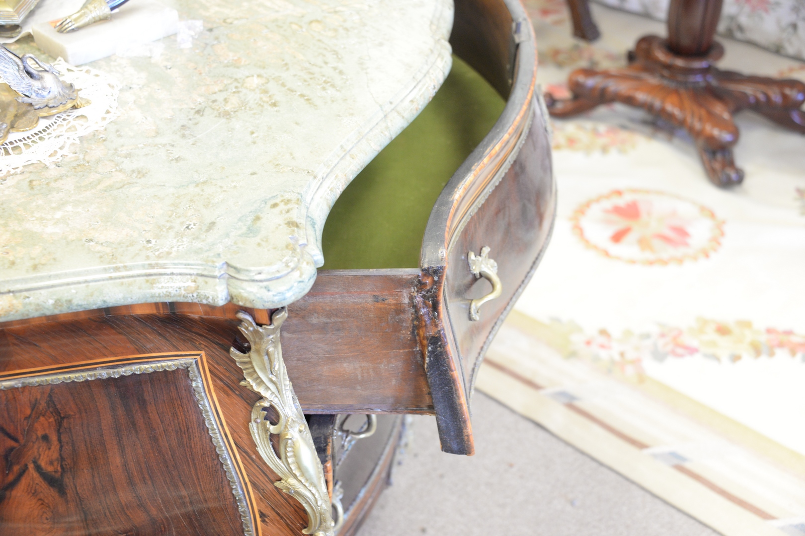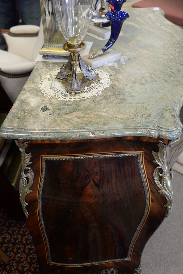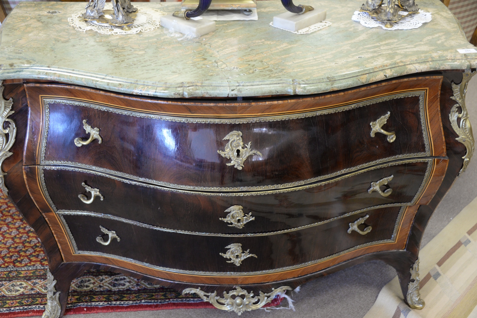 Lot 201: Northern European Bombe Commode, mahogany and rosewood veneered, ormolu mounted with marble top, variegated green marble top possibl…