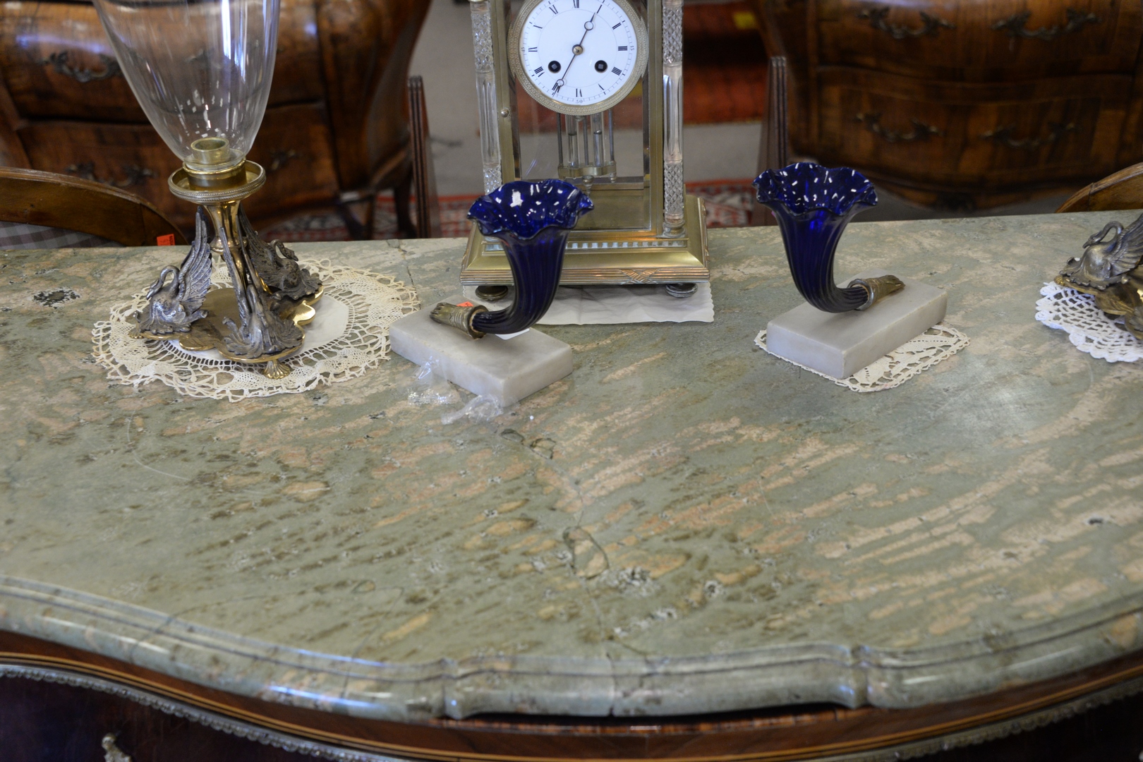 breaks to marble, splits and repairs to veneer, height 33 1/4 inches, width 50 inches, depth 26 inches.