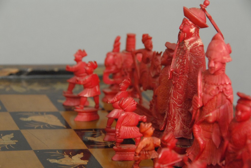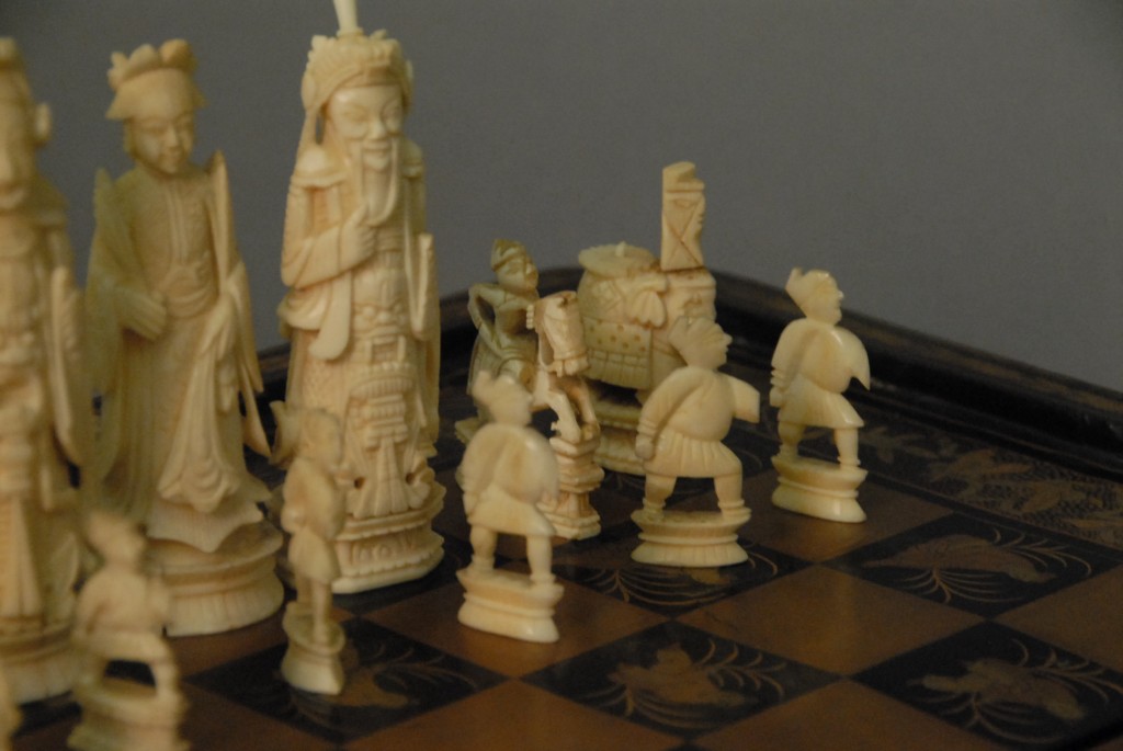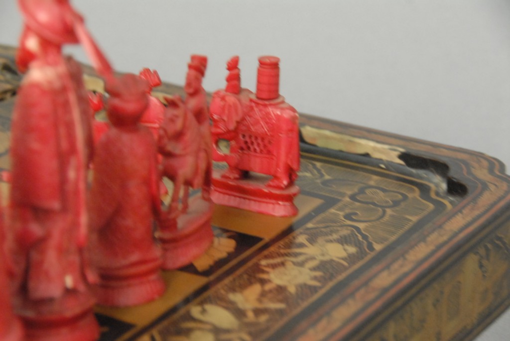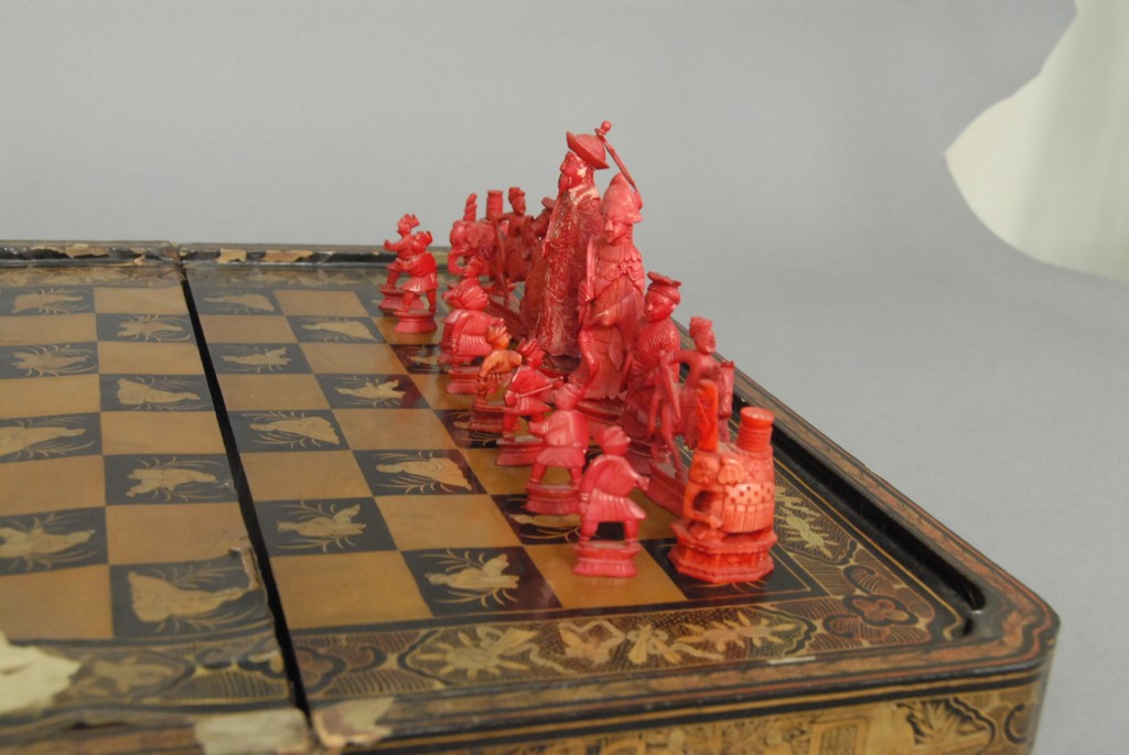 Oriental ivory chess set with lacquered game board, 16 red pieces, and 16 white pieces missing some parts.
