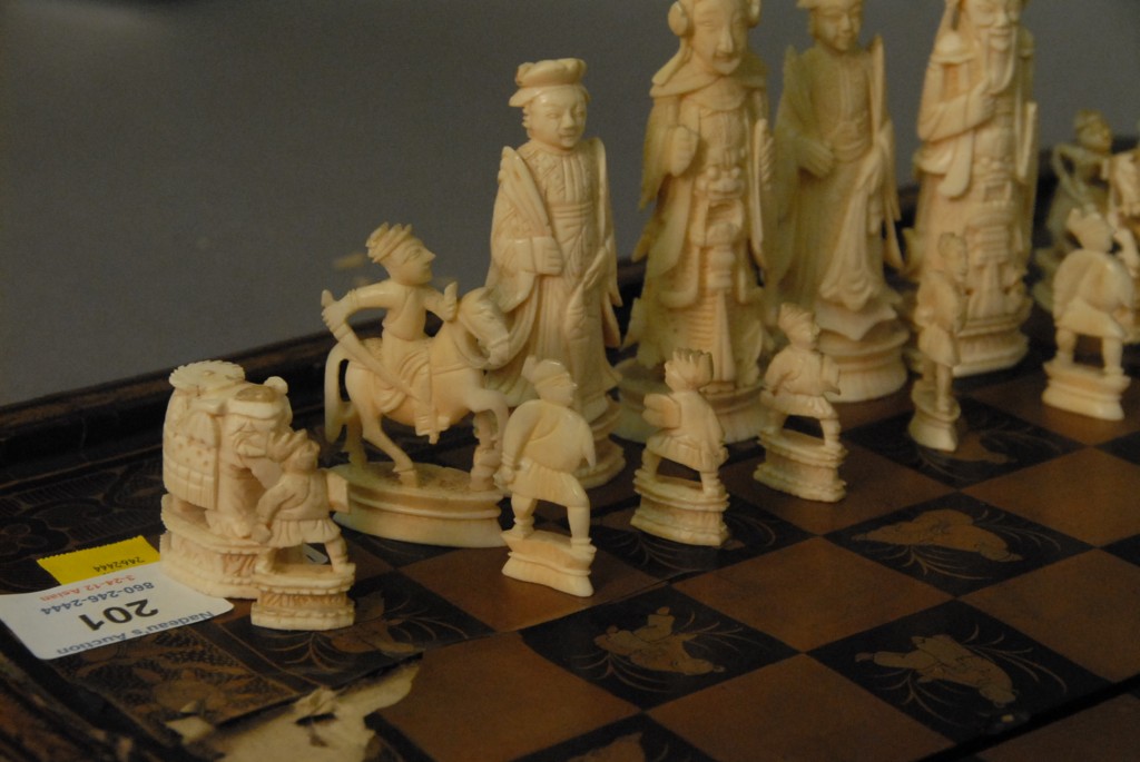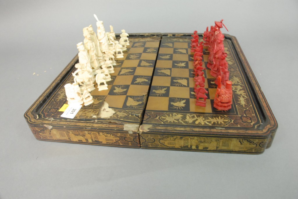 Lot 201: Oriental ivory chess set with lacquered game board, 16 red pieces, and 16 white pieces missing some parts.