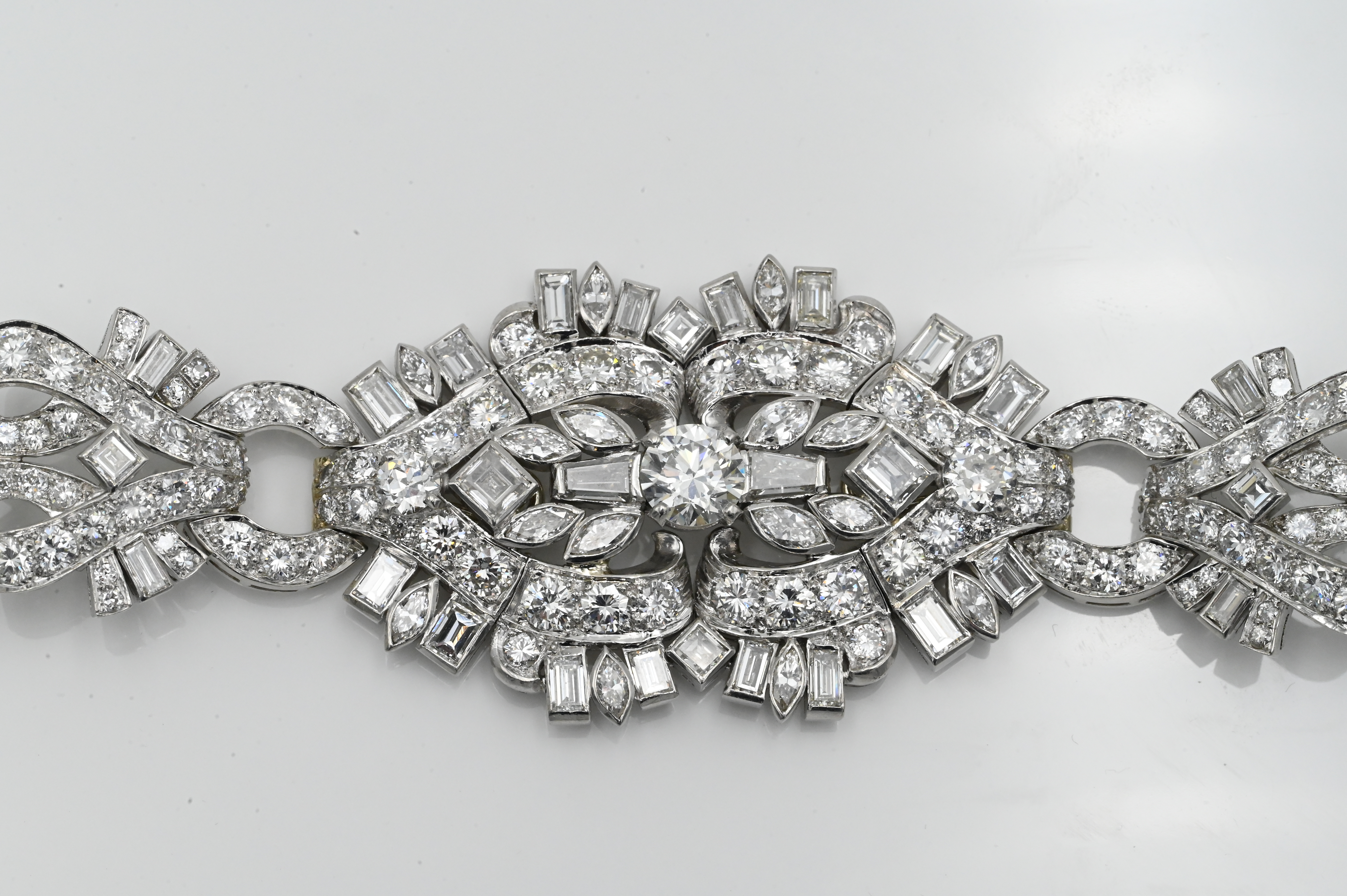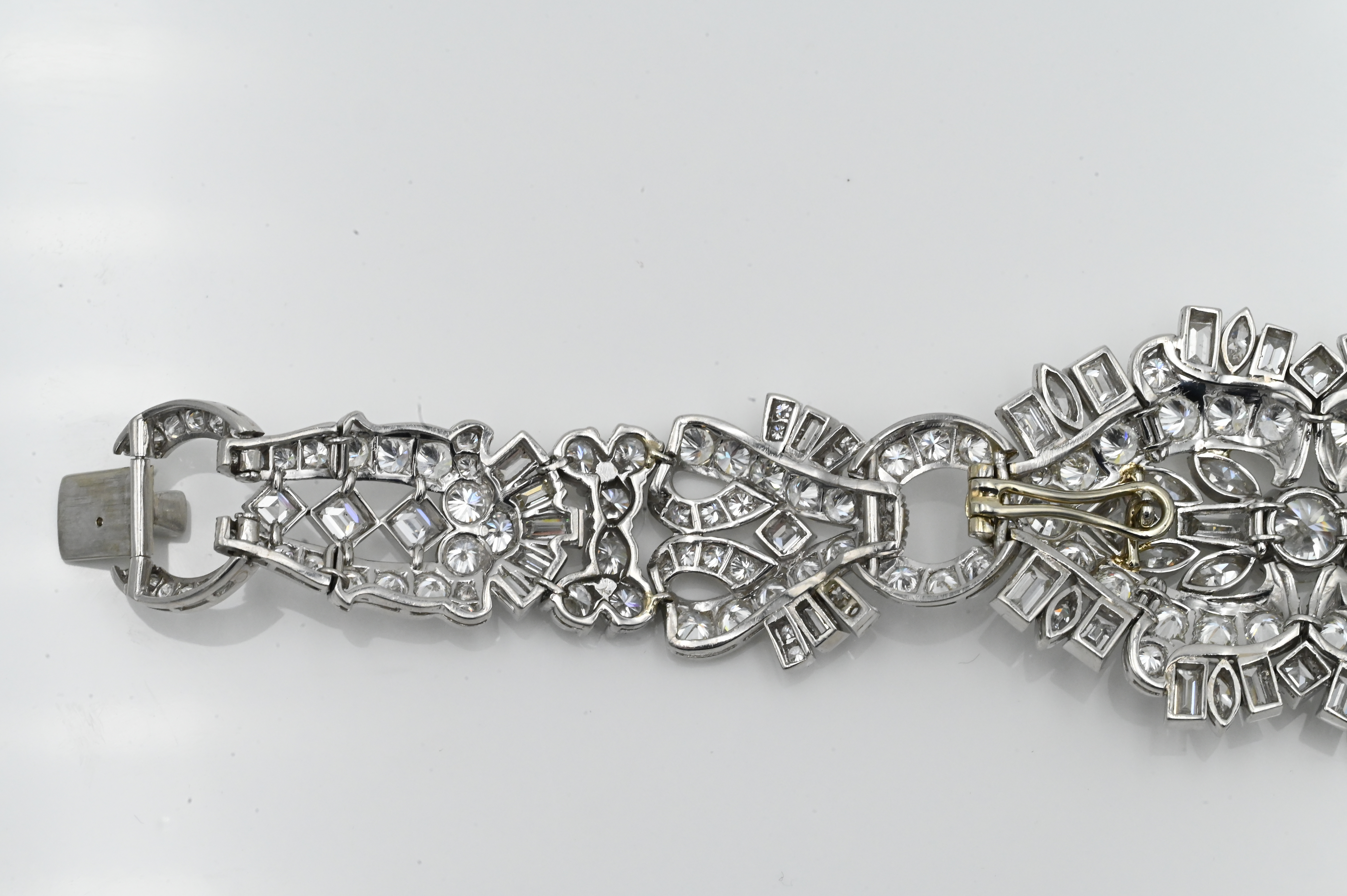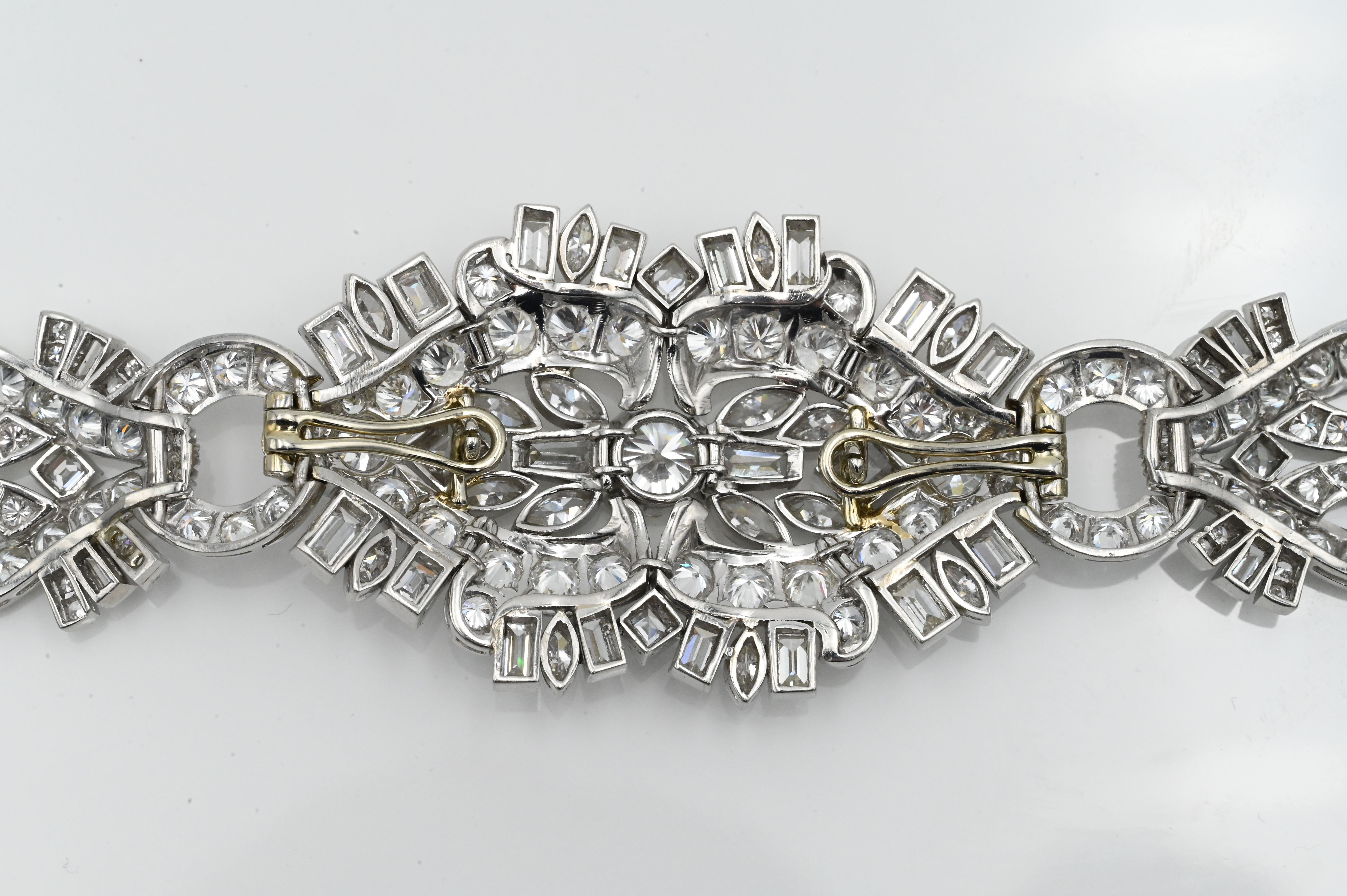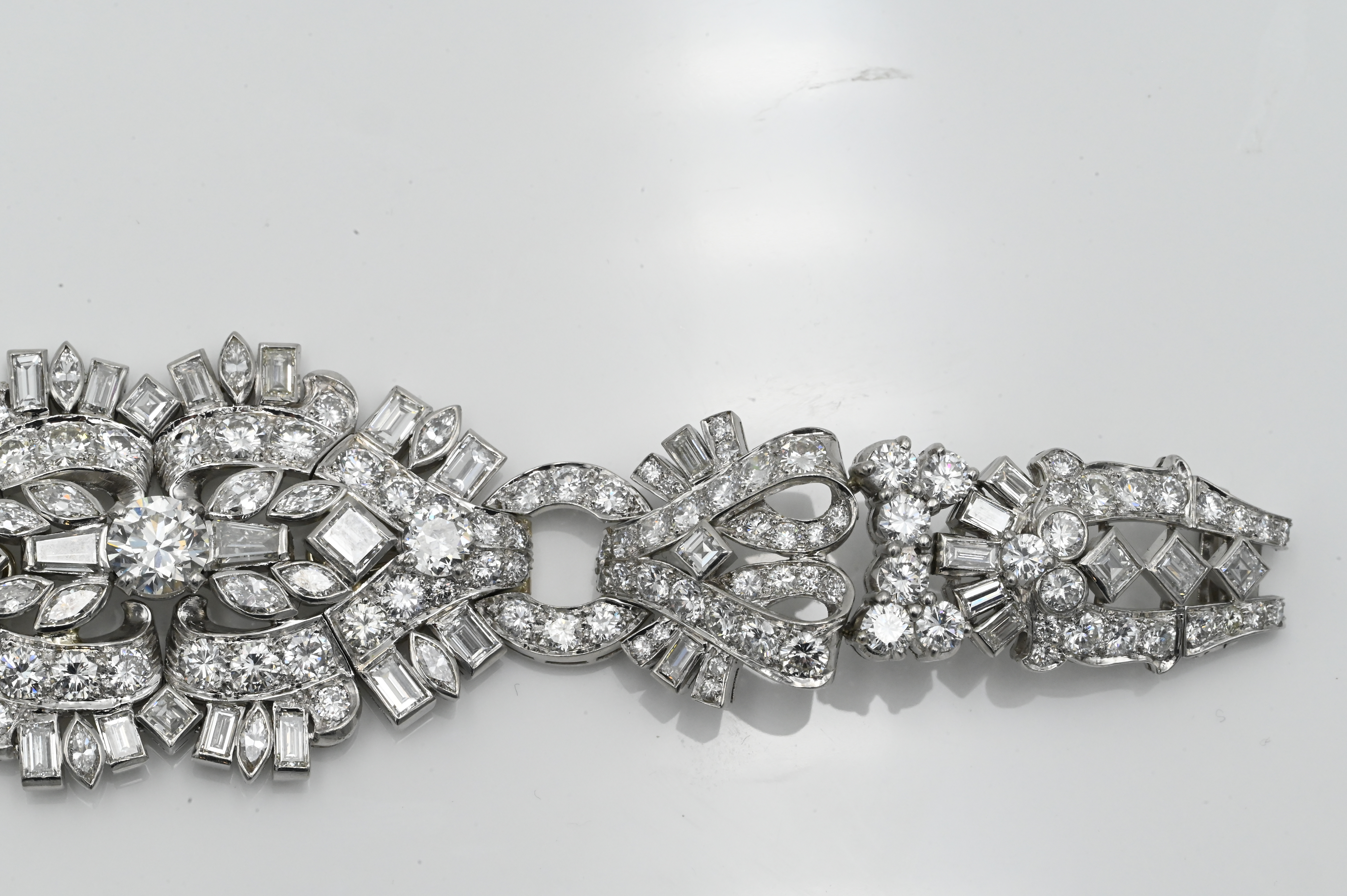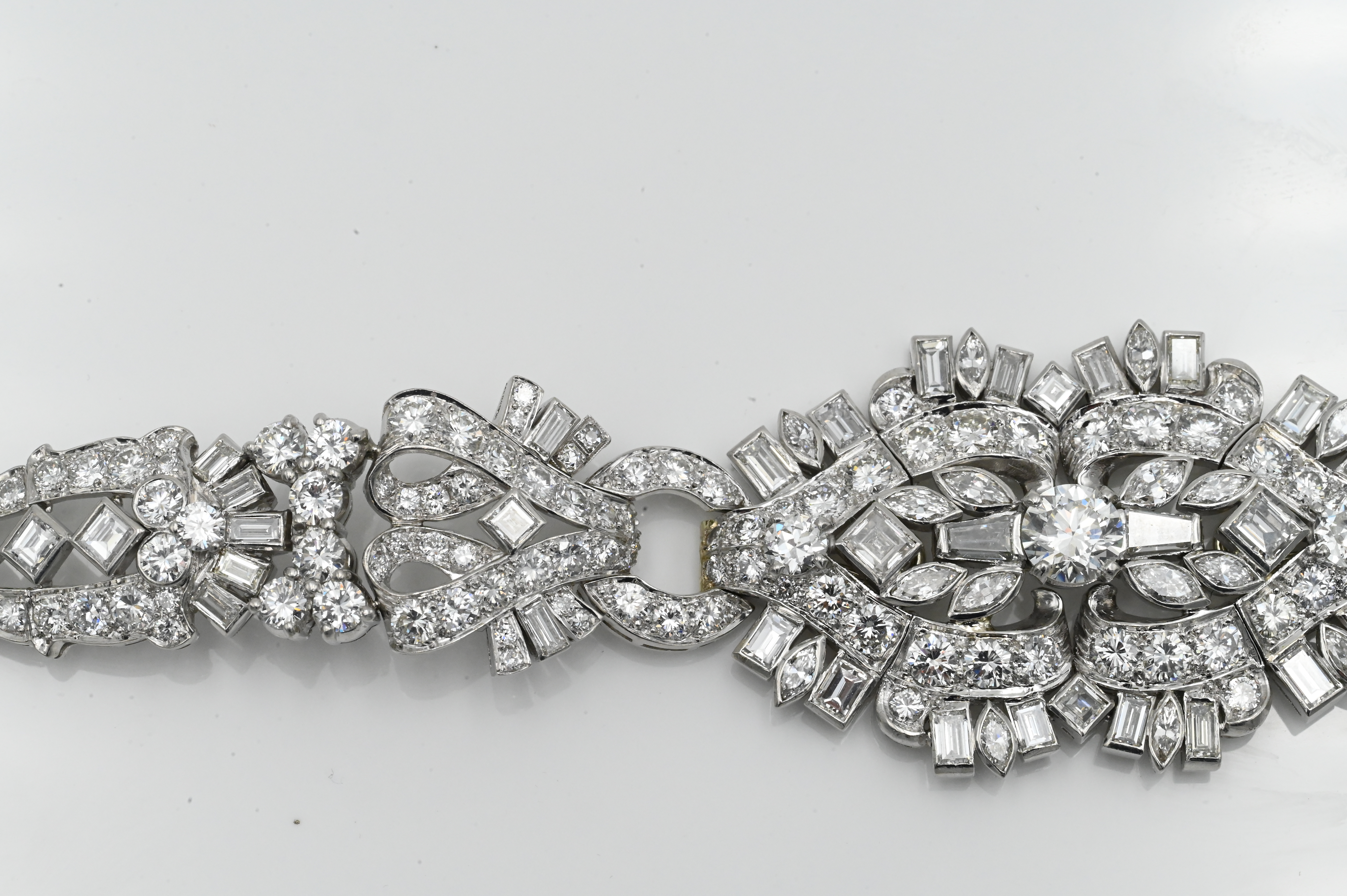 Bracelet is convertible Art Deco style, the center section of the bracelet is removable from the bracelet, The middle link is set with one round diamond in center weighing approximately 1.54 carats by formula. The diamond has G-I color and VS clarity. This diamond is flanked by 1 tapered baguette on each side with an approximate total carat weight of .25 by formula. There are another 4 marquise cut diamonds on each side with an approximate total carat weight of 1.28 by formula and 1 square cut diamond on each side with an approximate carat weight of .45 each. Surrounding those diamonds is another 34 round diamonds 20 of which have an approximately total carat weight of 2.40 by formula, 12 have an approximate total carat weight of .36 by formula and 2 are approximately .70 total carat weight. The outer ring of this link is set with 8 marquise cut diamonds with an approximate total carat weight of .60 by formula, 2 square cut with an approximate total carat weight of .20 by formula, 16 baguette cut with an approximate total carat weight of 2.60 by formula and 4 round diamonds with an approximate total carat weight of .36 by formula.