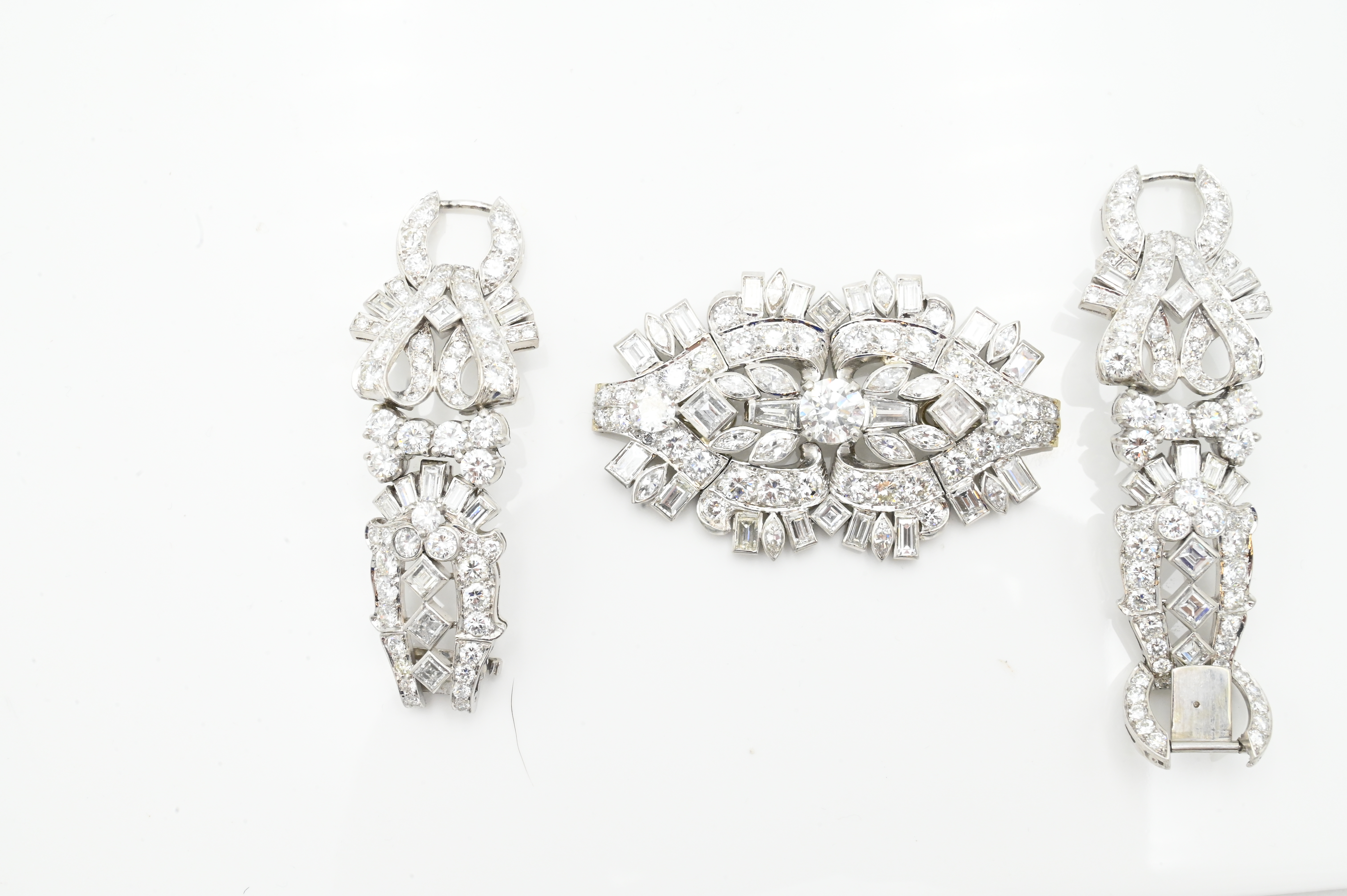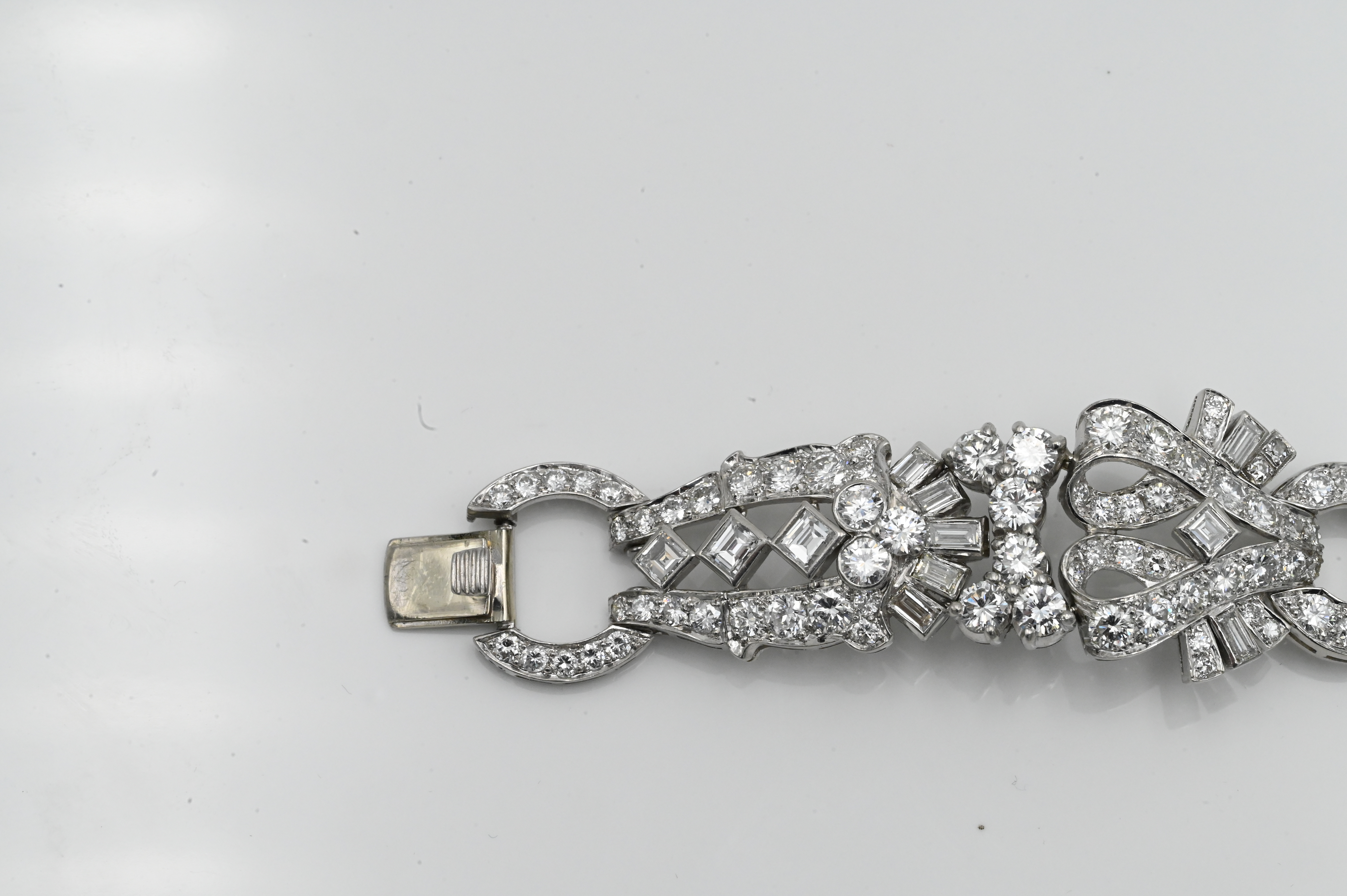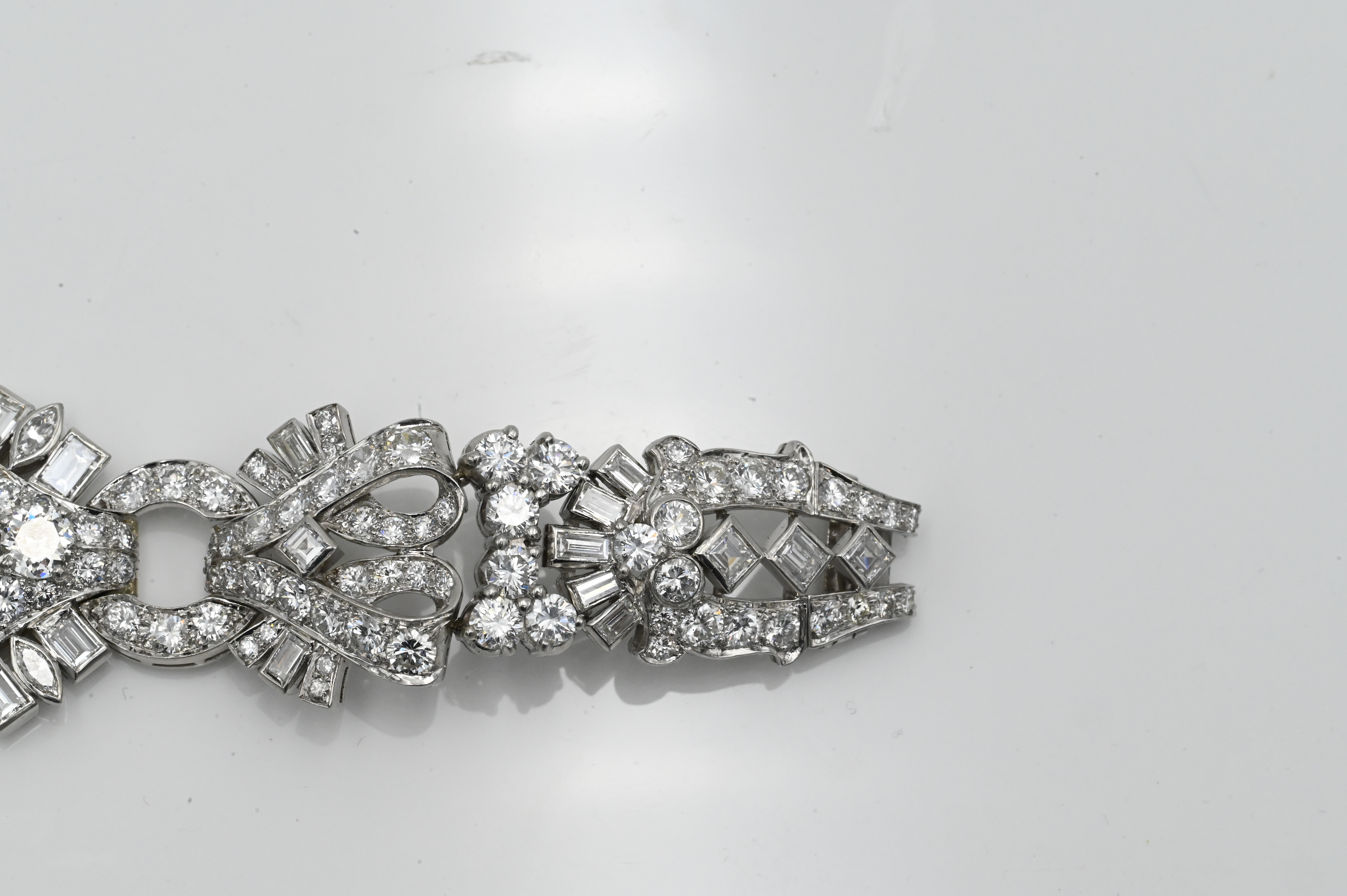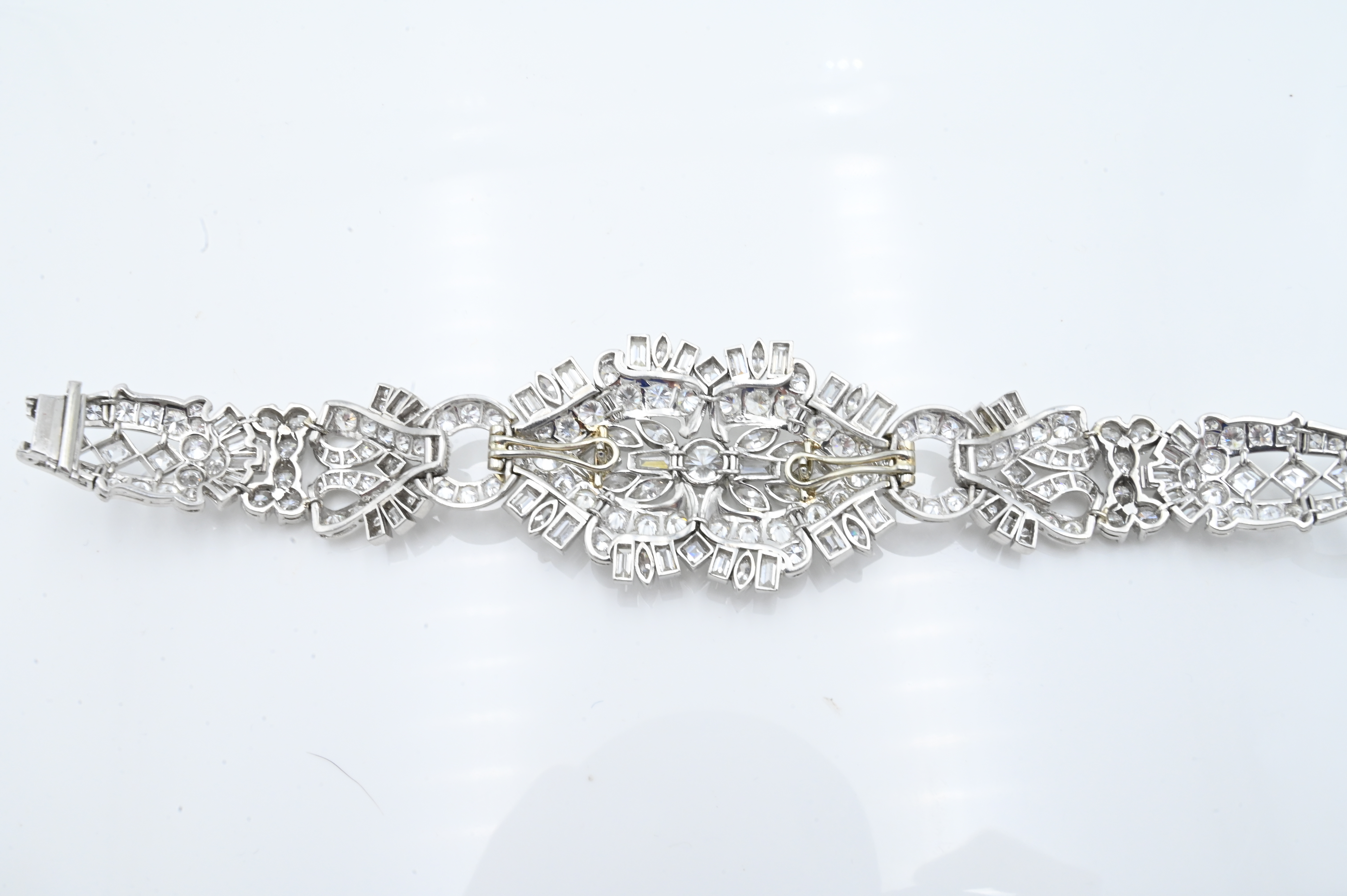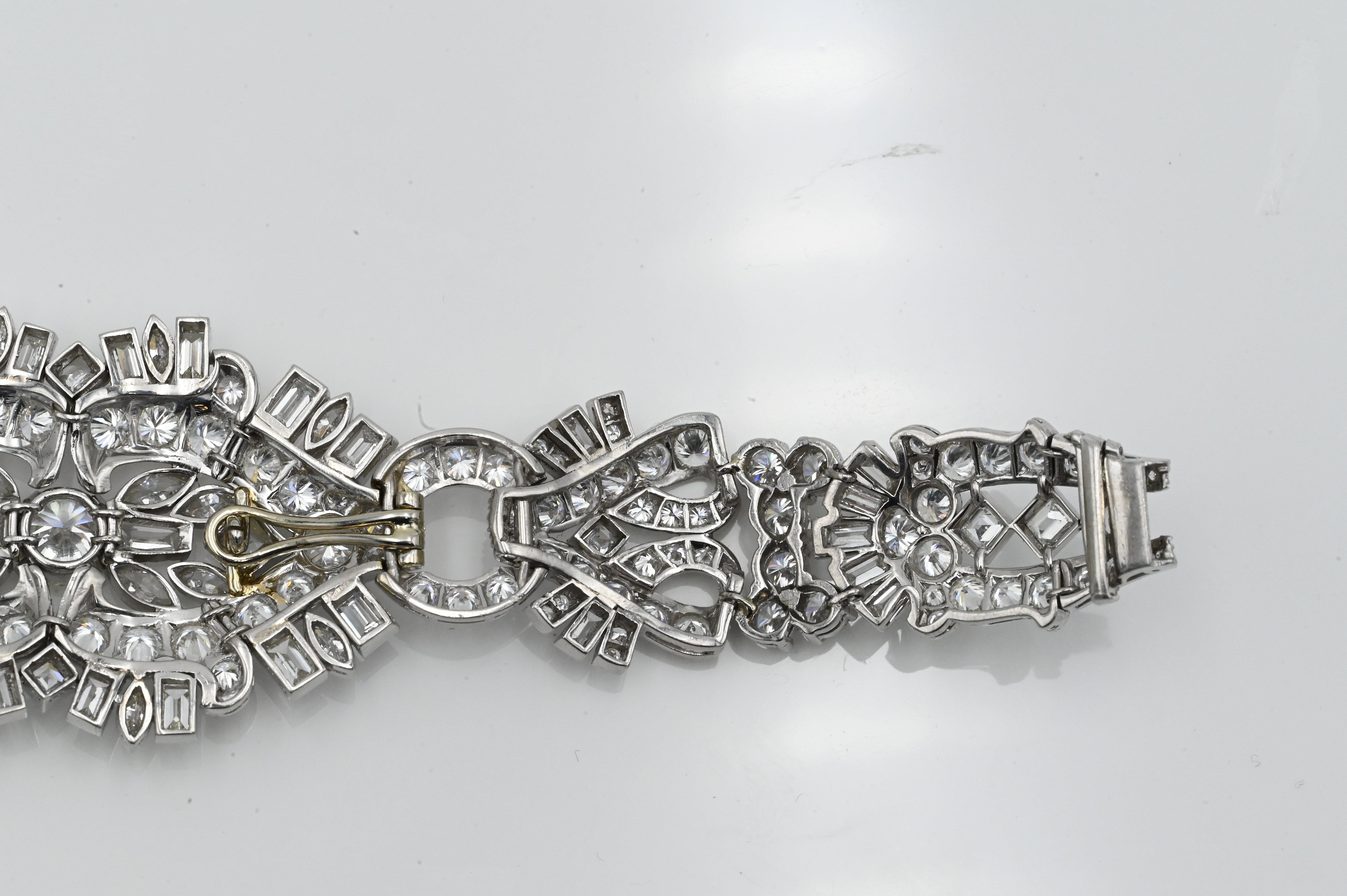 Bracelet is convertible Art Deco style, the center section of the bracelet is removable from the bracelet, The middle link is set with one round diamond in center weighing approximately 1.54 carats by formula. The diamond has G-I color and VS clarity. This diamond is flanked by 1 tapered baguette on each side with an approximate total carat weight of .25 by formula. There are another 4 marquise cut diamonds on each side with an approximate total carat weight of 1.28 by formula and 1 square cut diamond on each side with an approximate carat weight of .45 each. Surrounding those diamonds is another 34 round diamonds 20 of which have an approximately total carat weight of 2.40 by formula, 12 have an approximate total carat weight of .36 by formula and 2 are approximately .70 total carat weight. The outer ring of this link is set with 8 marquise cut diamonds with an approximate total carat weight of .60 by formula, 2 square cut with an approximate total carat weight of .20 by formula, 16 baguette cut with an approximate total carat weight of 2.60 by formula and 4 round diamonds with an approximate total carat weight of .36 by formula.