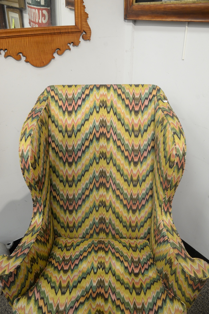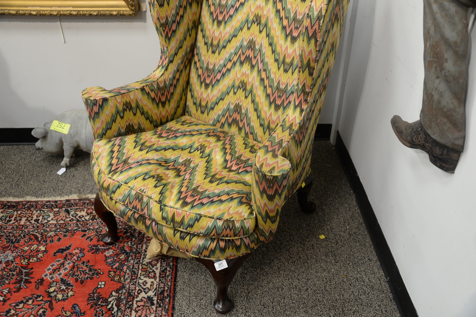 Lot 201: Queen Anne Upholstered Wing Chair having rolled out arms with cones and flame stitch style upholstery, all set on 4 cabriole legs ending in pad feet, circa 1740, height 43 inches, width 34 inches.