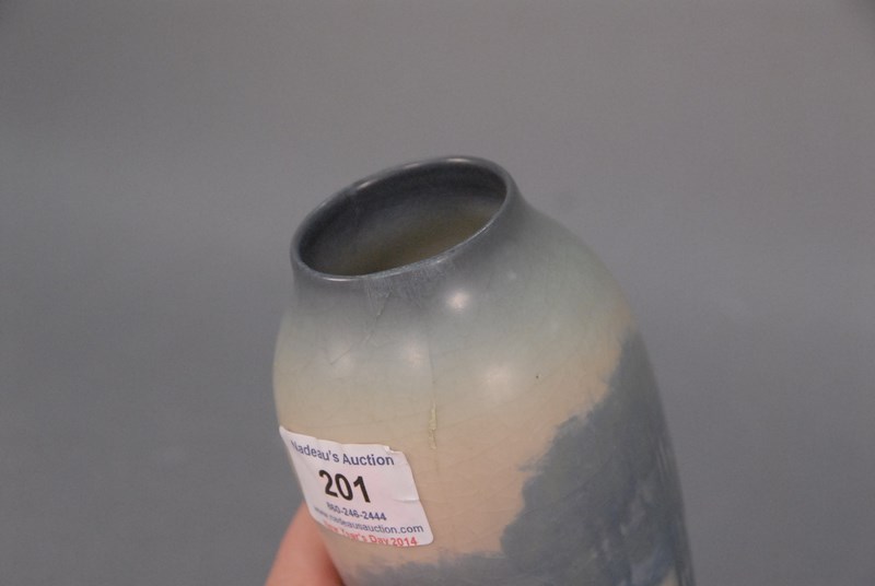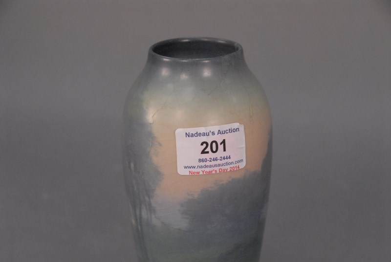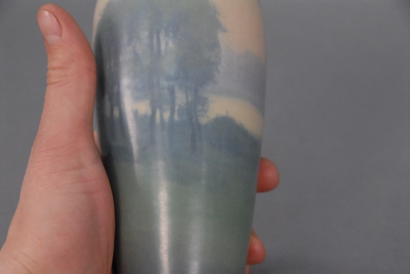 Rookwood scenic vase 295E, 1921 vellum glaze repairs. ht. 7 1/2in.